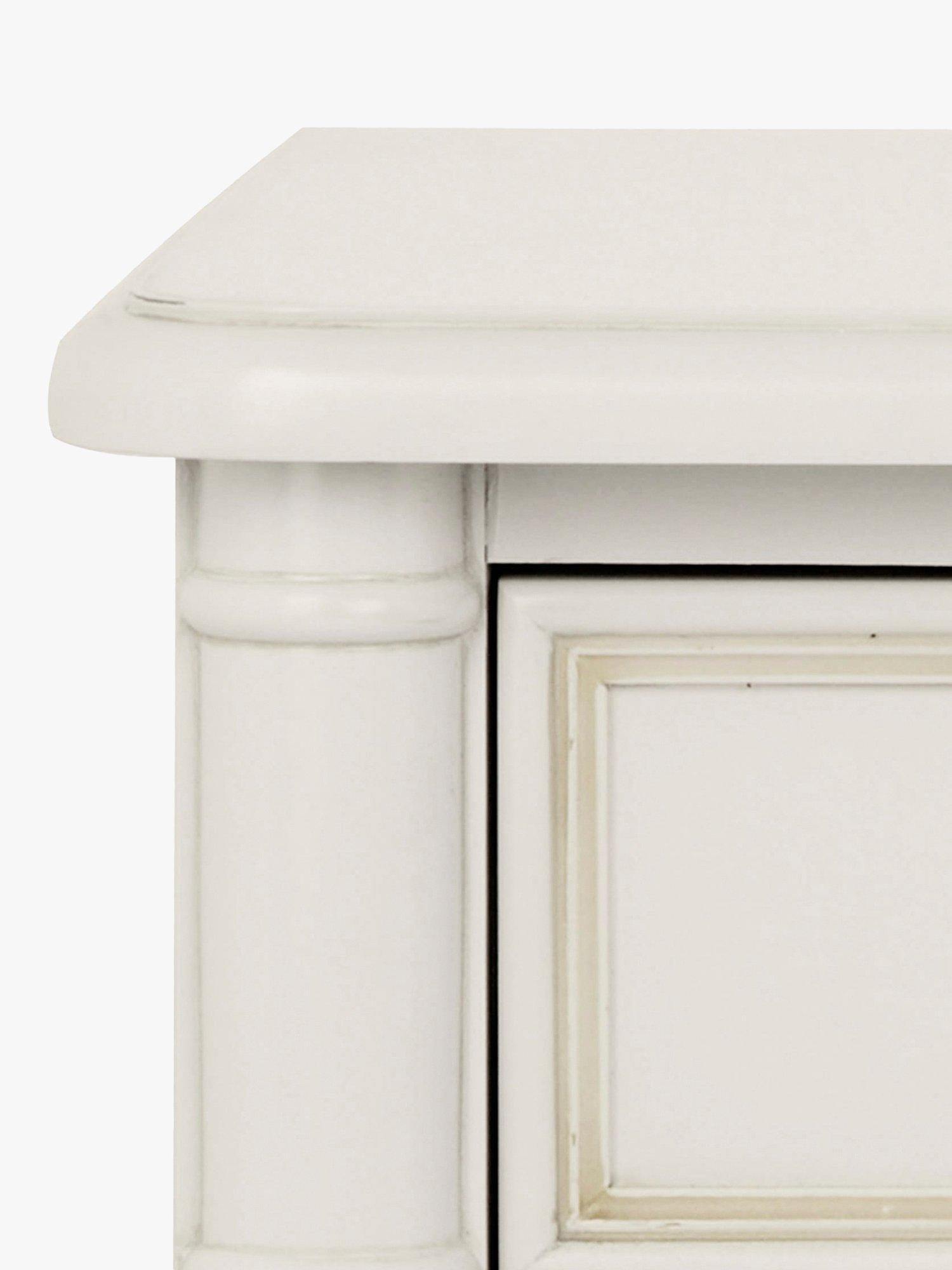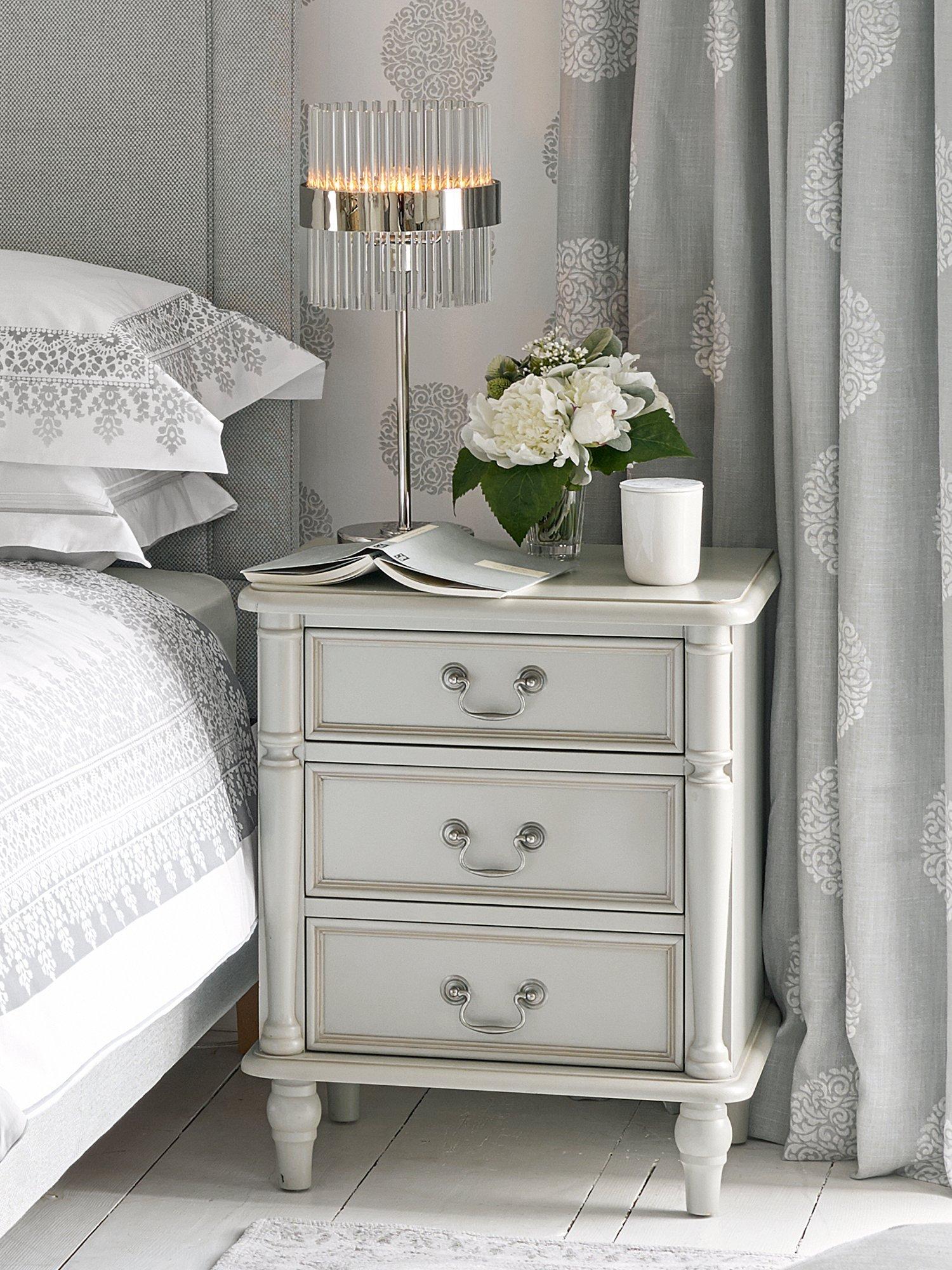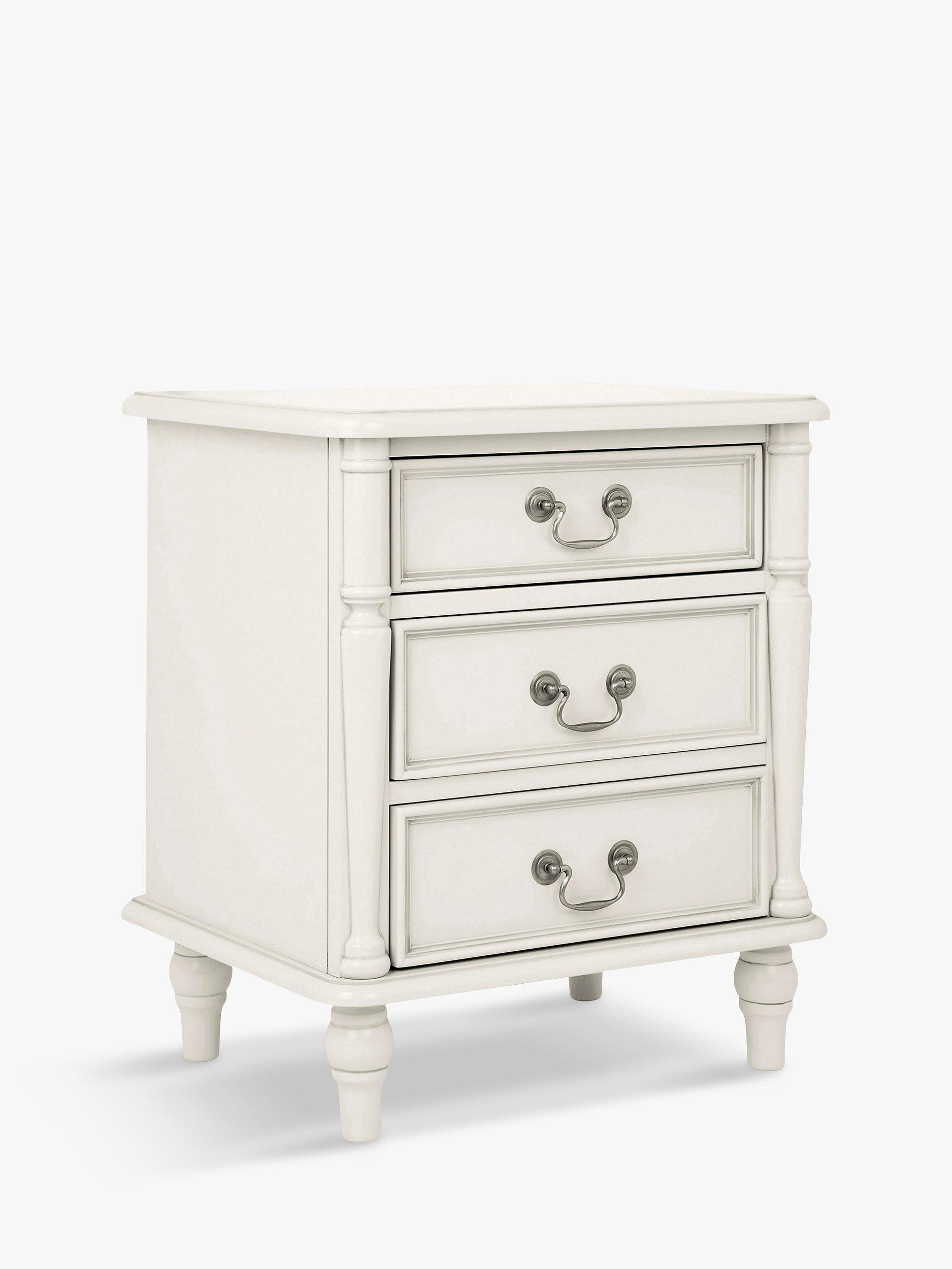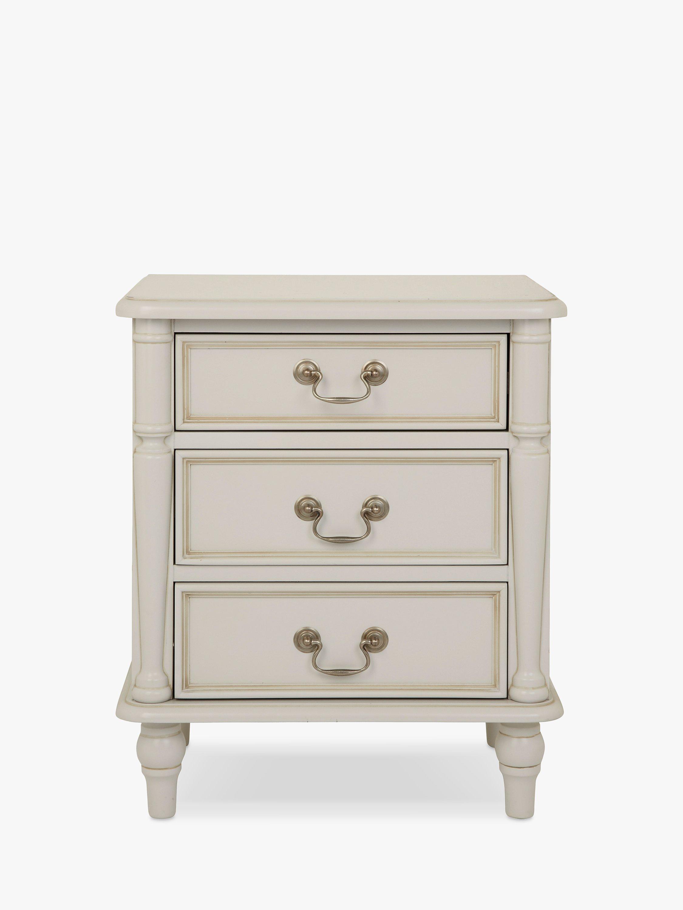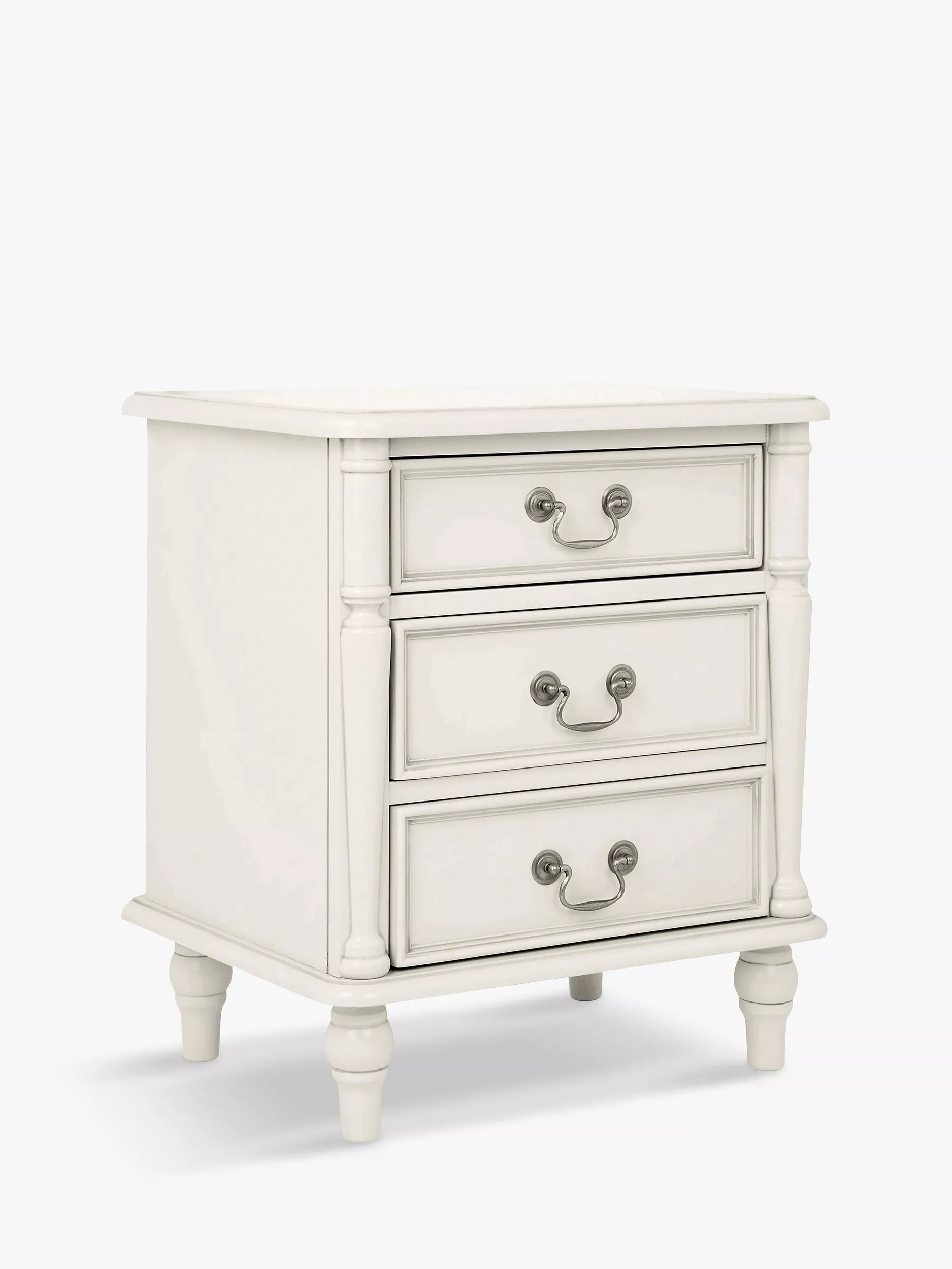 Turned wooden legs and panelling detail honours the timeless aesthetic of this bedside table, which is made from sturdy timbers and features three spacious drawers. The perfect size to keep all your bedside bits and bobs nearby, it's painted and finished with a hand-applied patina to create an aged effect, and antique-style handles complete its classic look.