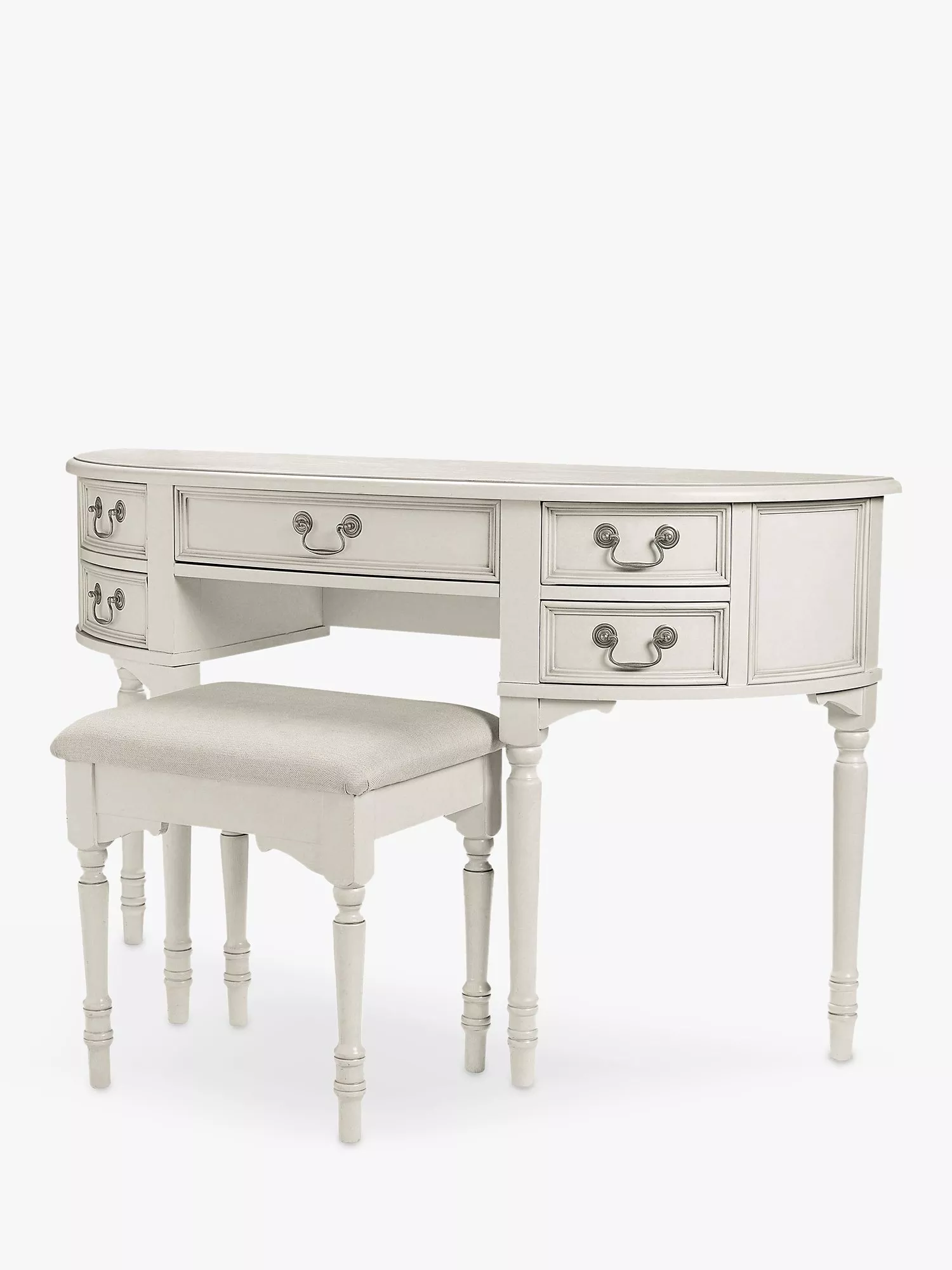 Turned wooden legs and panelling detail honours the timeless aesthetic of this dressing table, which is supplied with a coordinating stool. Made from a combination of sturdy timbers, it provides the perfect place to get ready each day and five drawers means you can safely store make up and jewellery. Both the table and stool are painted and finished with a hand-applied patina which creates an aged effect.
