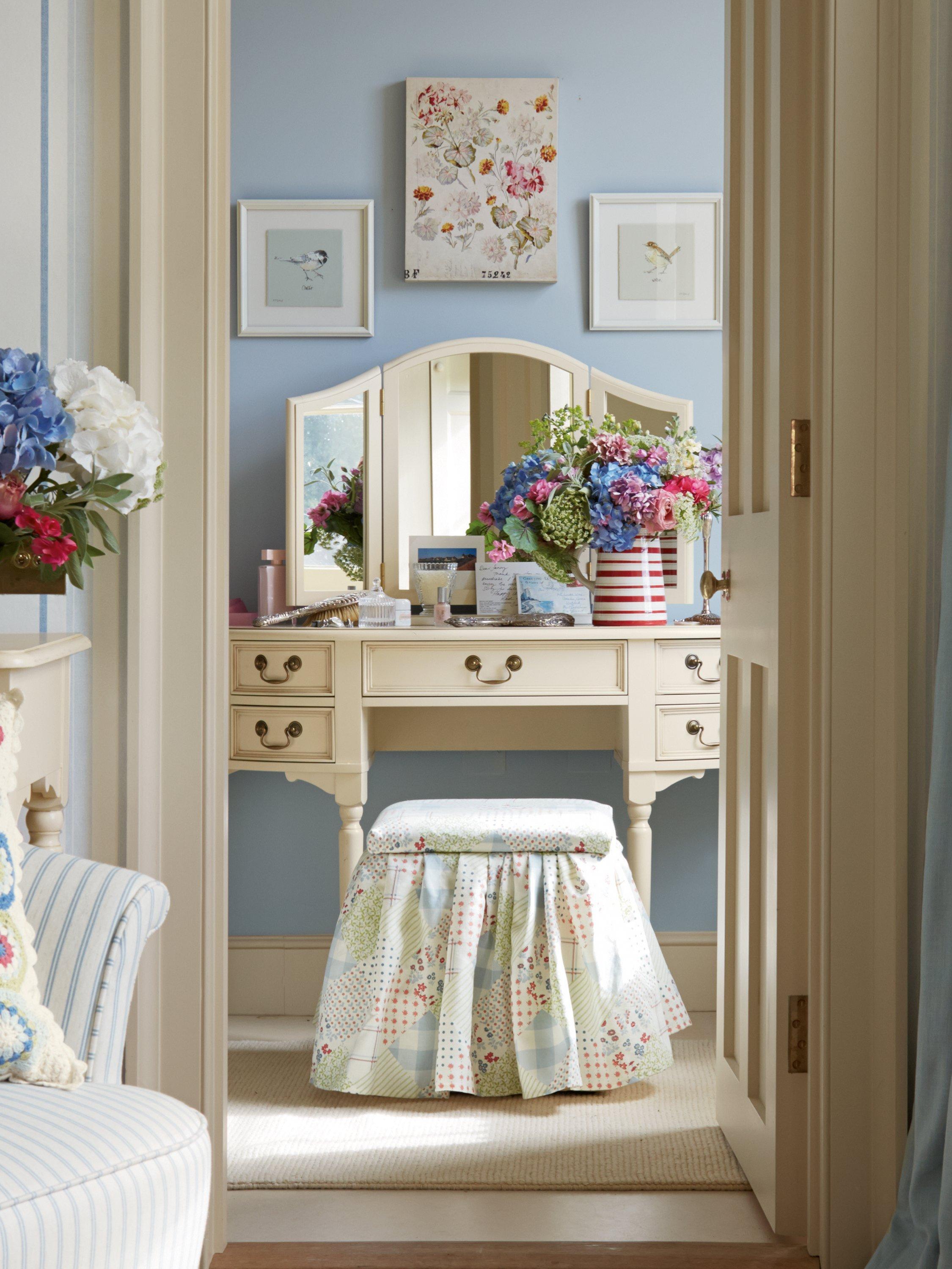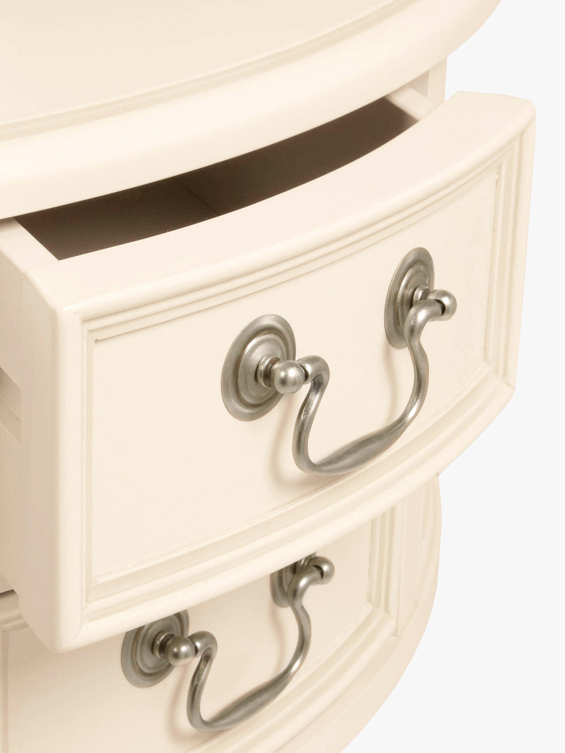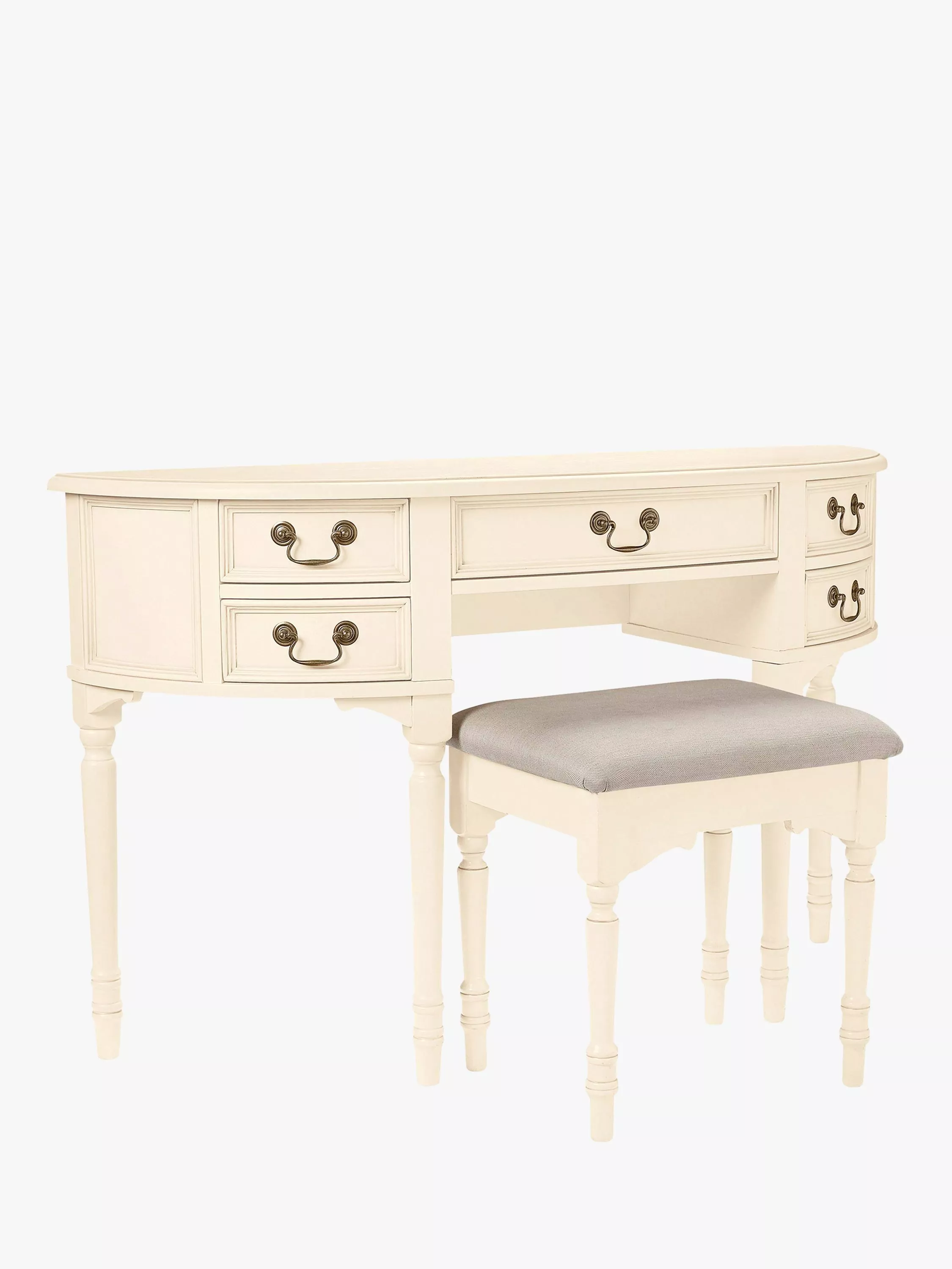 This elegant dressing table has a distinctive curved shape, and it features four small drawers and one wide drawer. It's built from sturdy beech wood and MDF in a hand-finished patina that enhances its unique, aged effect and it's complemented with antique handles. This set also includes a matching stool which is generously upholstered and designed with traditional turned legs.