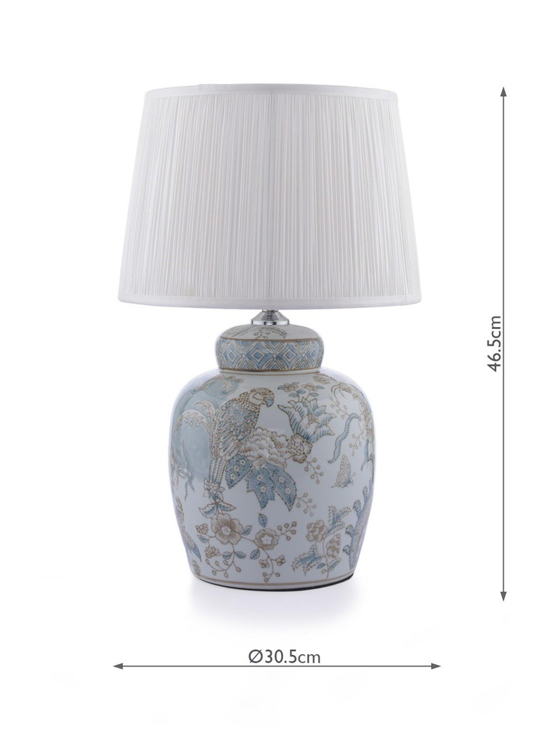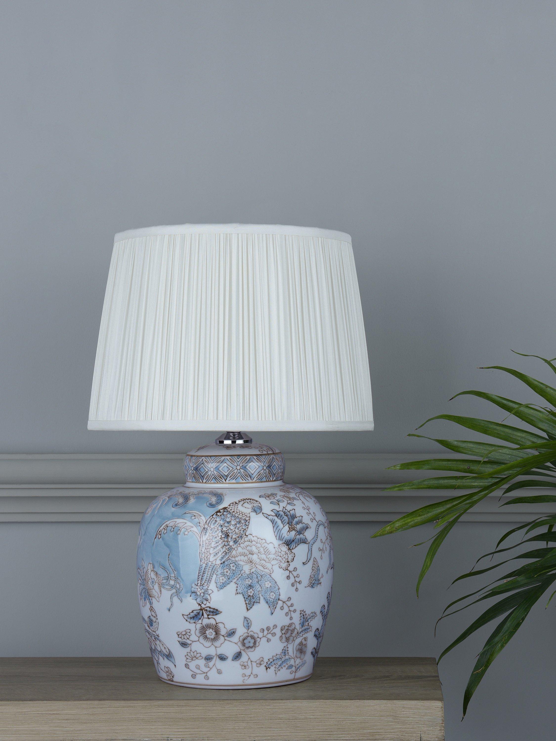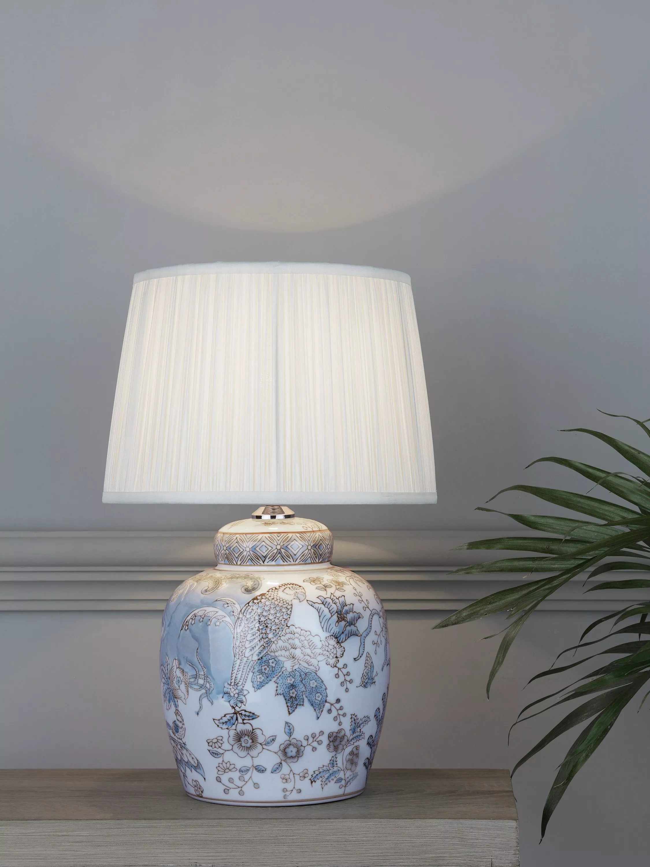 The ornate and delicate ceramic base of this table lamp has been hand-painted with a scene of birds and foliage. Shaped like a Chinese ginger jar, it has a gloss finish and it's topped by a polished chrome lampholder. Enhancing its timeless style is the pleated drum lampshade which is made from silk and beautifully softens the light. A perfect choice for living spaces. One LED bulb is required.