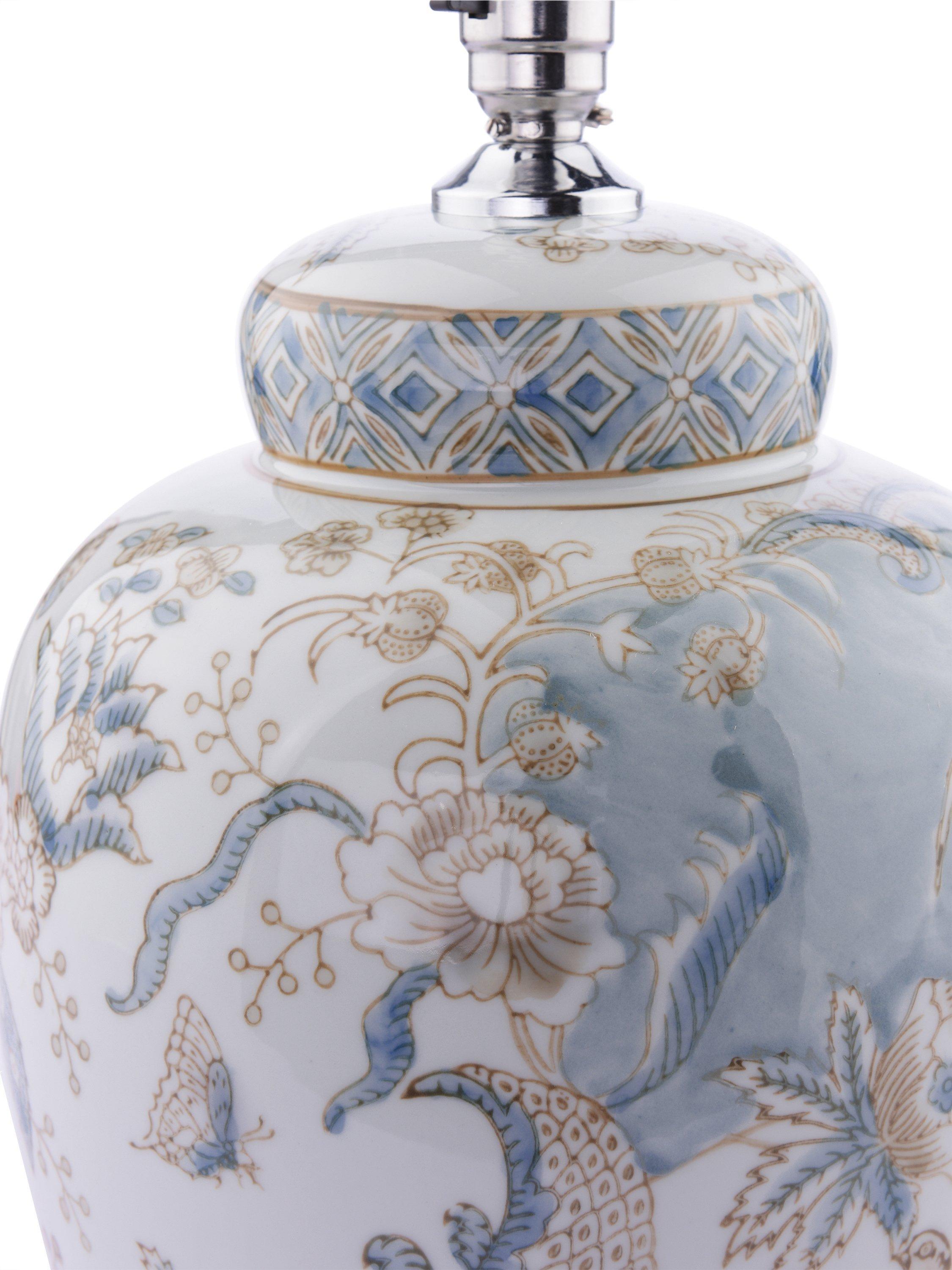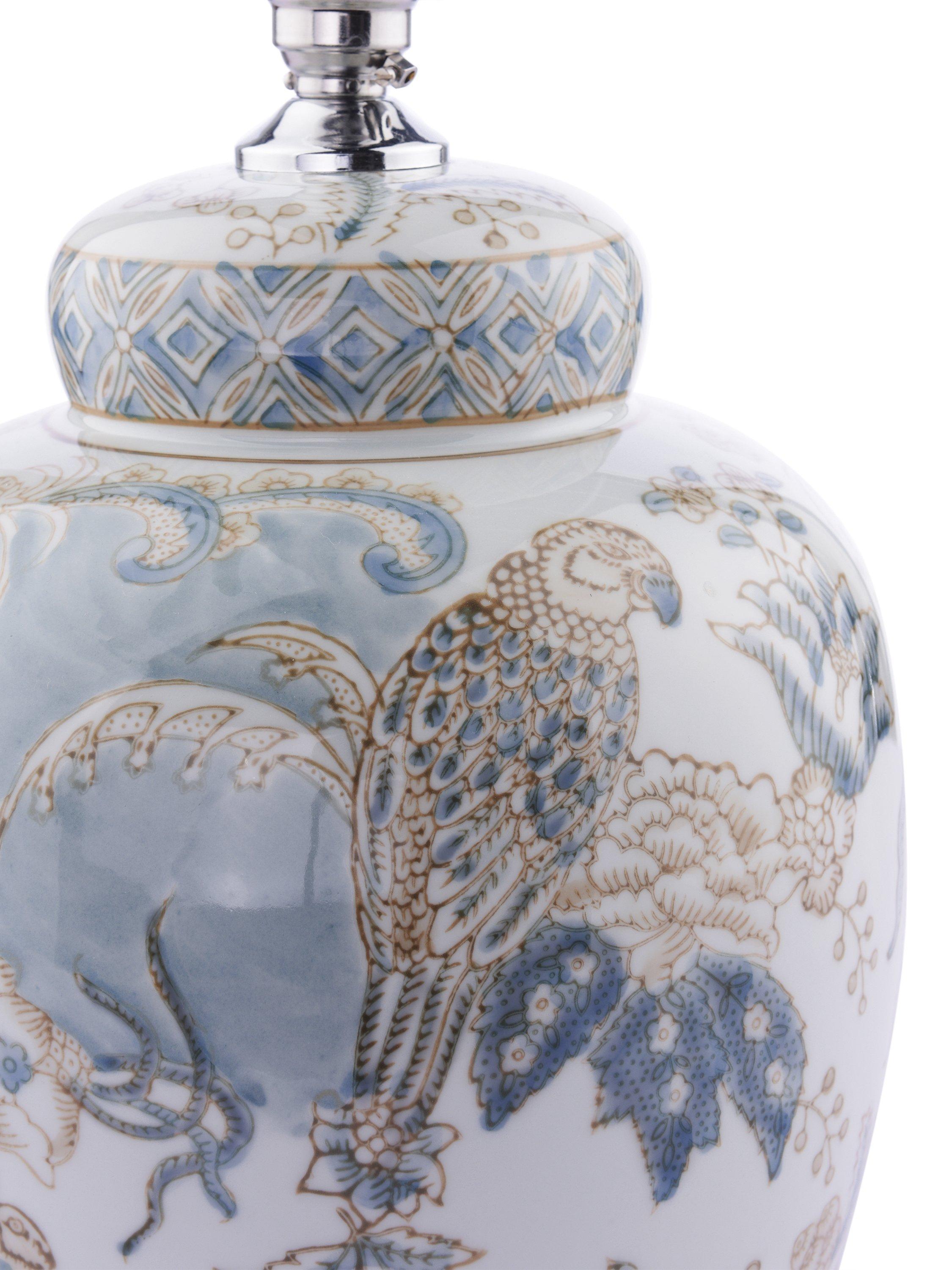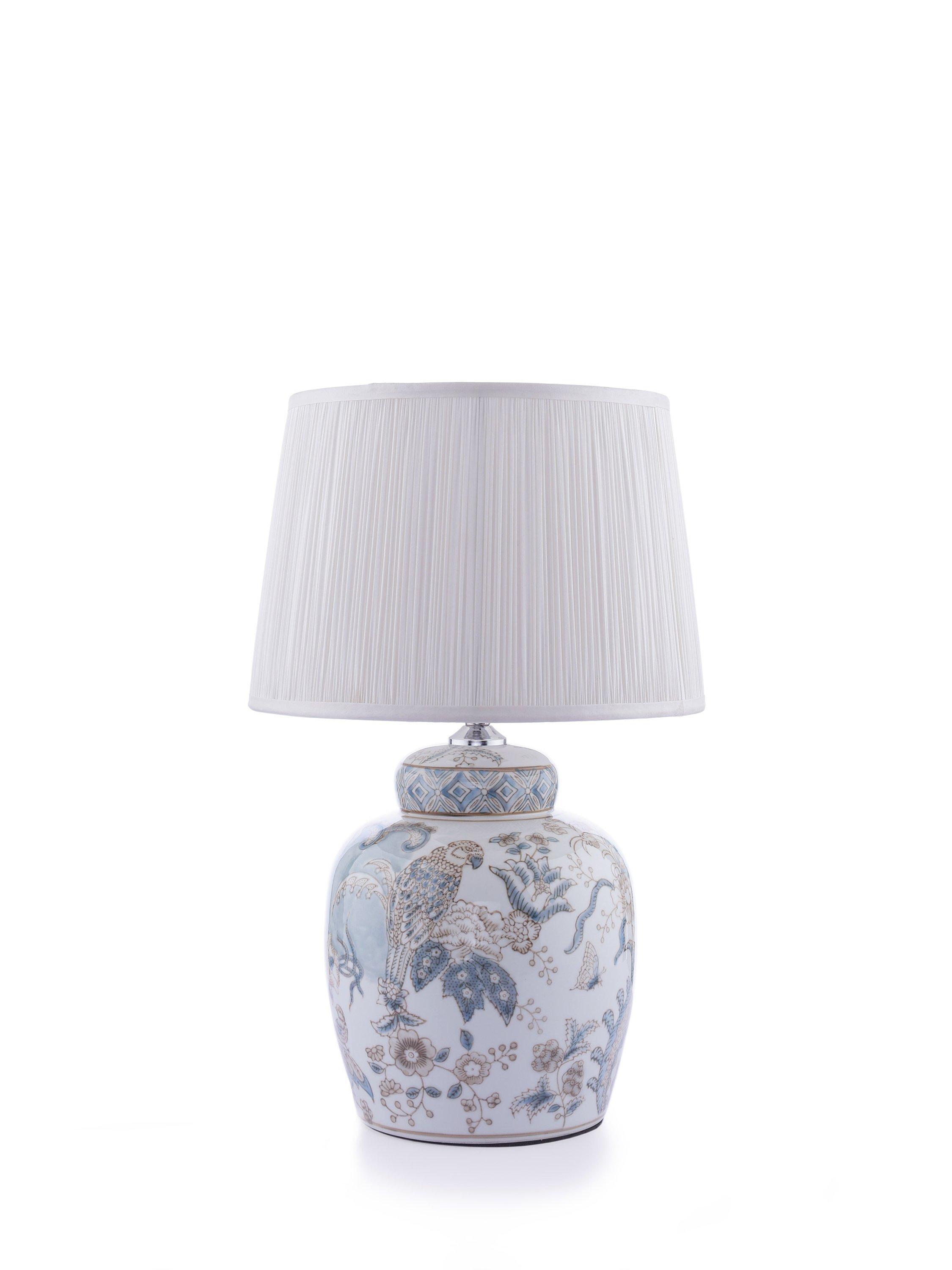 The ornate and delicate ceramic base of this table lamp has been hand-painted with a scene of birds and foliage. Shaped like a Chinese ginger jar, it has a gloss finish and it's topped by a polished chrome lampholder. Enhancing its timeless style is the pleated drum lampshade which is made from silk and beautifully softens the light. A perfect choice for living spaces. One LED bulb is required.