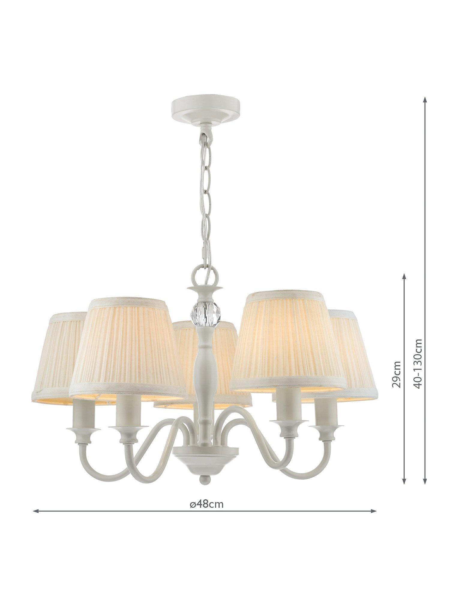 Available in a painted or polished metal finish, this traditional candelabra-style ceiling light is a great option for living spaces or bedrooms. It's accented with a crystal glass ball which adds a touch of glamour and it comes with pleated cotton lampshades which soften the glow. Height-adjustable at the point of installation, five LED bulbs are required.