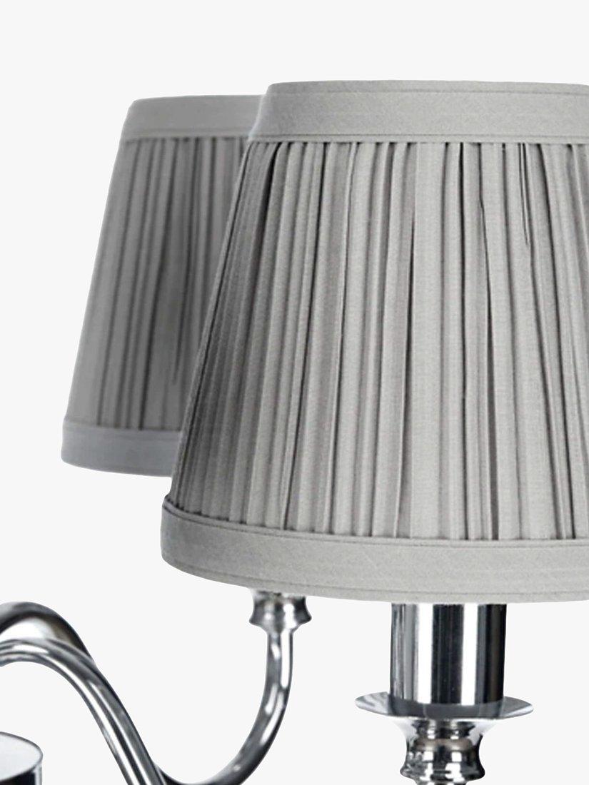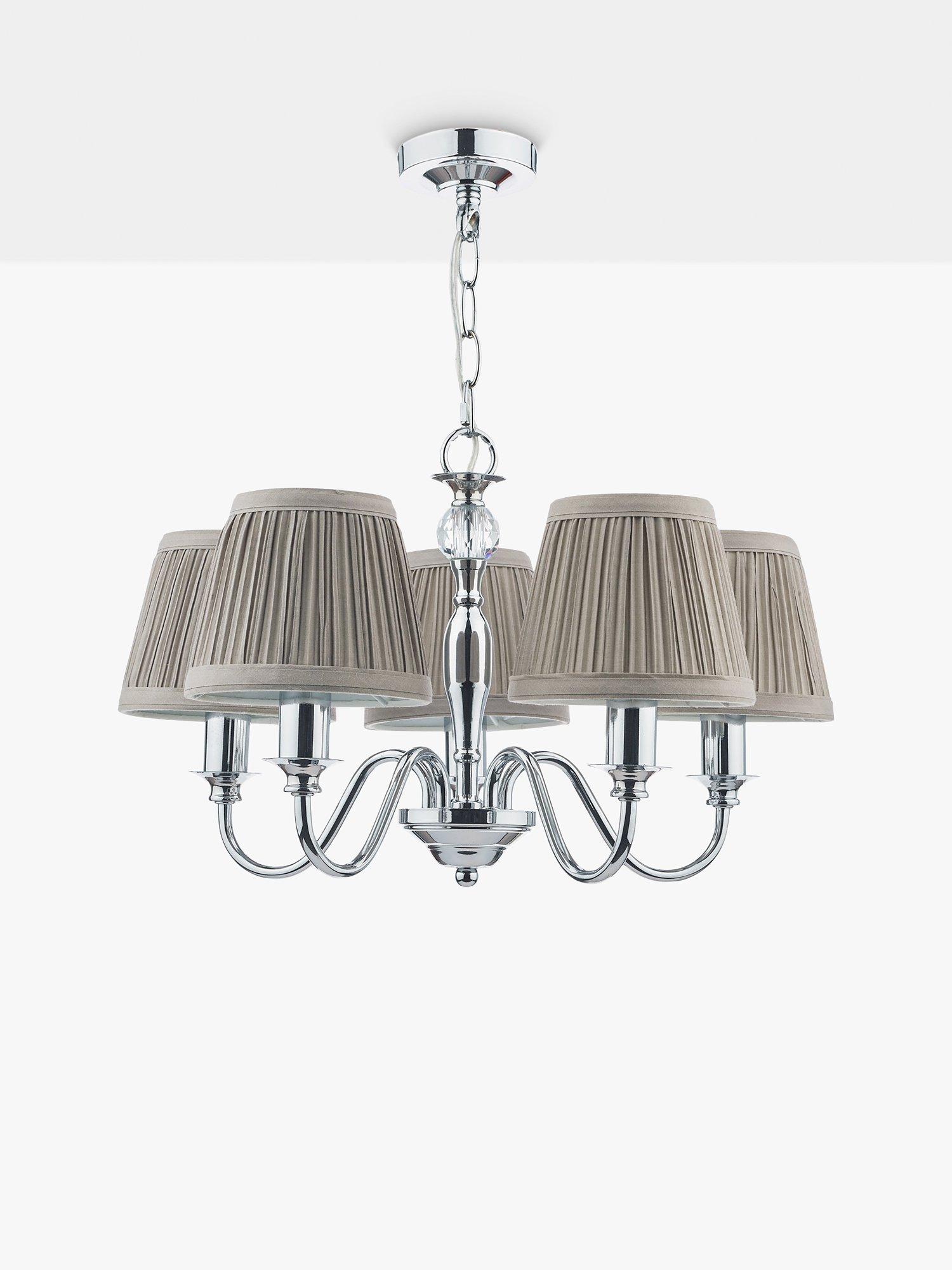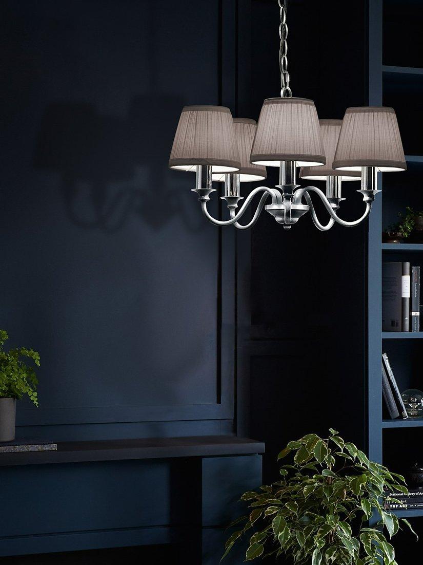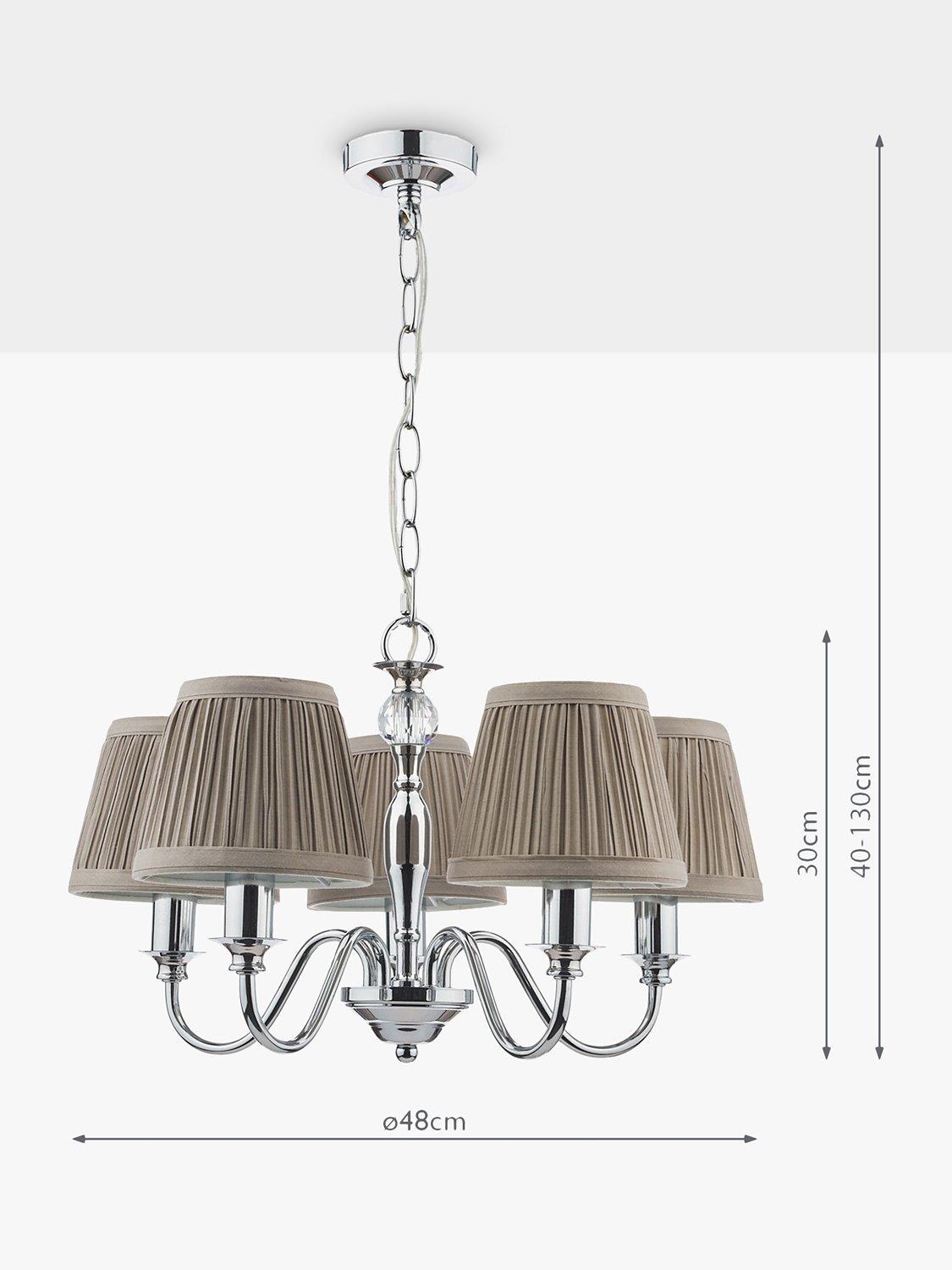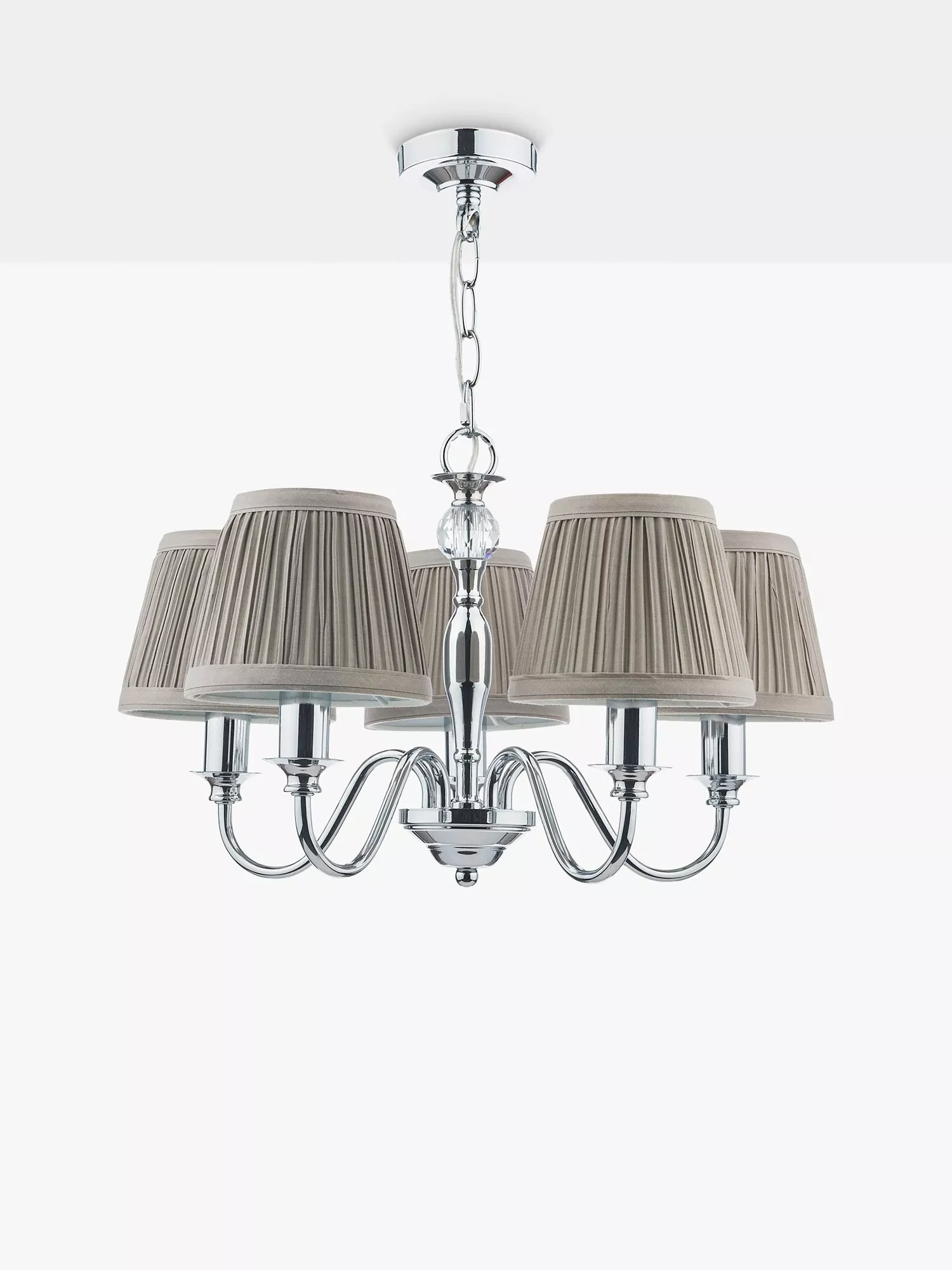 Available in a painted or polished metal finish, this traditional candelabra-style ceiling light is a great option for living spaces or bedrooms. It's accented with a crystal glass ball which adds a touch of glamour and it comes with pleated cotton lampshades which soften the glow. Height-adjustable at the point of installation, five LED bulbs are required.
