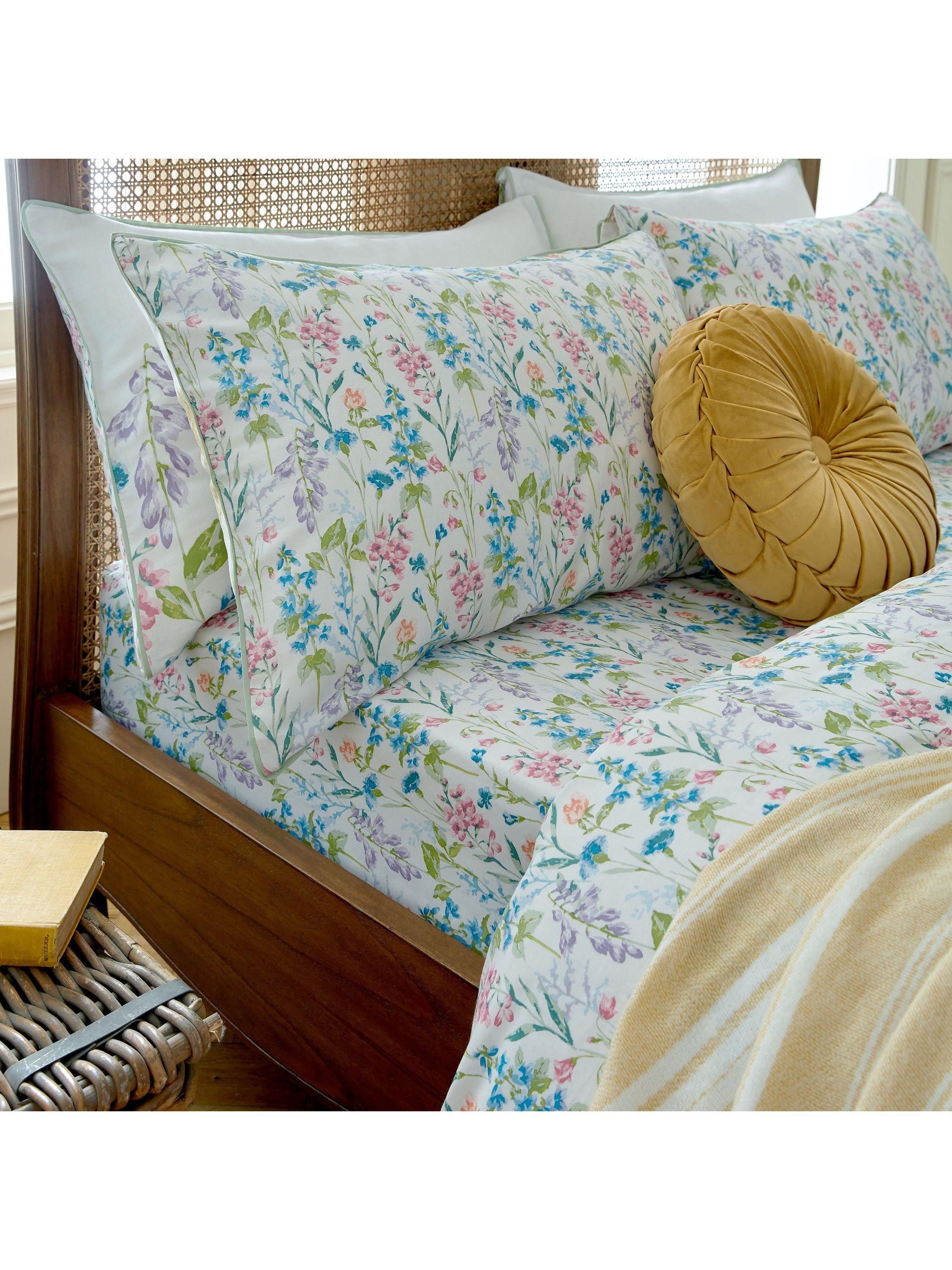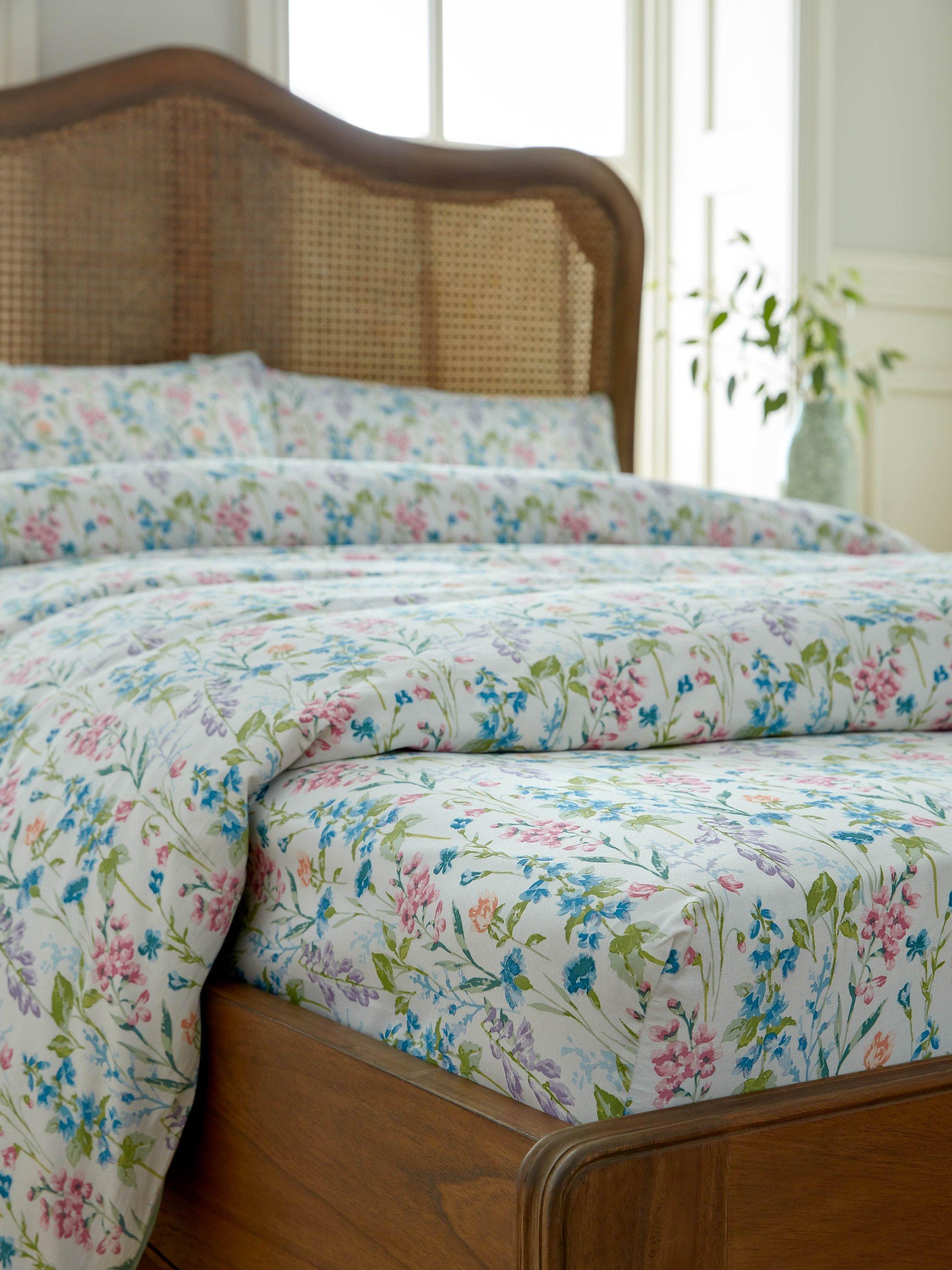 Elston Garden showcases a lively watercolour illustration with stylised British wildflowers including harebells and cornflowers. Printed on a luxurious 220 thread count cotton sateen, this ditsy sheet set offers a summery palette, perfect to introduce the outside in.