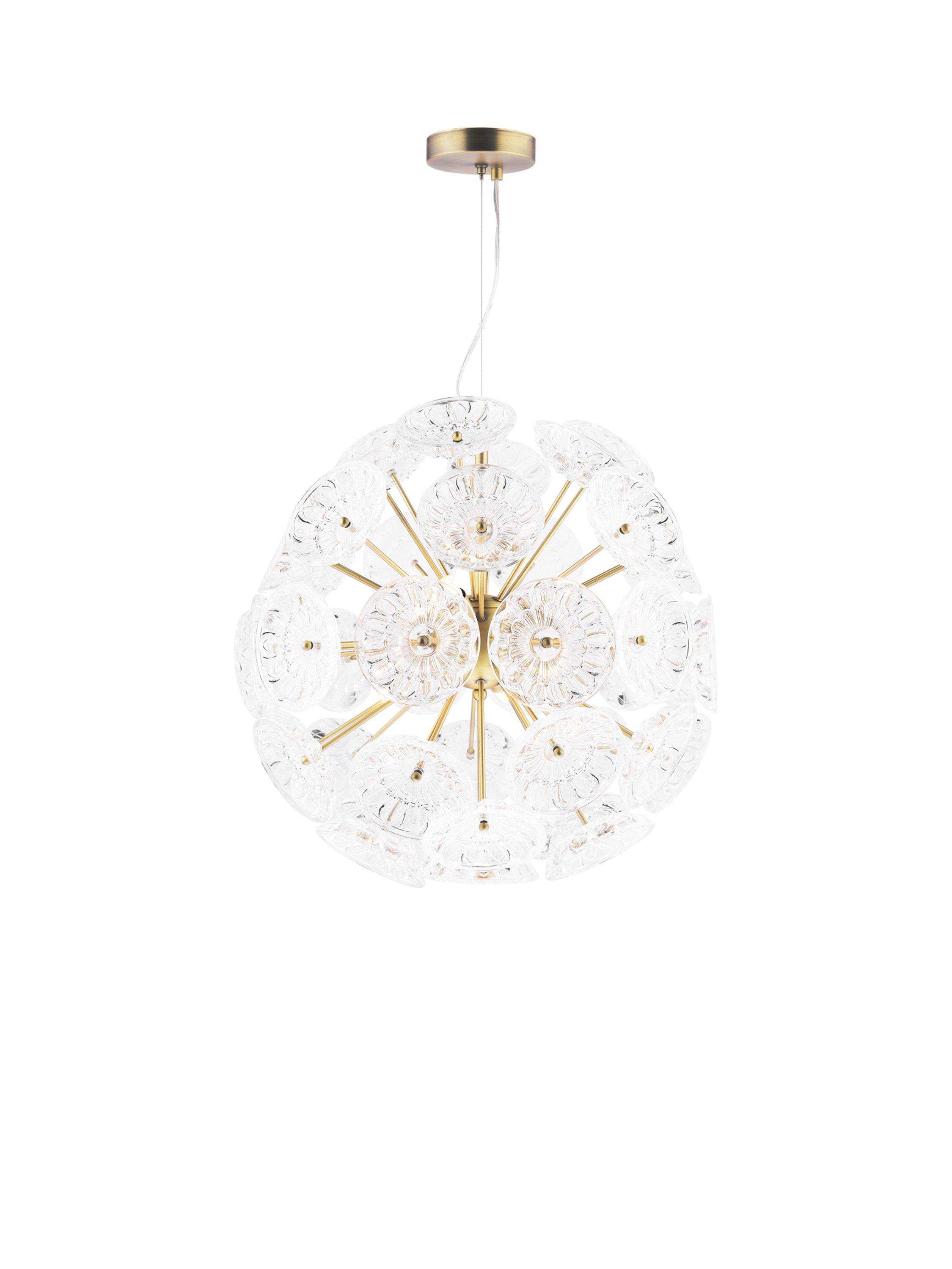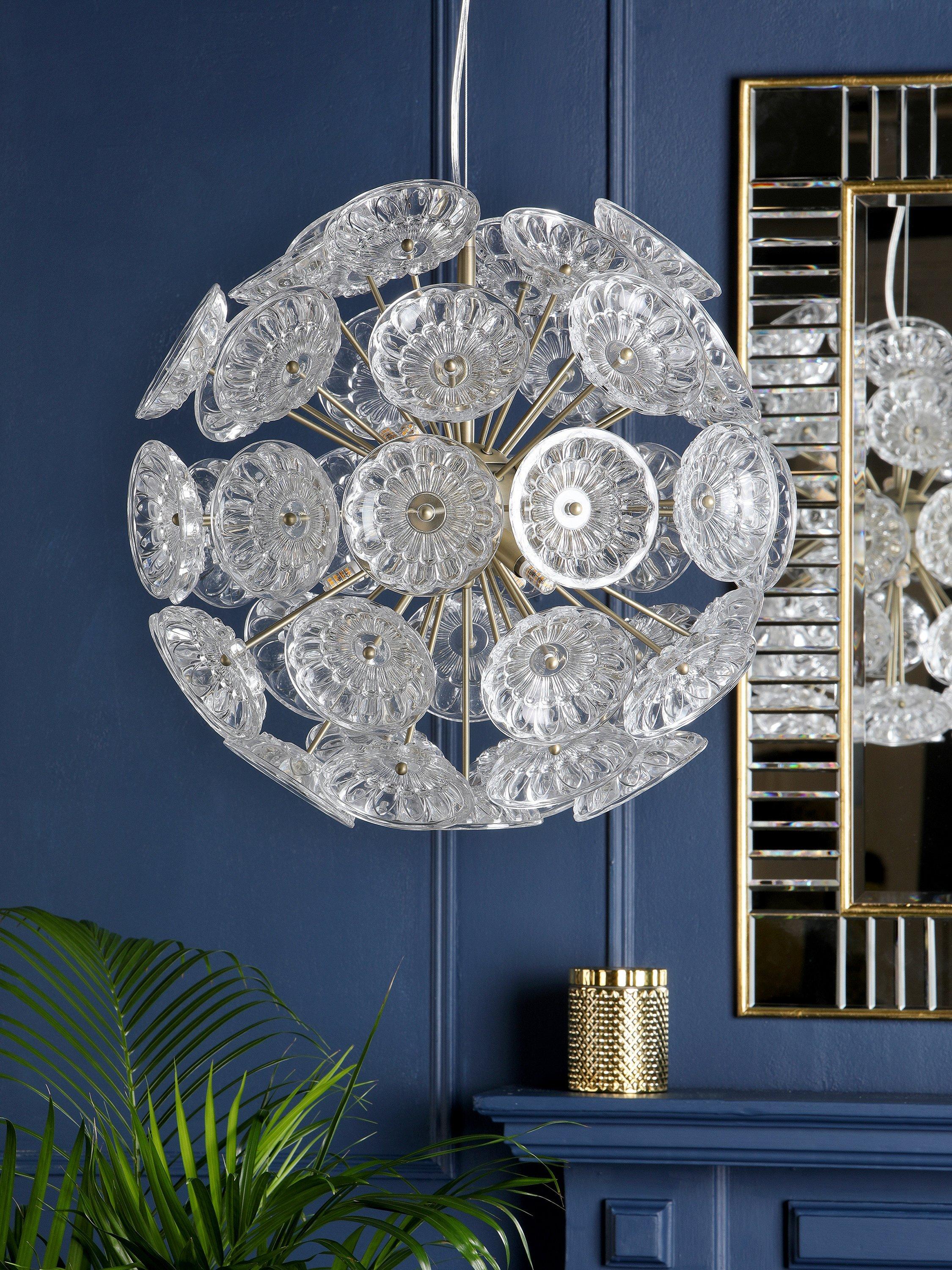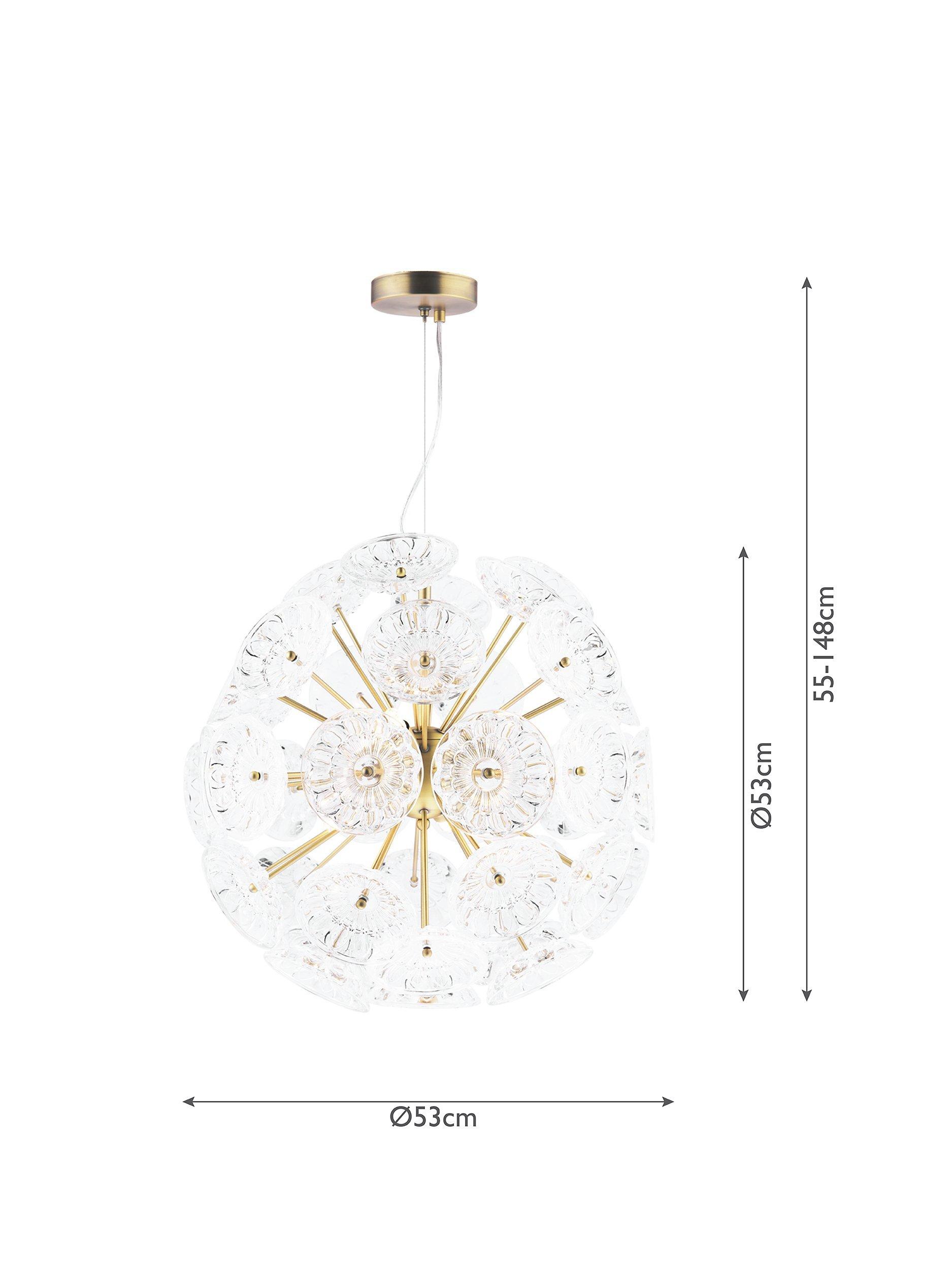 The Elwick six light ceiling pendant by Laura Ashley is a timeless statement piece featuring pressed glass dishes on matt antique brass rods which beautifully refract the light when lit. You can adjust the cable length to suit the height of your ceiling. Bulbs are not included.