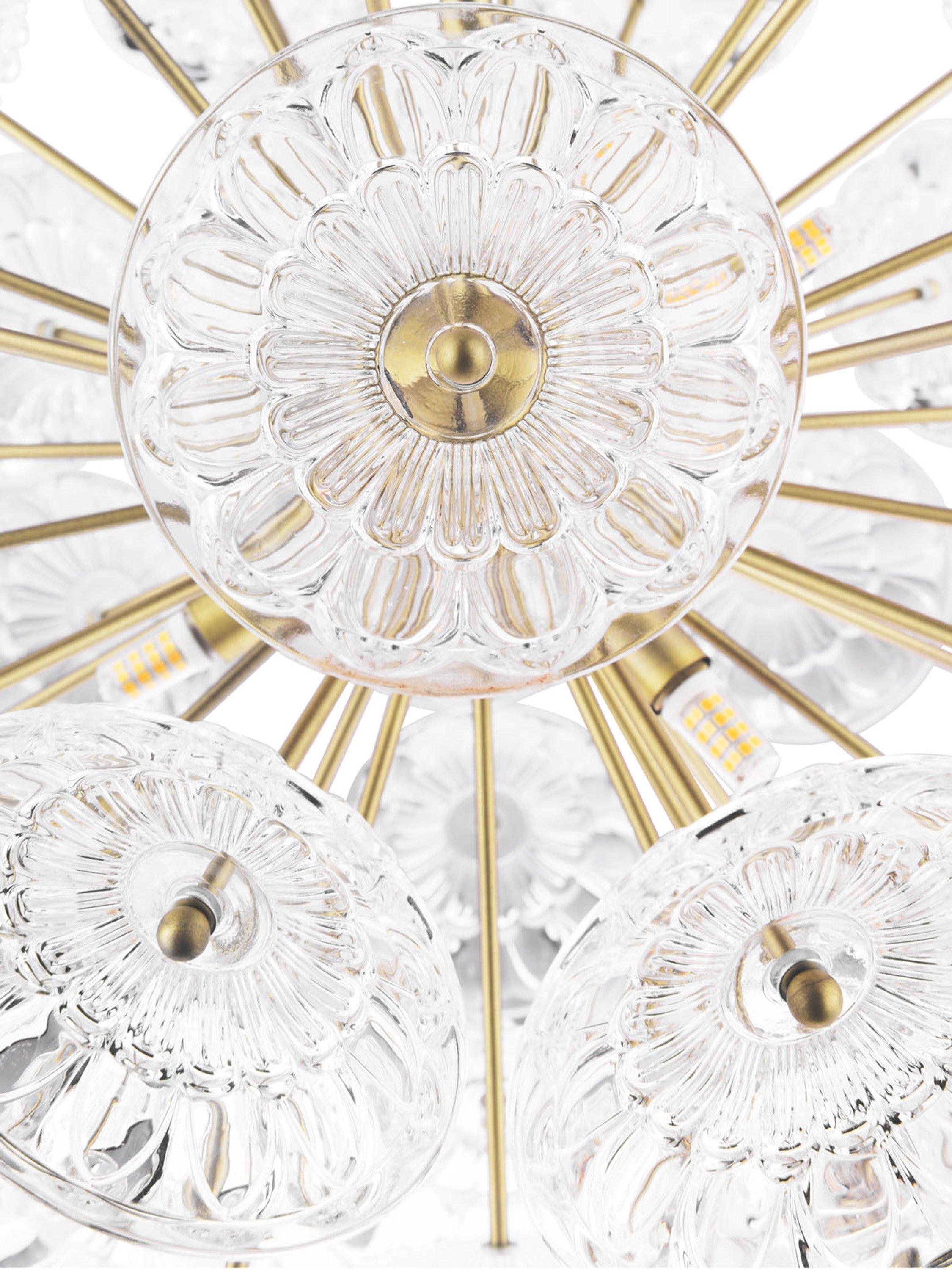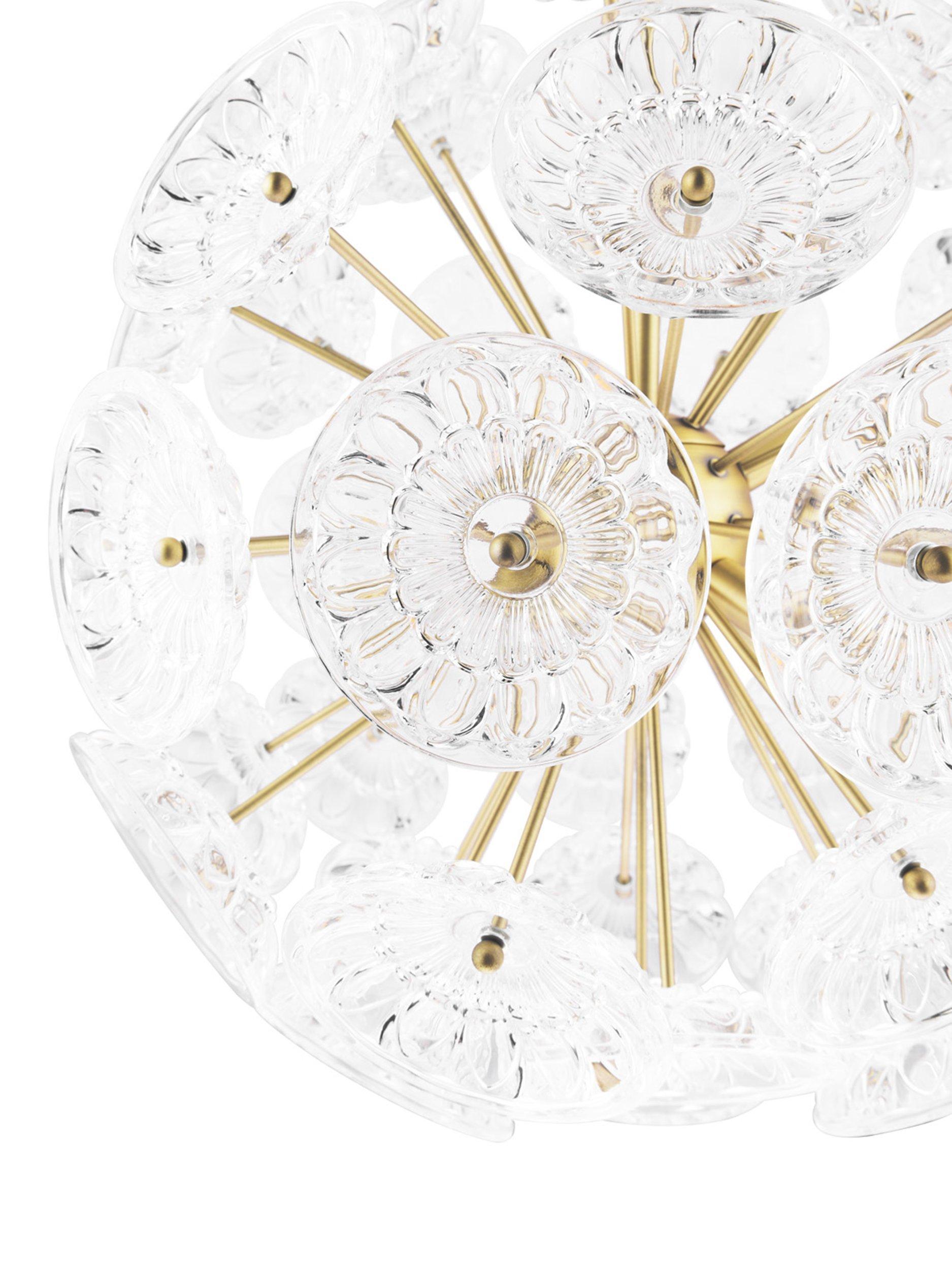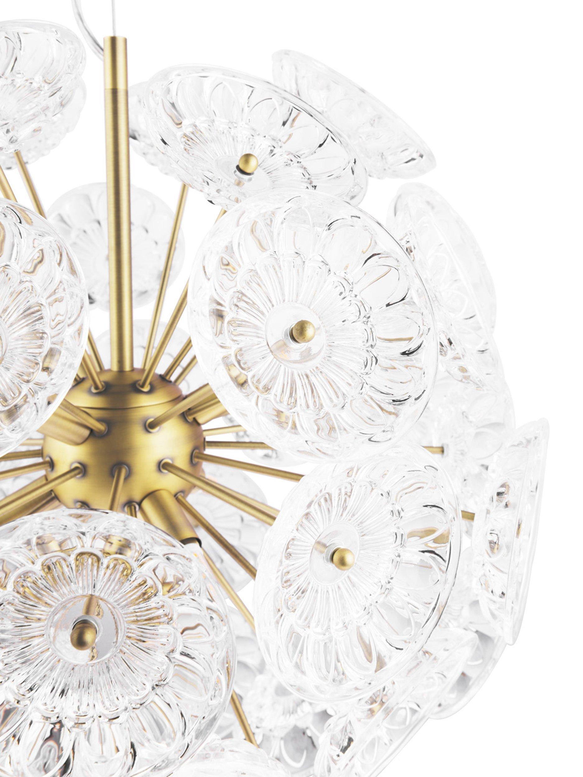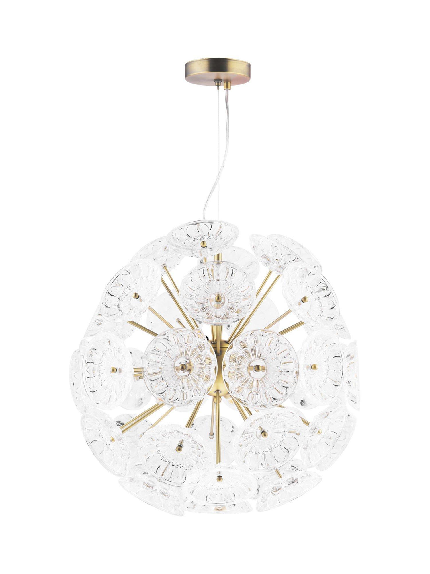The Elwick six light ceiling pendant by Laura Ashley is a timeless statement piece featuring pressed glass dishes on matt antique brass rods which beautifully refract the light when lit. You can adjust the cable length to suit the height of your ceiling. Bulbs are not included.