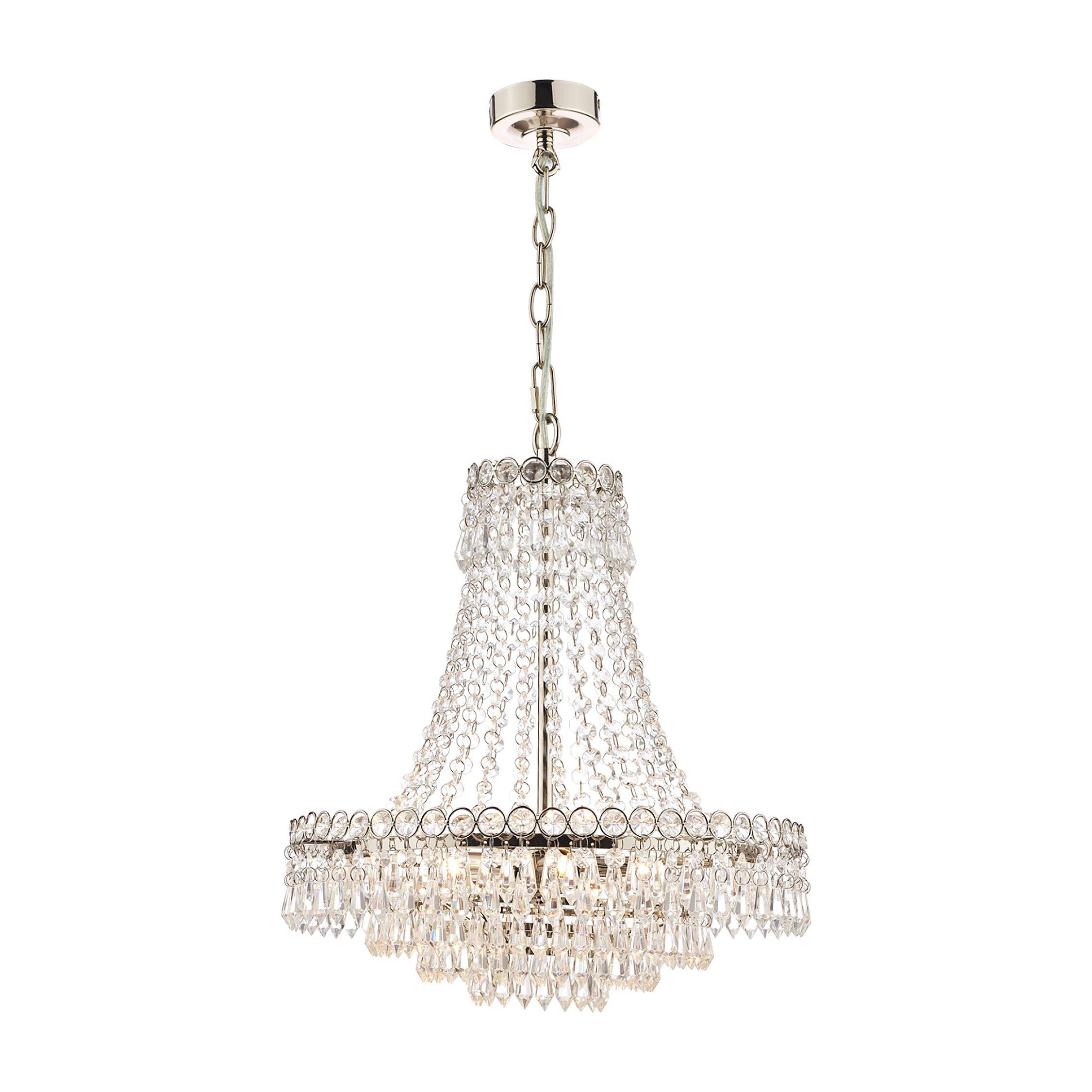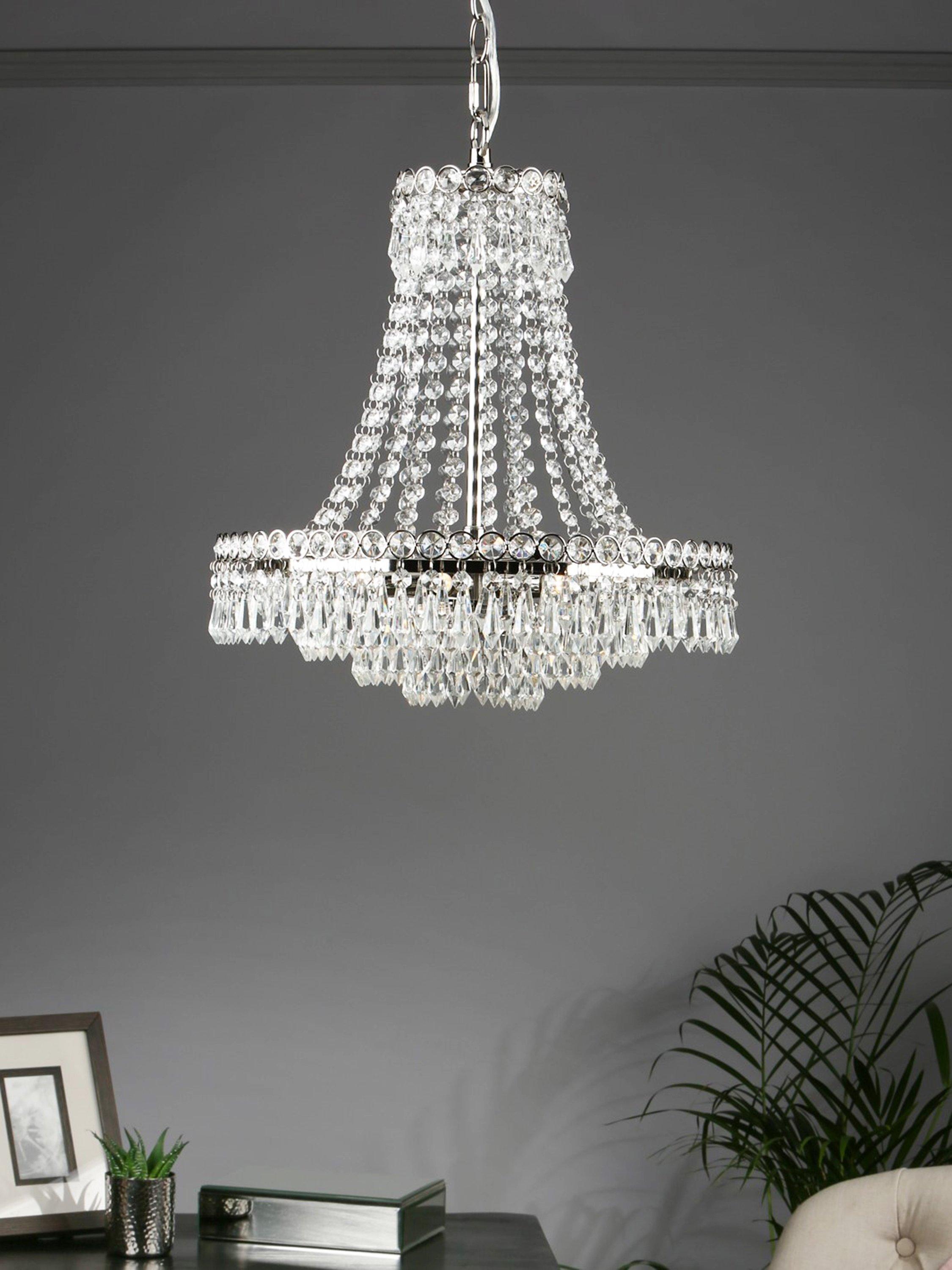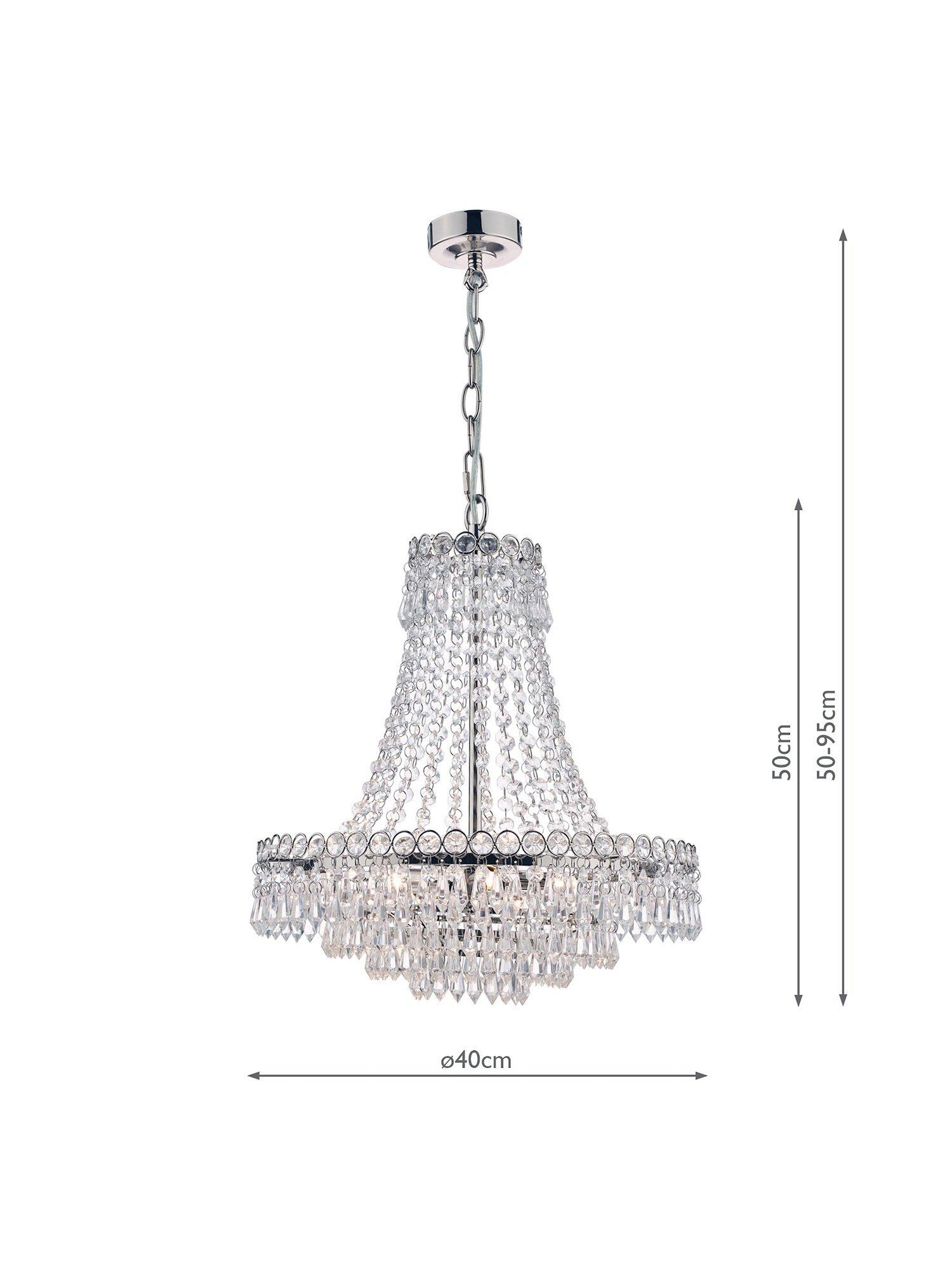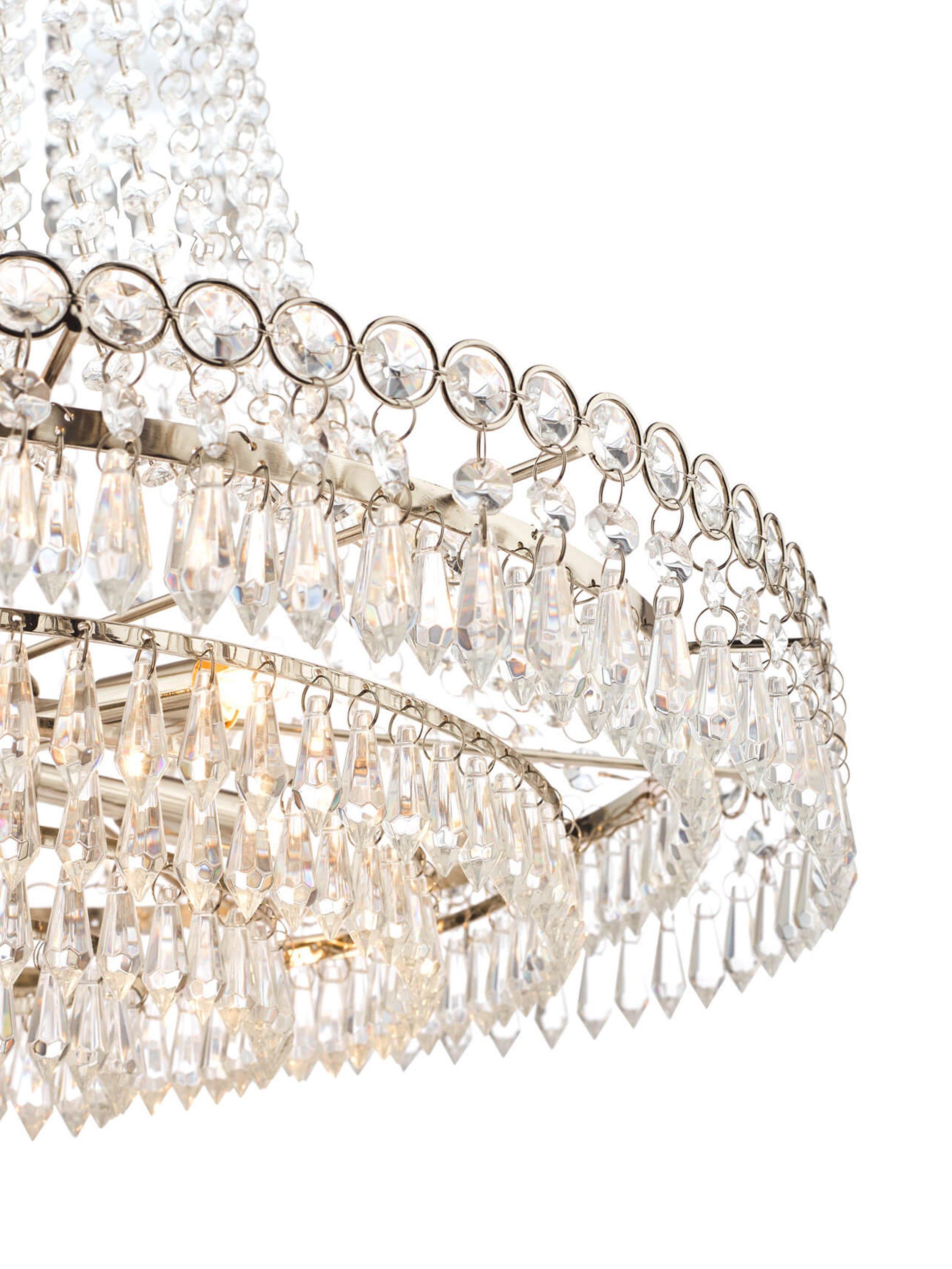 An expression of classic elegance. This French-inspired chandelier ceiling light is made from clear, cut crystals that are suspended from a hand-polished metal frame in decreasing circles. A delicate, traditional design which will bring maximum focus to your space, it's height-adjustable at the point of installation and offers a bright, glistening glow of light. Five LED bulbs are required.