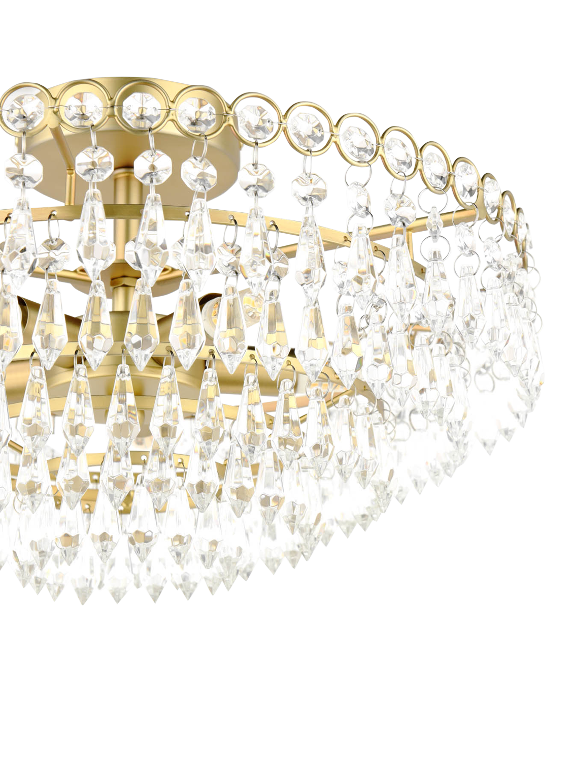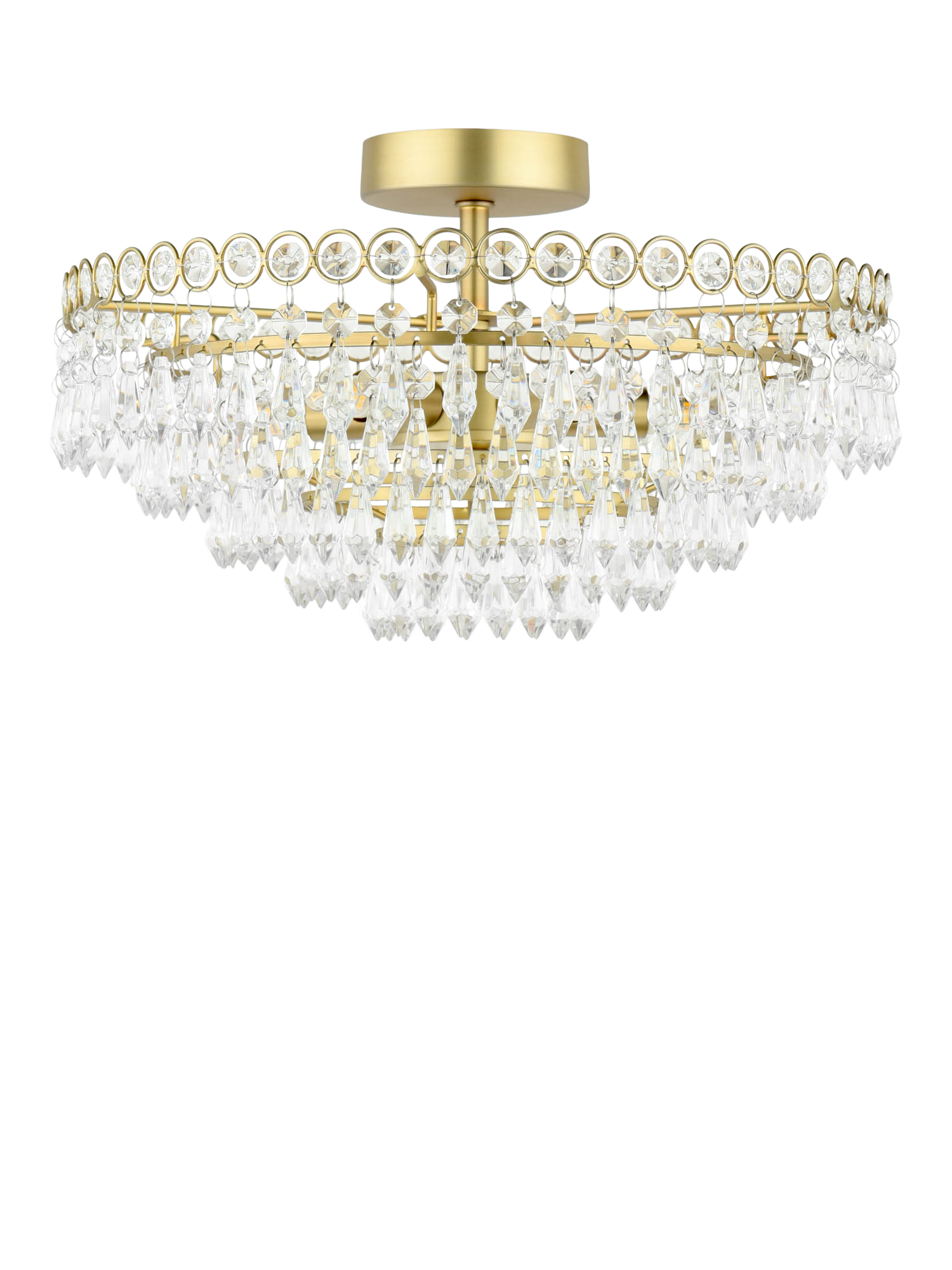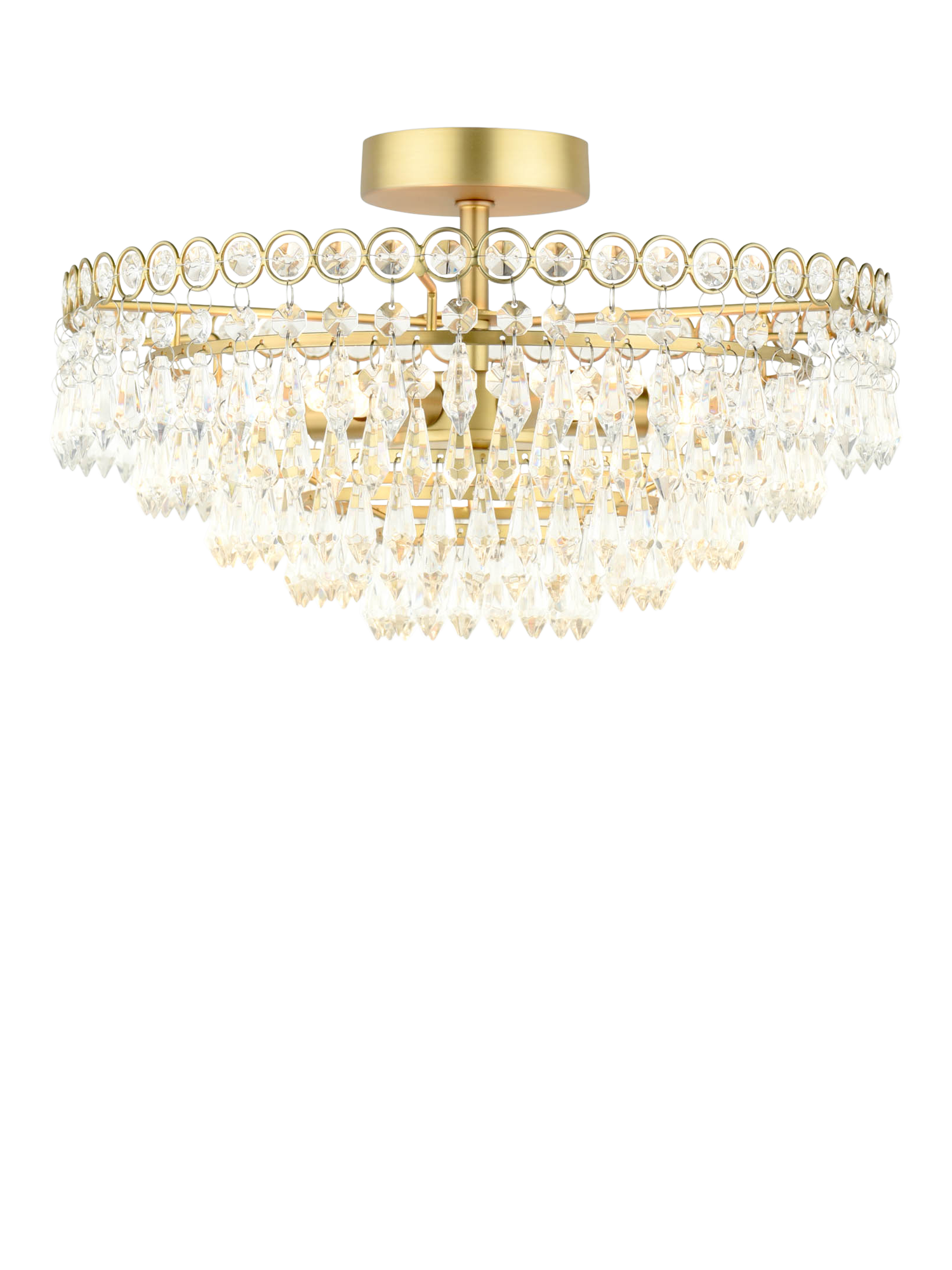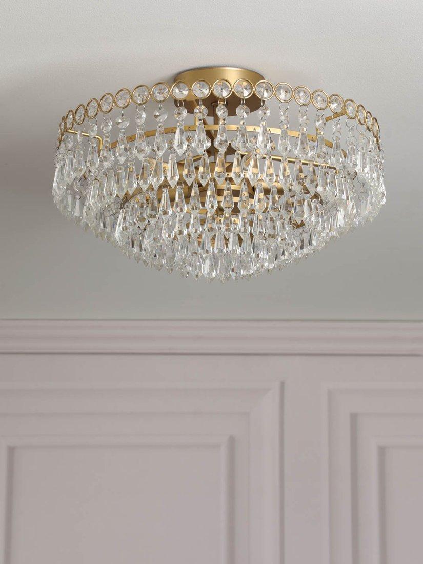 The clear, cut crystals are hand-polished to give a smooth surface, and are suspended from a metal frame finished with matt antique brass. A semi-flush design, it sits close to the ceiling on a short stem, with no visible cable, making it ideal for rooms with lower heights.