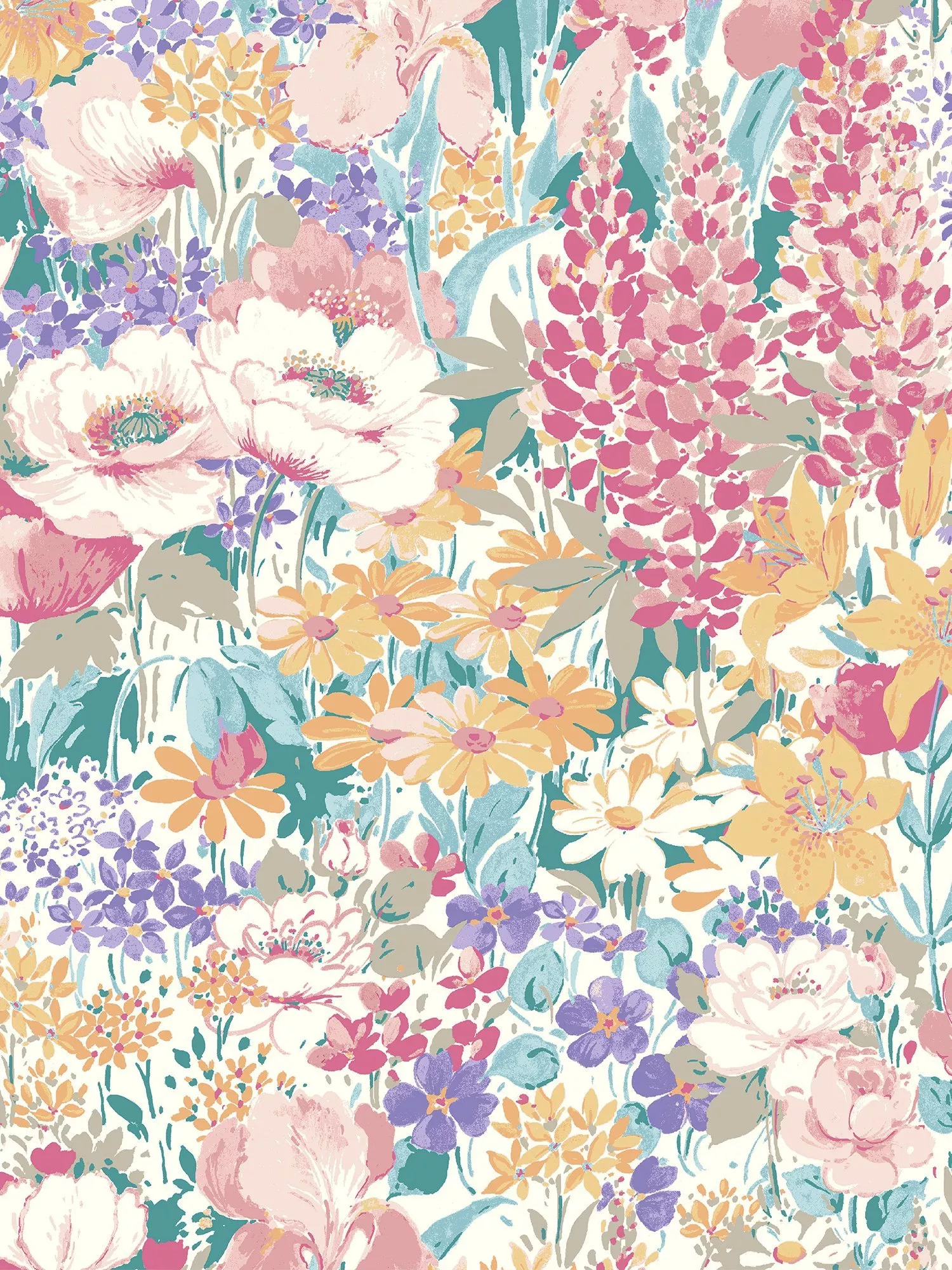 Bold and beautiful, Everingham Meadow is a densely packed floral print bursting with character. A joyful celebration of cottage garden favourites, including irises, daisies, and lupins, this charming print captures the beauty of a wild summer meadow in full bloom.