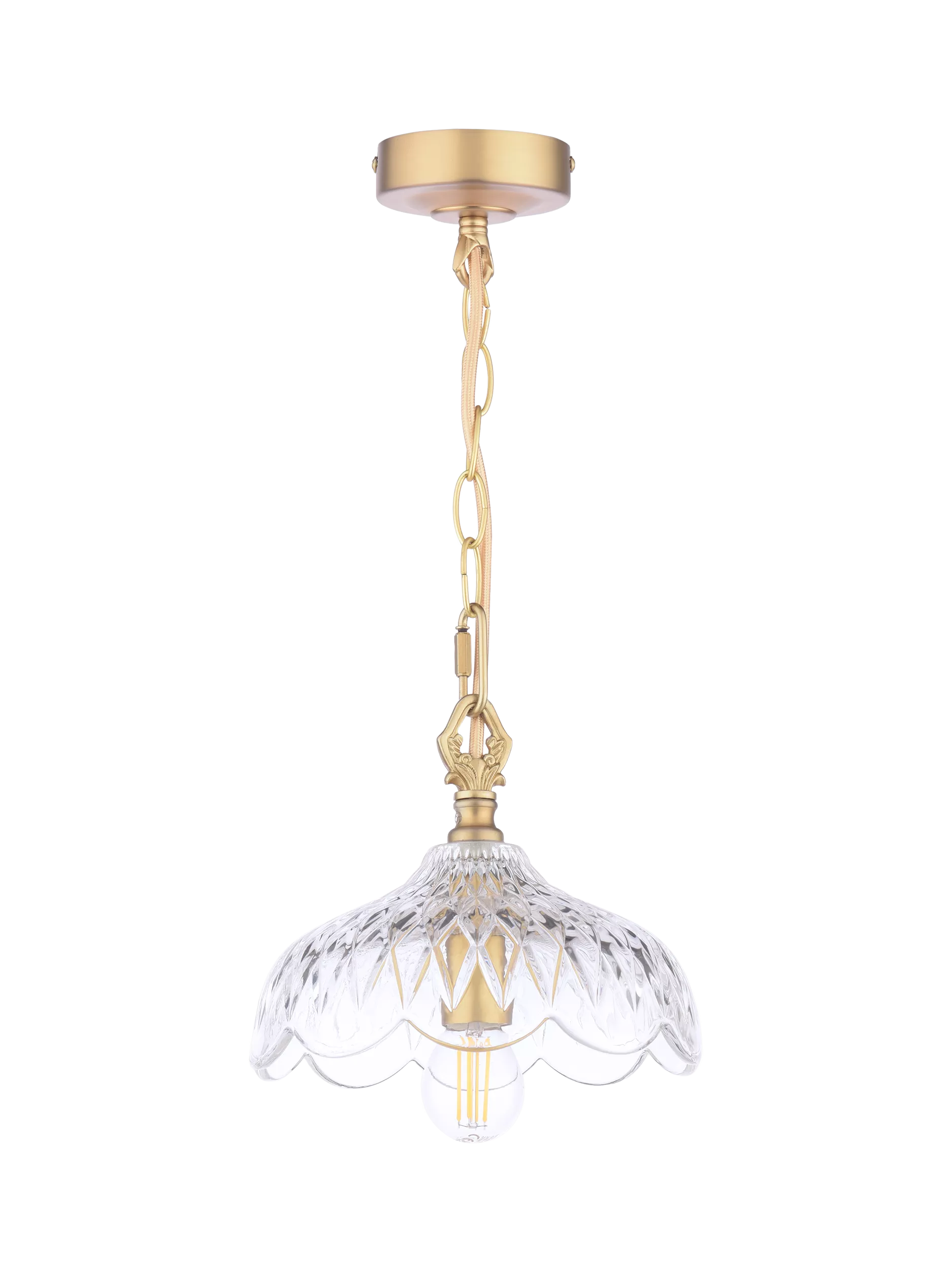 Lend your kitchen or hallway an elegant, vintage-inspired touch with the Laura Ashley Eversden pendant ceiling light. Crafted with an antique brass finish, this pendant features a scalloped edge on the shade and intricate cut glass detailing which catches and refracts light for a warm, shimmering effect. The ceiling light casts a warm, ambient glow over your kitchen island or dining table as the centrepiece lighting.