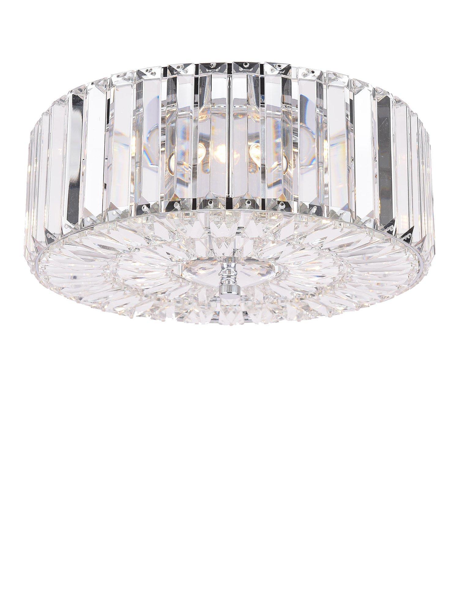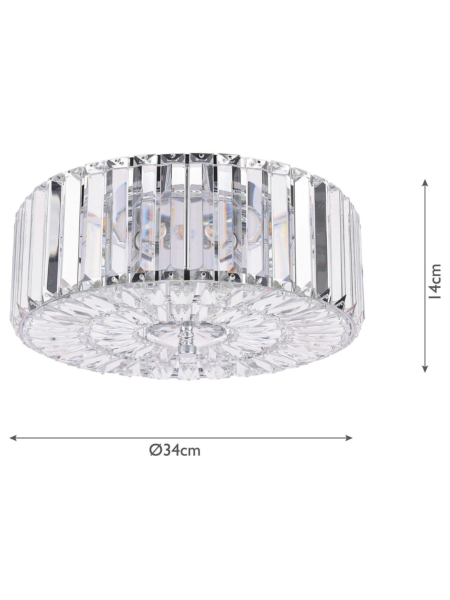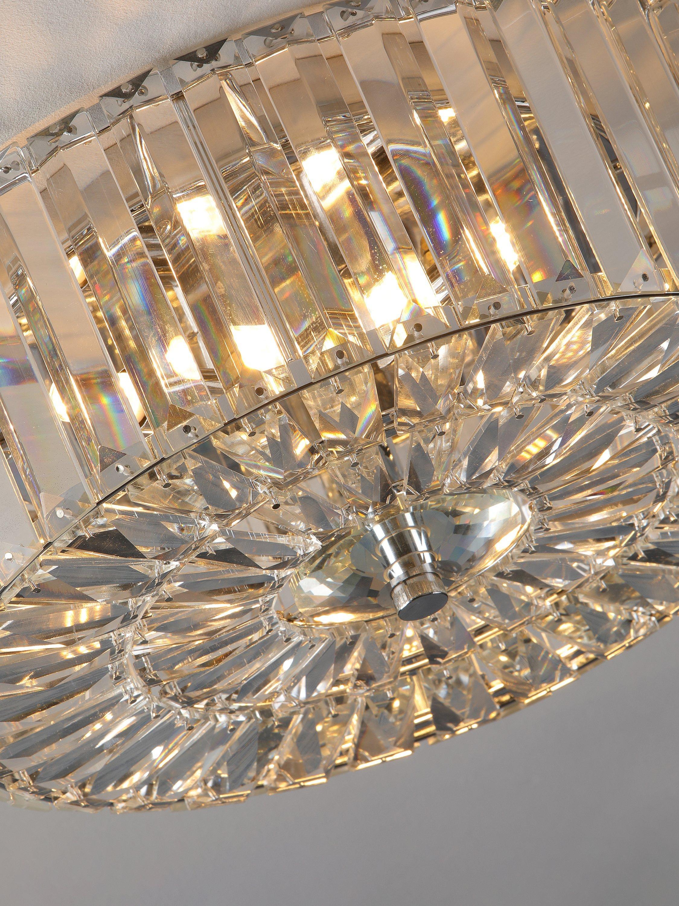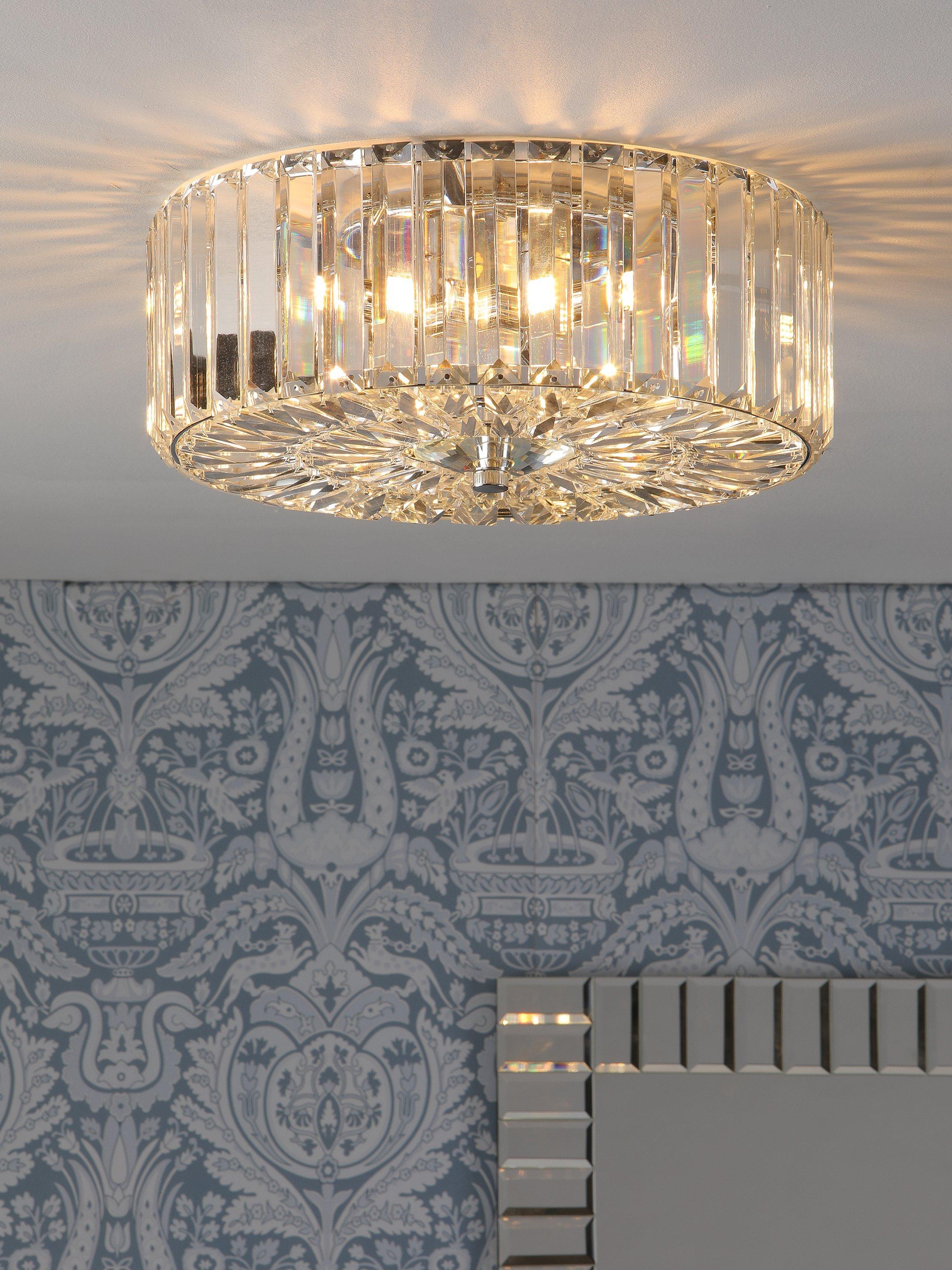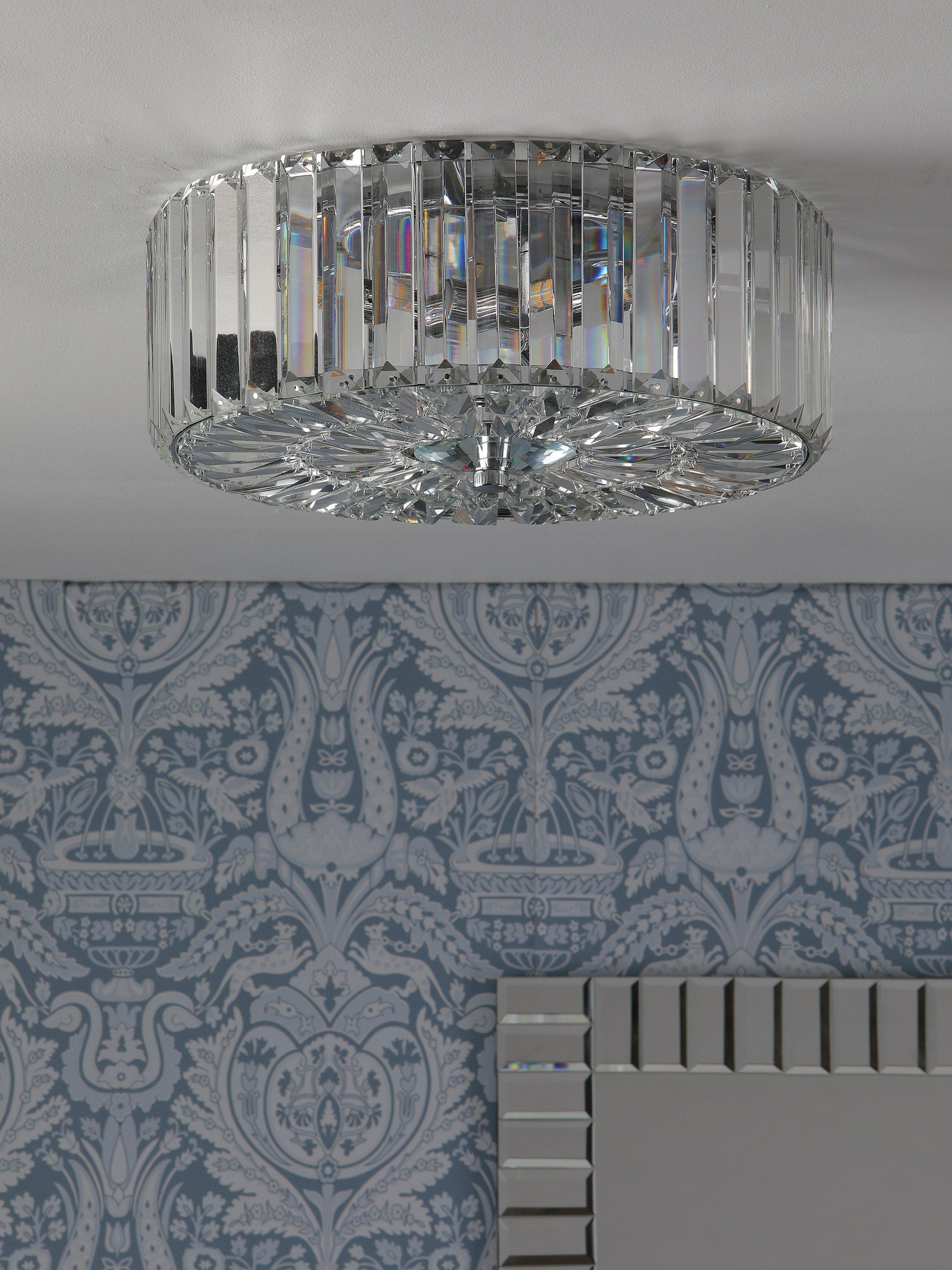 The glamorous Fernhurst ceiling light by Laura Ashley features bevelled glass rods, all suspended from a circular frame in bright polished chrome. Full flush fittings attach directly to the ceiling making the light suitable for low ceilings and small rooms. No visible cables make for a neat finish.