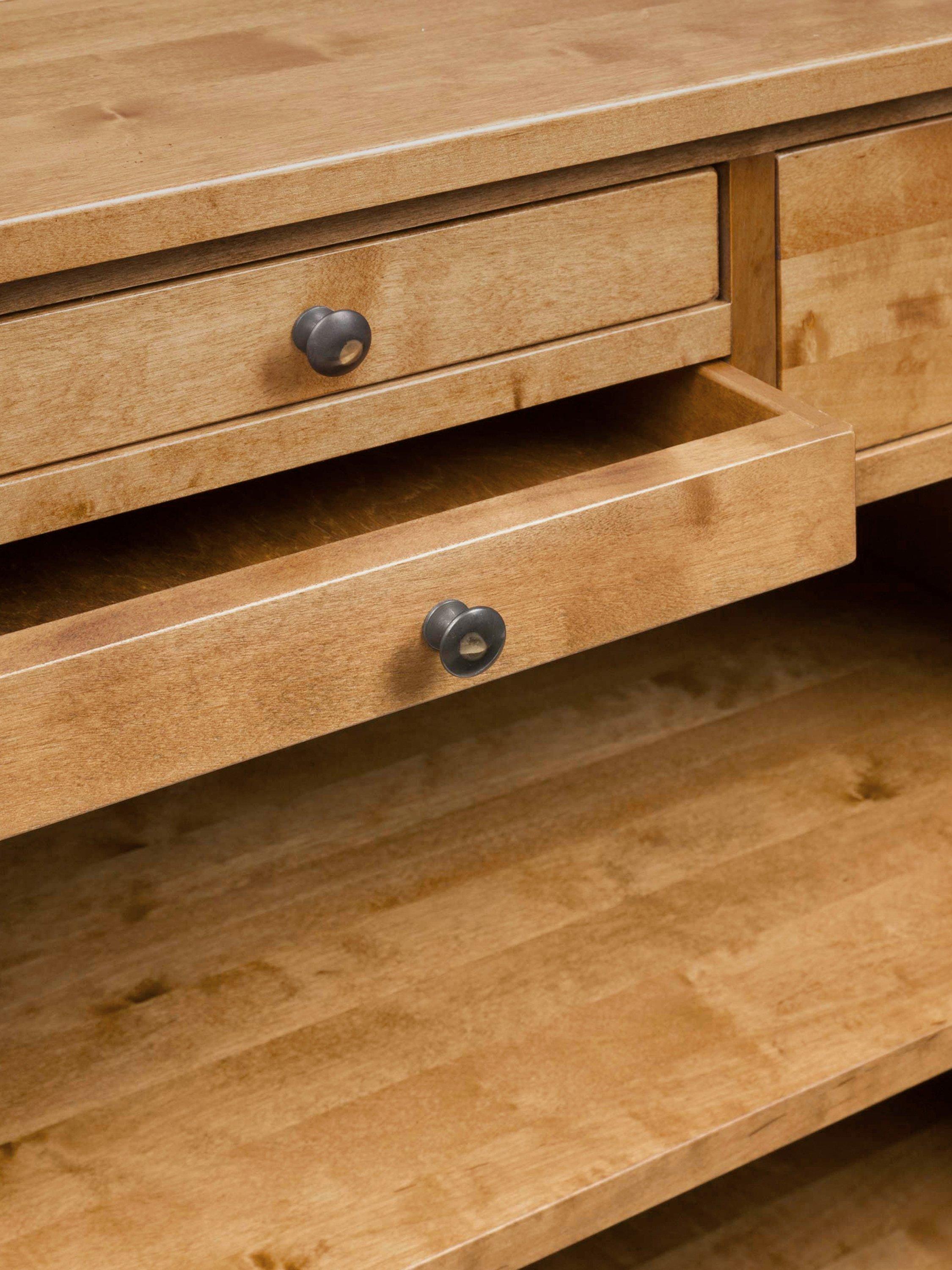 It benefits from four drawers - two small and two large - and in the open section below there is a fixed shelf. It has a rippled top and is stained to help enhance the natural wood effects. Brass effect fittings give it a truly authentic look.