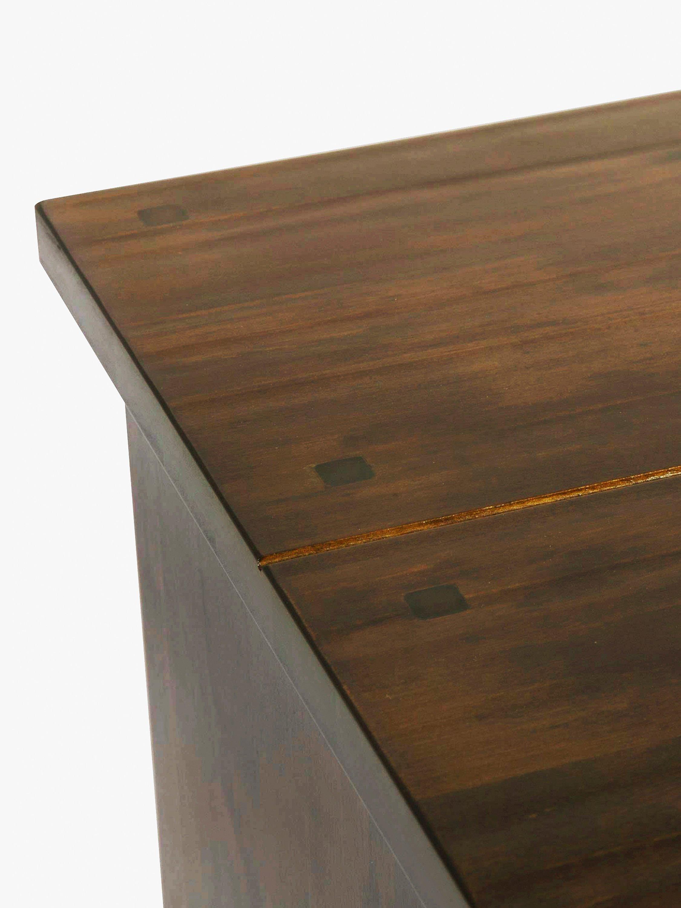 This large console table is crafted from solid birch wood that's been stained to enhance its tone and natural colours. With the addition of birch veneers for durability, it provides plenty of storage space thanks to four drawers and two shelves, so it's a blank canvas to style with your favourite accessories to give it a personal touch. Brass-effect metal handles complete its authentic period style.