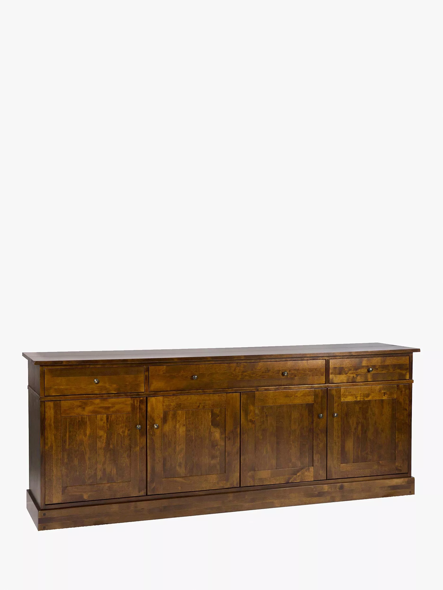 This large sideboard is made from solid birch and birch veneers in a stained finish that highlights the depth of its natural colours. With plenty of storage space available thanks to three drawers (one of which is double width) and two double-door cupboard sections, its traditional design honours an authentic period style that will look impressive in your home. Each cupboard section is also designed with an adjustable shelf so you can keep your items organised.