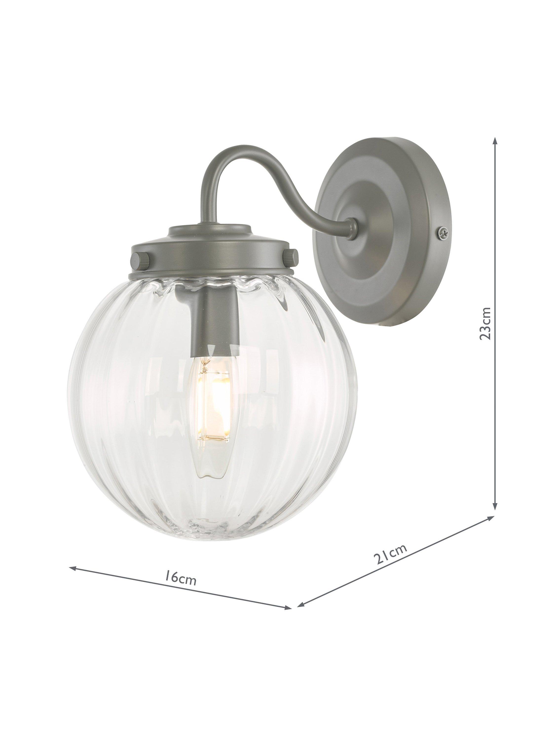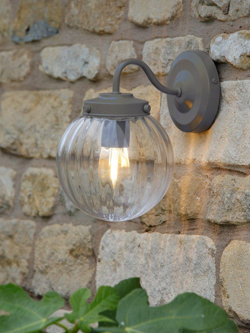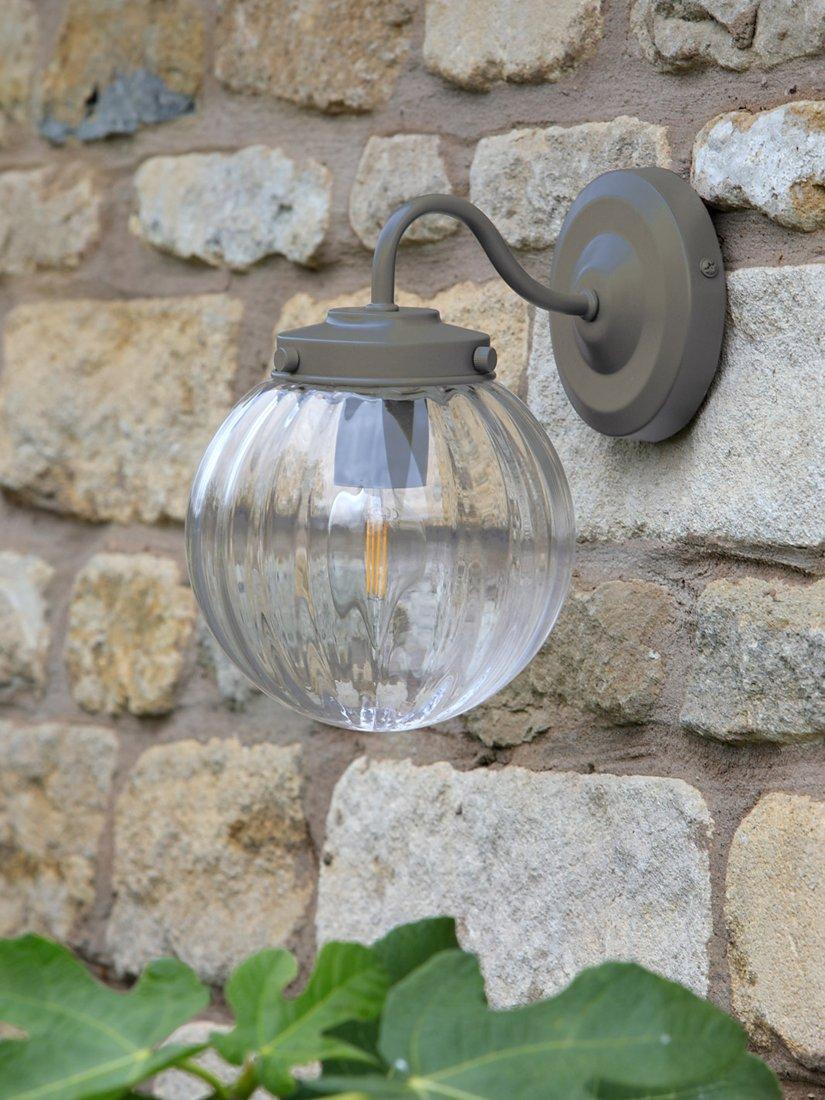 Laura Ashley’s Georgie wall light is designed with a graceful swan neck. The clear glass globe shade has soft ribbing on the inside which create highlights when lit. This outdoor wall light is finished in a soft grey, matt, powder-coated paint and is perfect for fitting, beside or over a doorway. Bulb not included.
