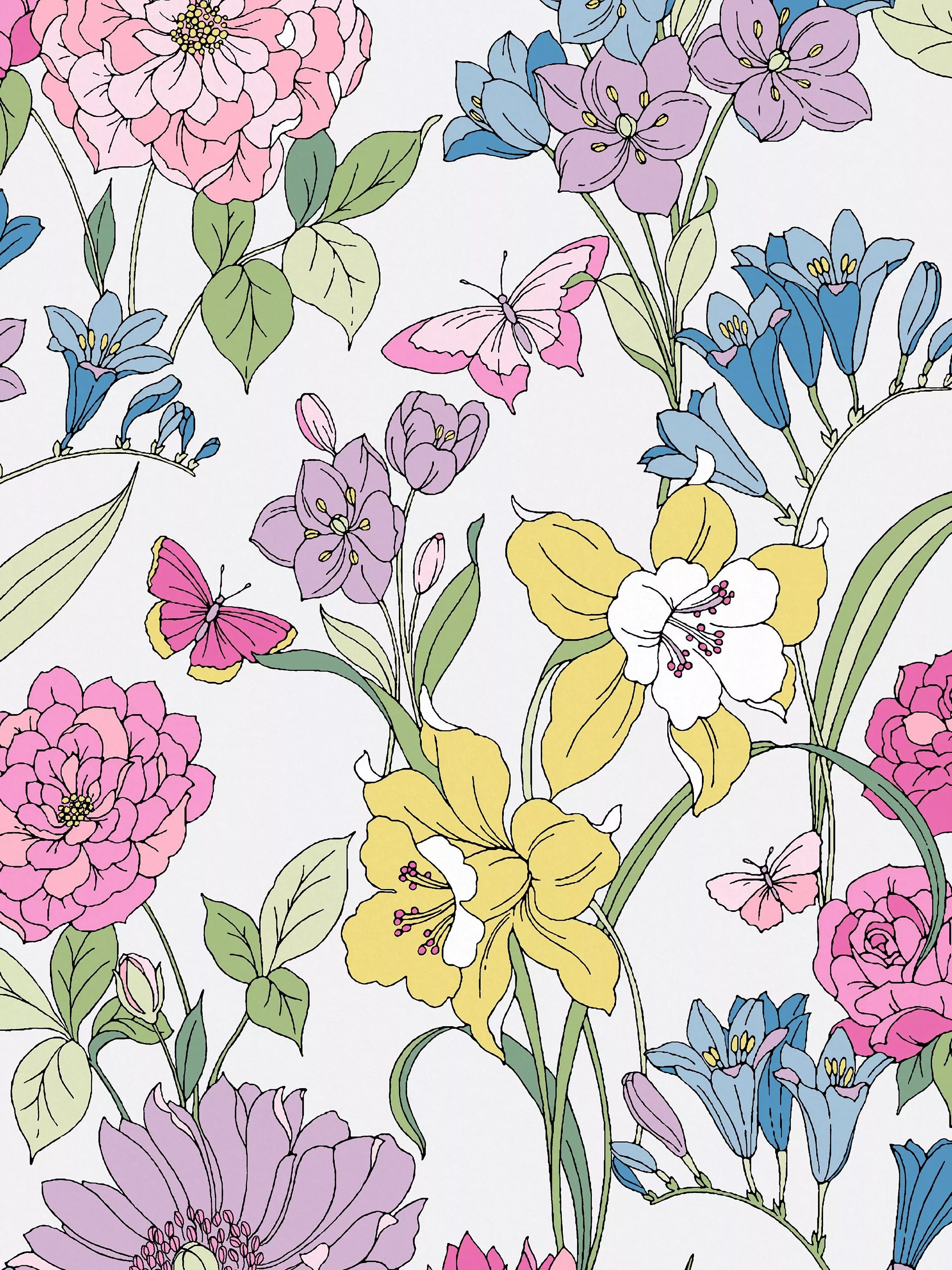 Inspired by a piece of painted artwork, this charming line-drawn floral design features an abundance of stylised blooms like dahlias, daffodils and delphiniums forming a continuous pattern. Delicate butterflies perch on curling stems in this striking print.