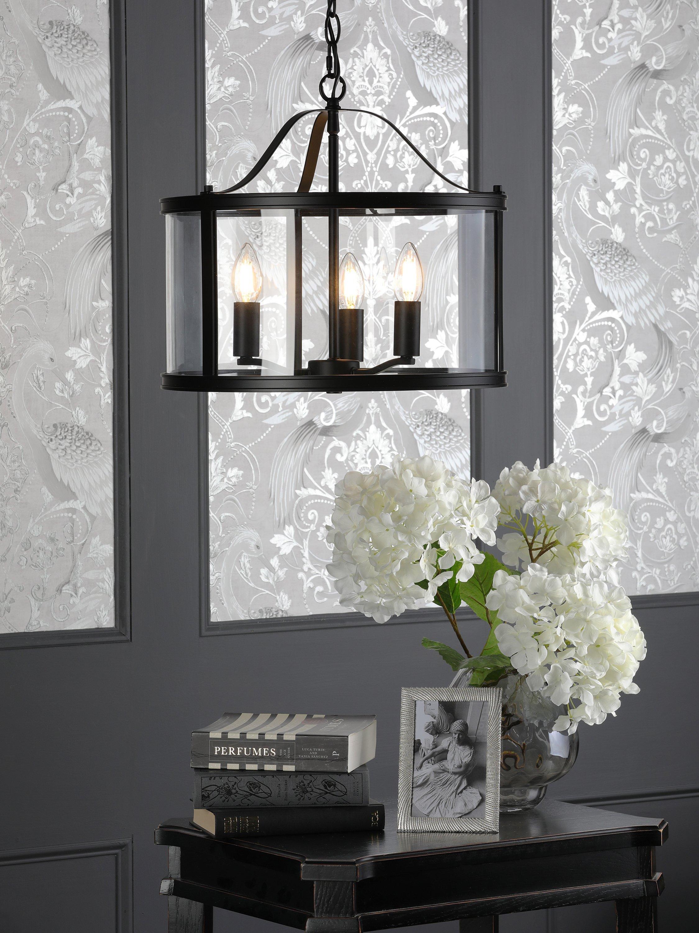 The clean lined Laura Ashley Harrington ceiling pendant light is a graceful blend of clear glass and sleek metal. A simple, lantern style case surrounds a triple arm lamp-holder, with a vintage finish for an effortlessly elegant look. This stylish piece will illuminate your favourite room and create a bright, inviting space. Height adjustable at the point of installation.
