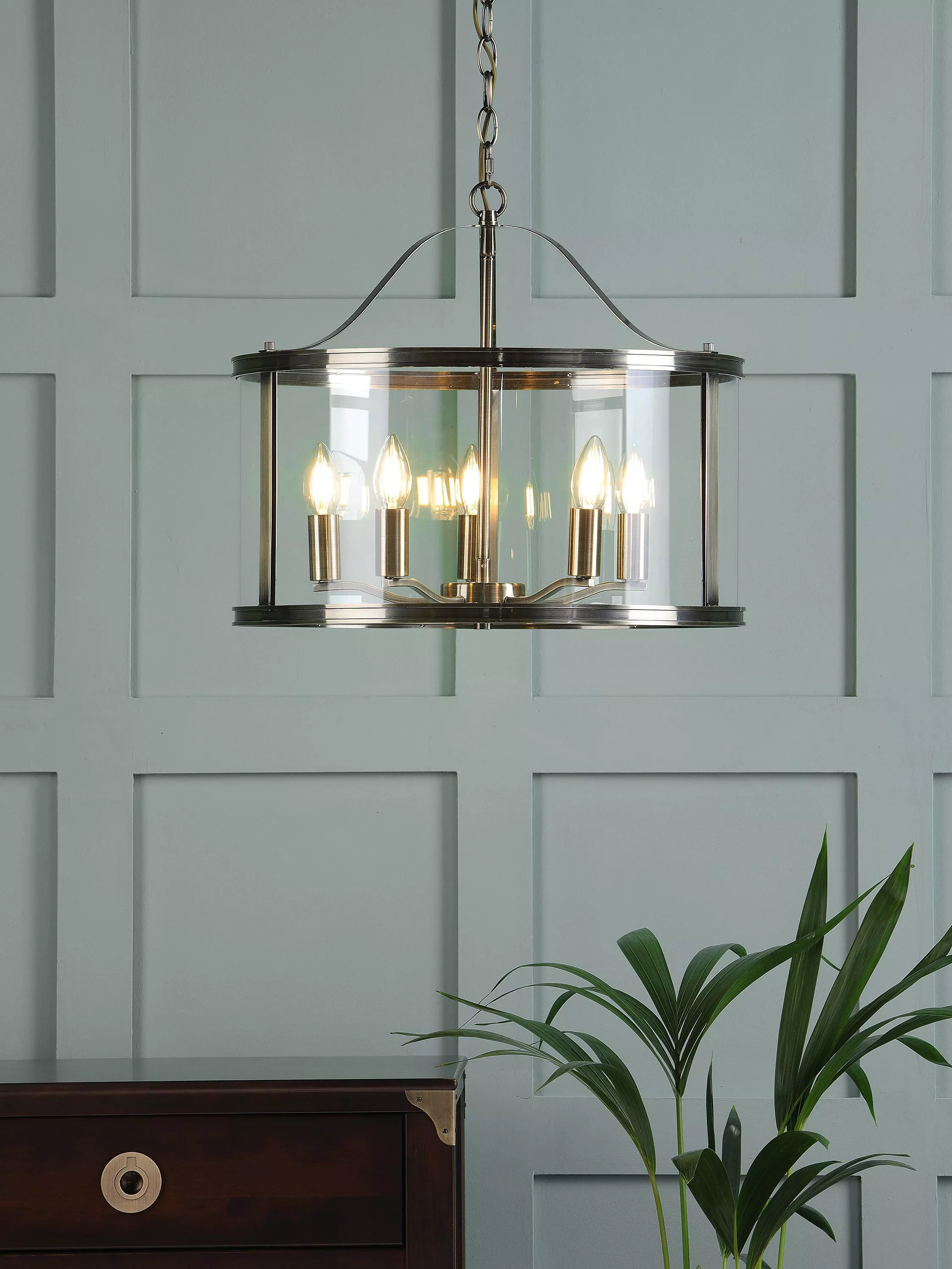 The clean lined Laura Ashley Harrington ceiling light is a graceful blend of clear glass and sleek metal. A simple, lantern style case surrounds a suspended quintet of lamp-holders, with a vintage finish for an effortlessly elegant look. This five light piece will illuminate your favourite room and create a bright, inviting space. A matching ceiling rose and hanging chain are included. The discreet cable is height adjustable at the point of installation.