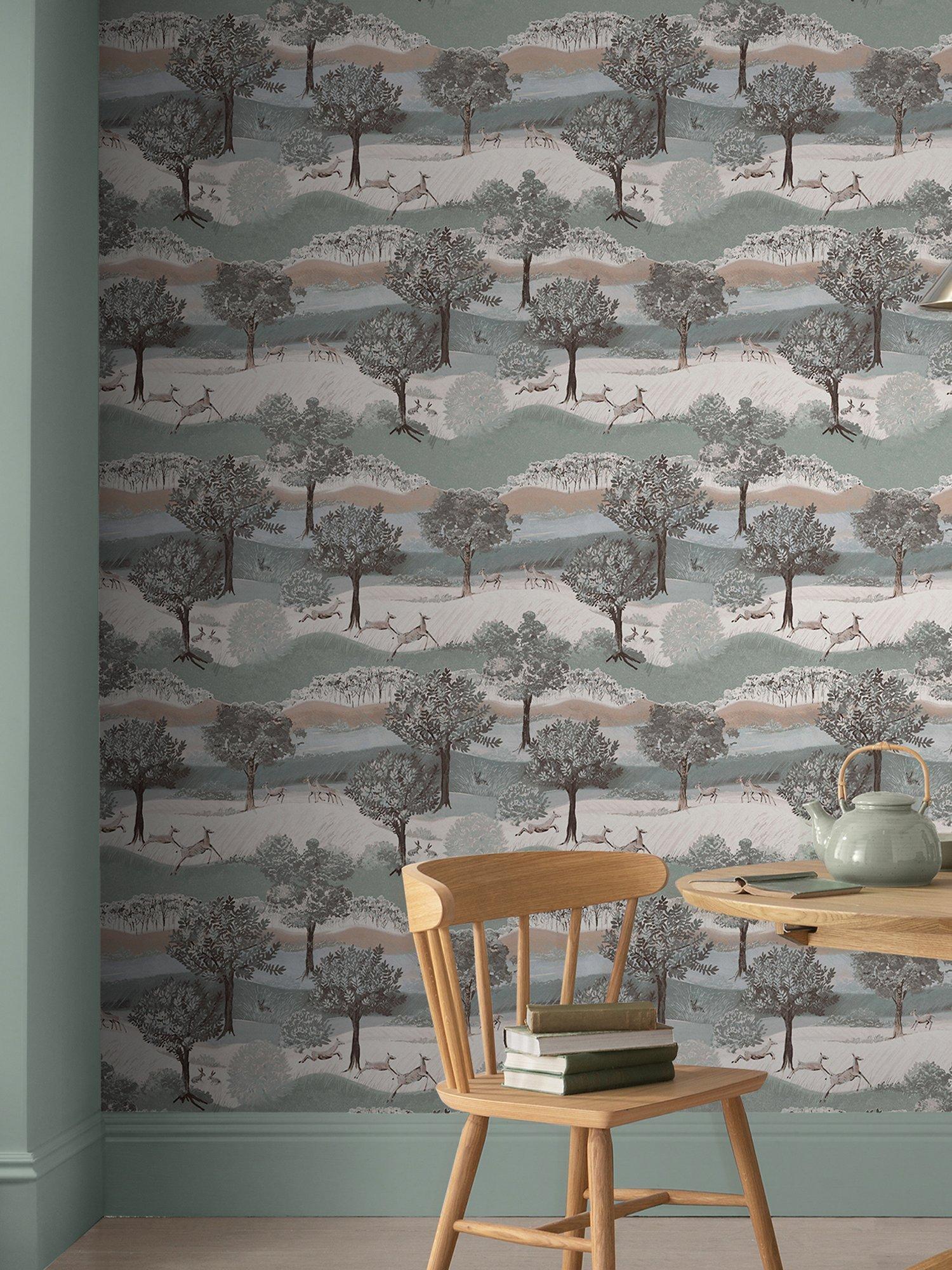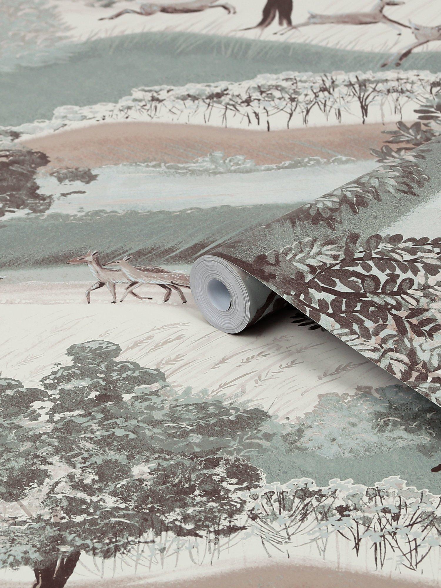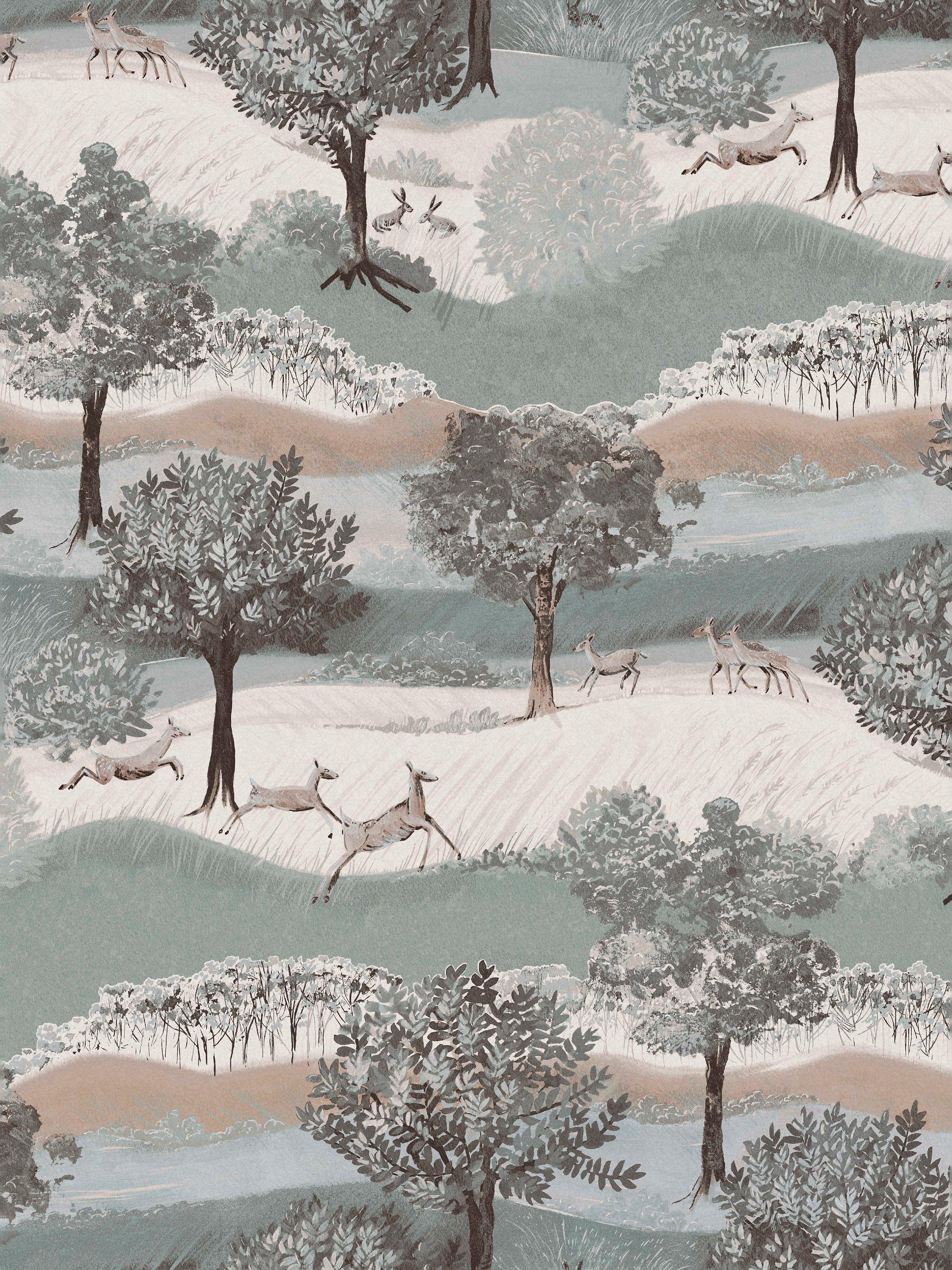 This charming print illustrates a countryside scene with leaping deers, trees, rolling fields and hills.
