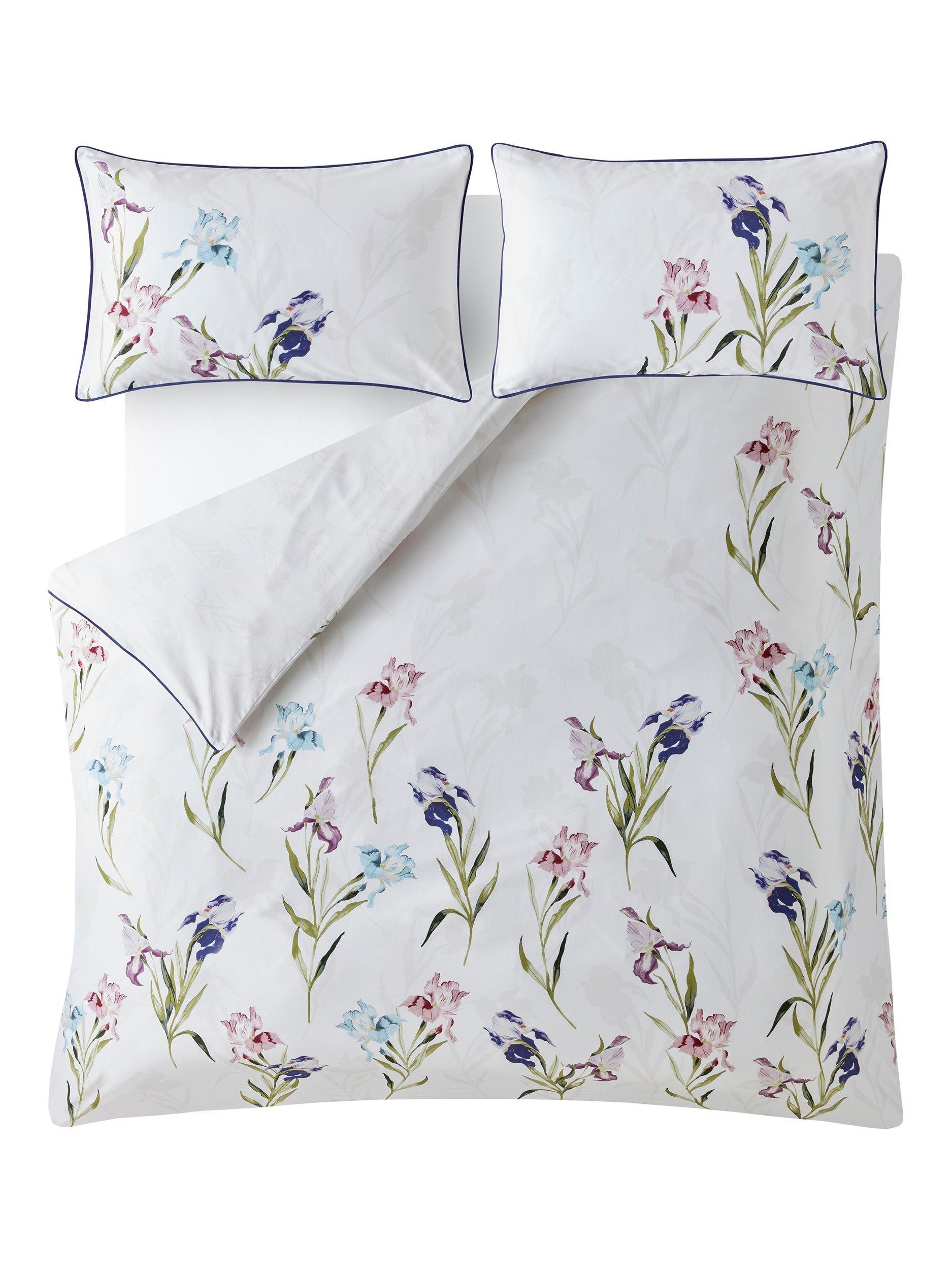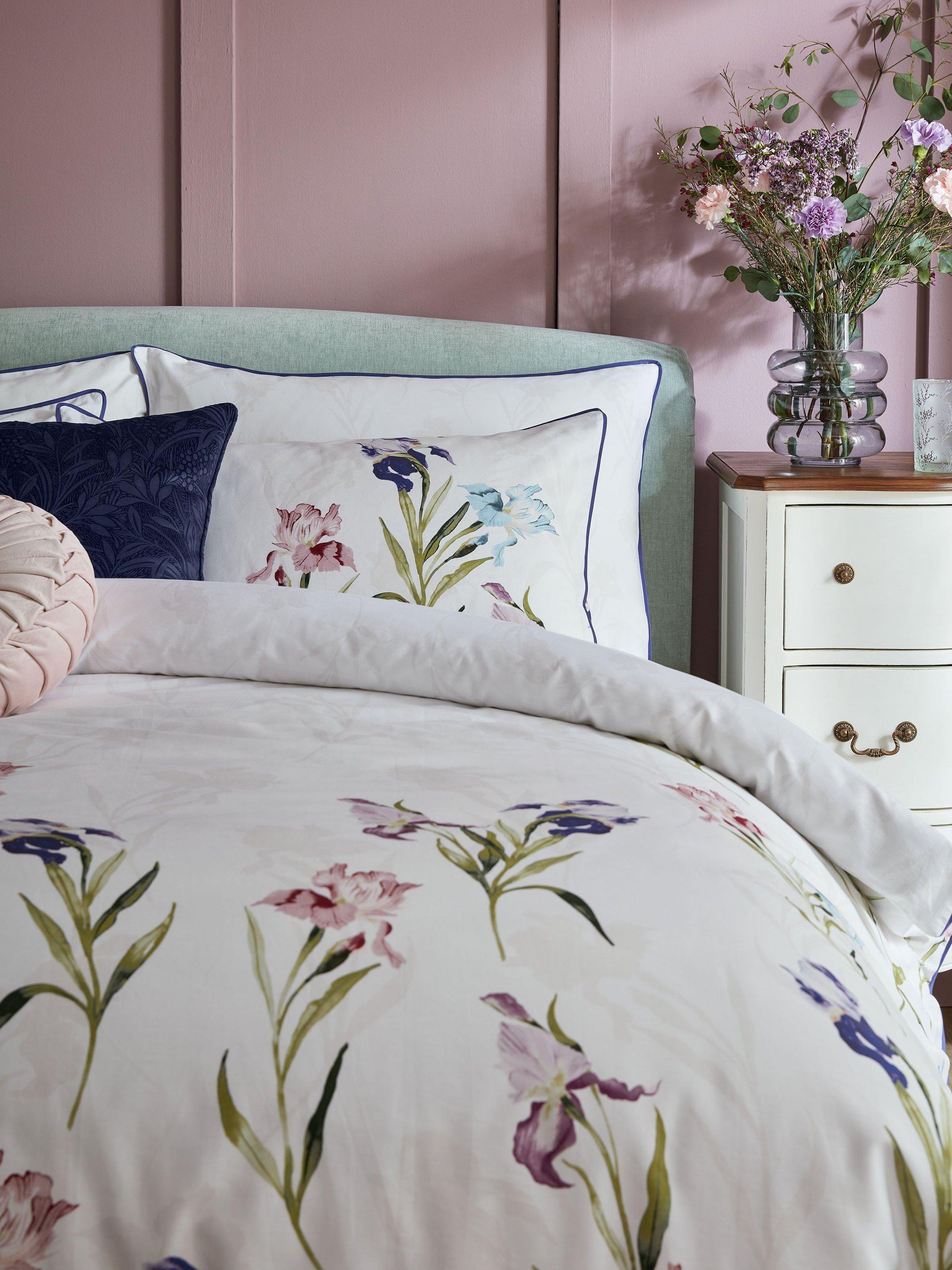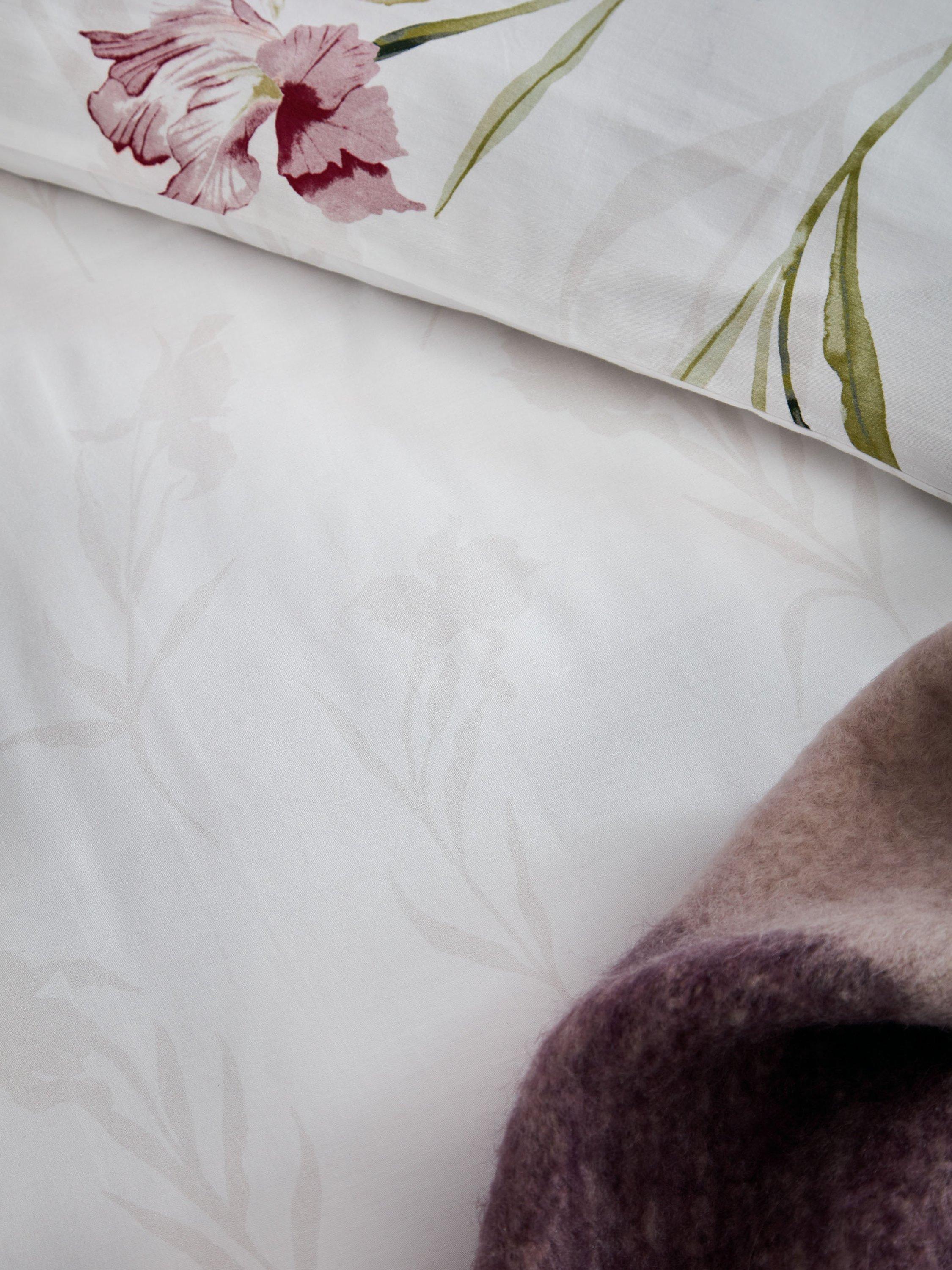 Trailing stems of iris flowers, in beautiful jewel tones, decorate this luxurious 220 thread count cotton sateen bedding. With a soft silhouette floral reverse and finished with a deep purple flat piped detail, this elegant bed set will make a striking floral statement.