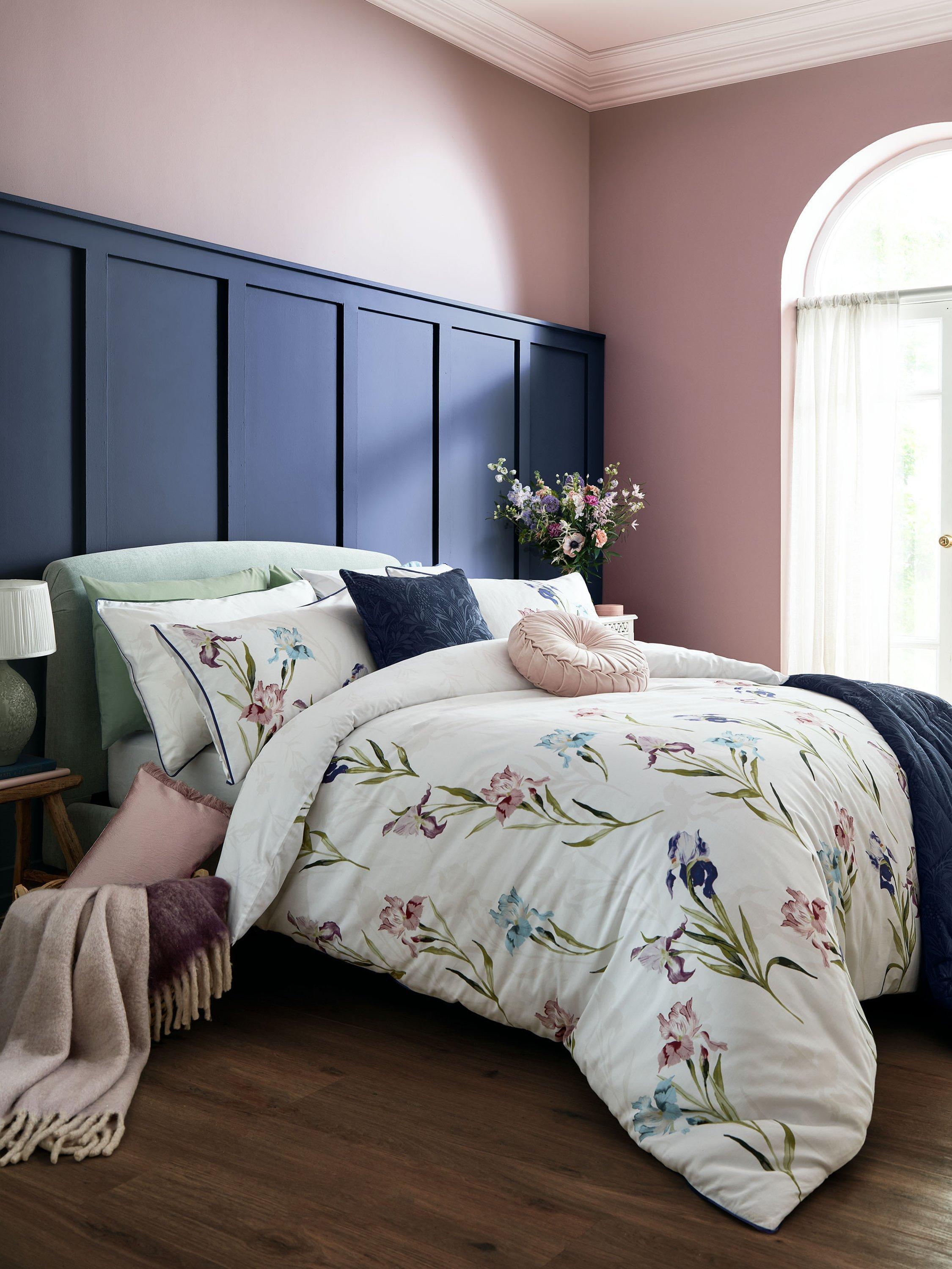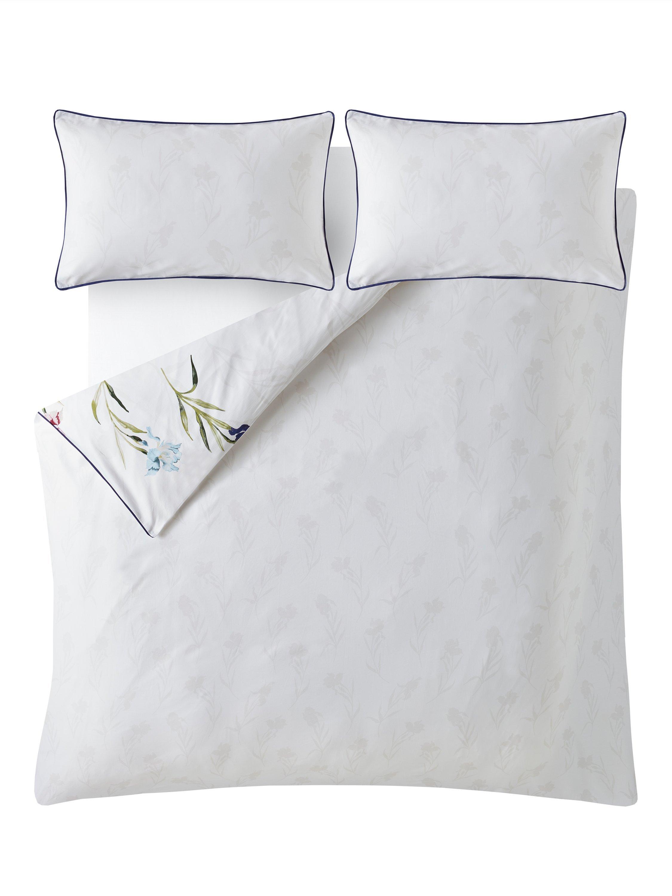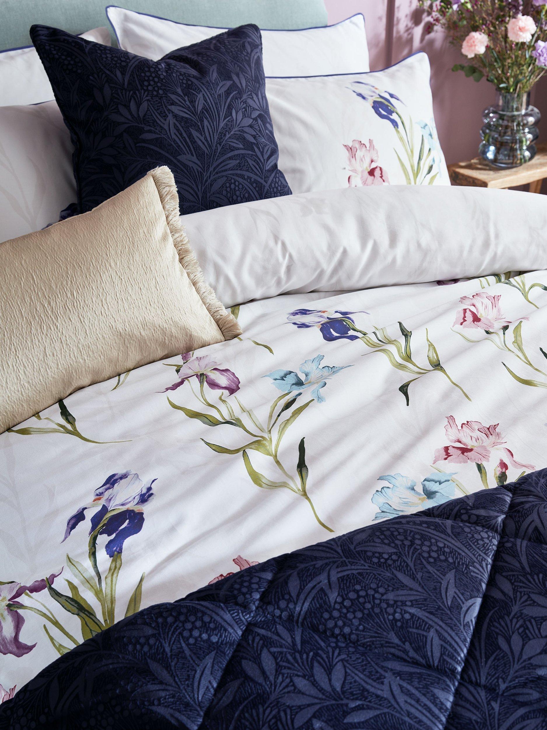 Trailing stems of iris flowers, in beautiful jewel tones, decorate this luxurious 220 thread count cotton sateen bedding. With a soft silhouette floral reverse and finished with a deep purple flat piped detail, this elegant bed set will make a striking floral statement.