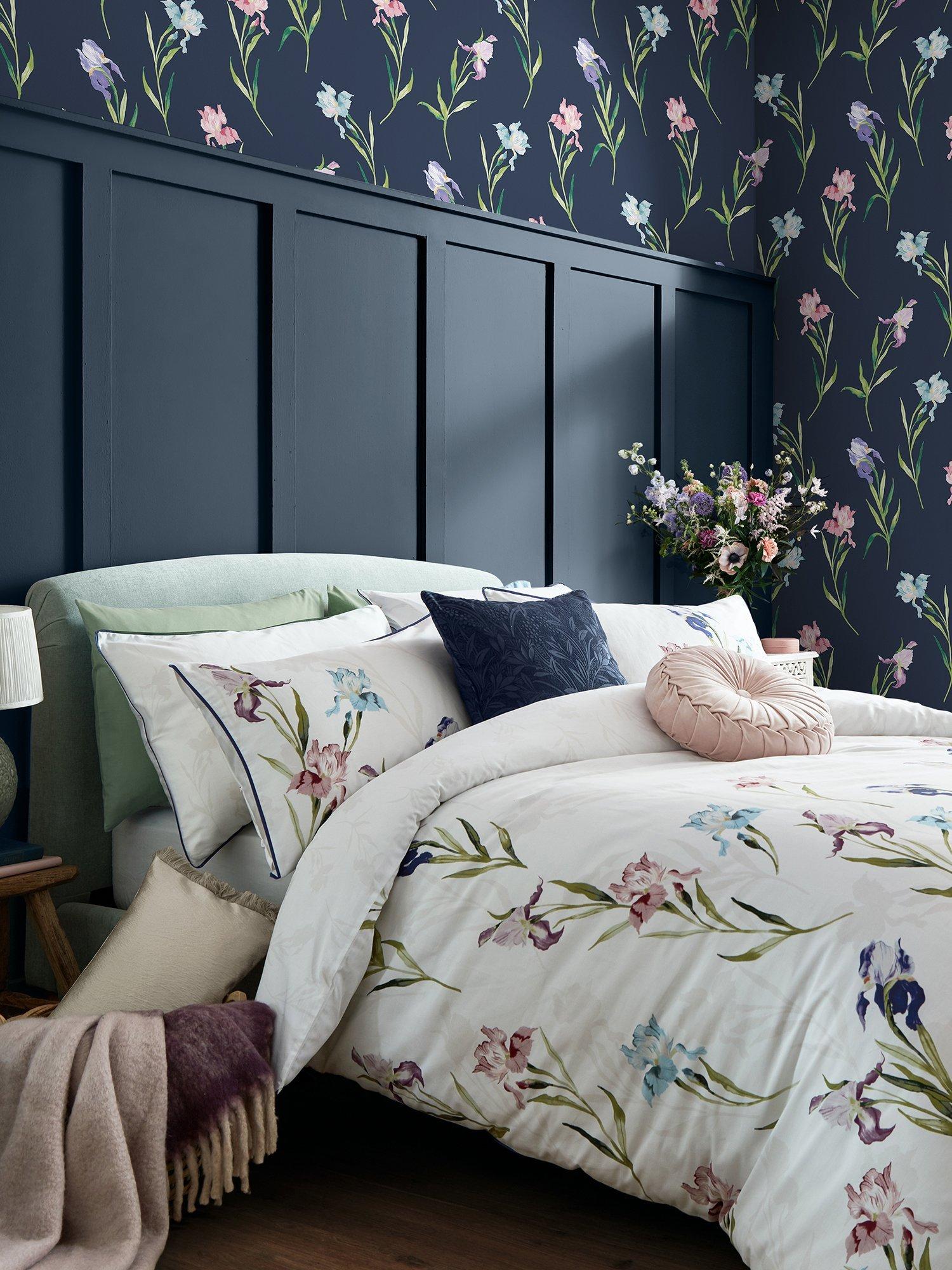 A striking floral print in watercolour, the Hawling wallpaper showcases the trailing stems of iris flowers.