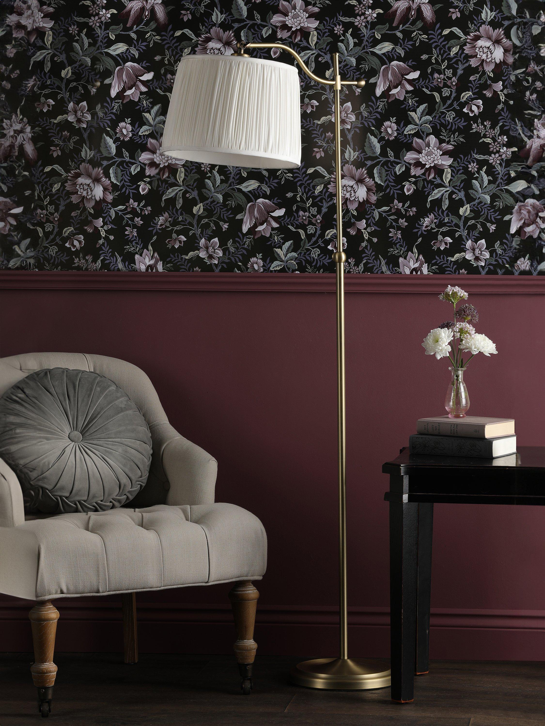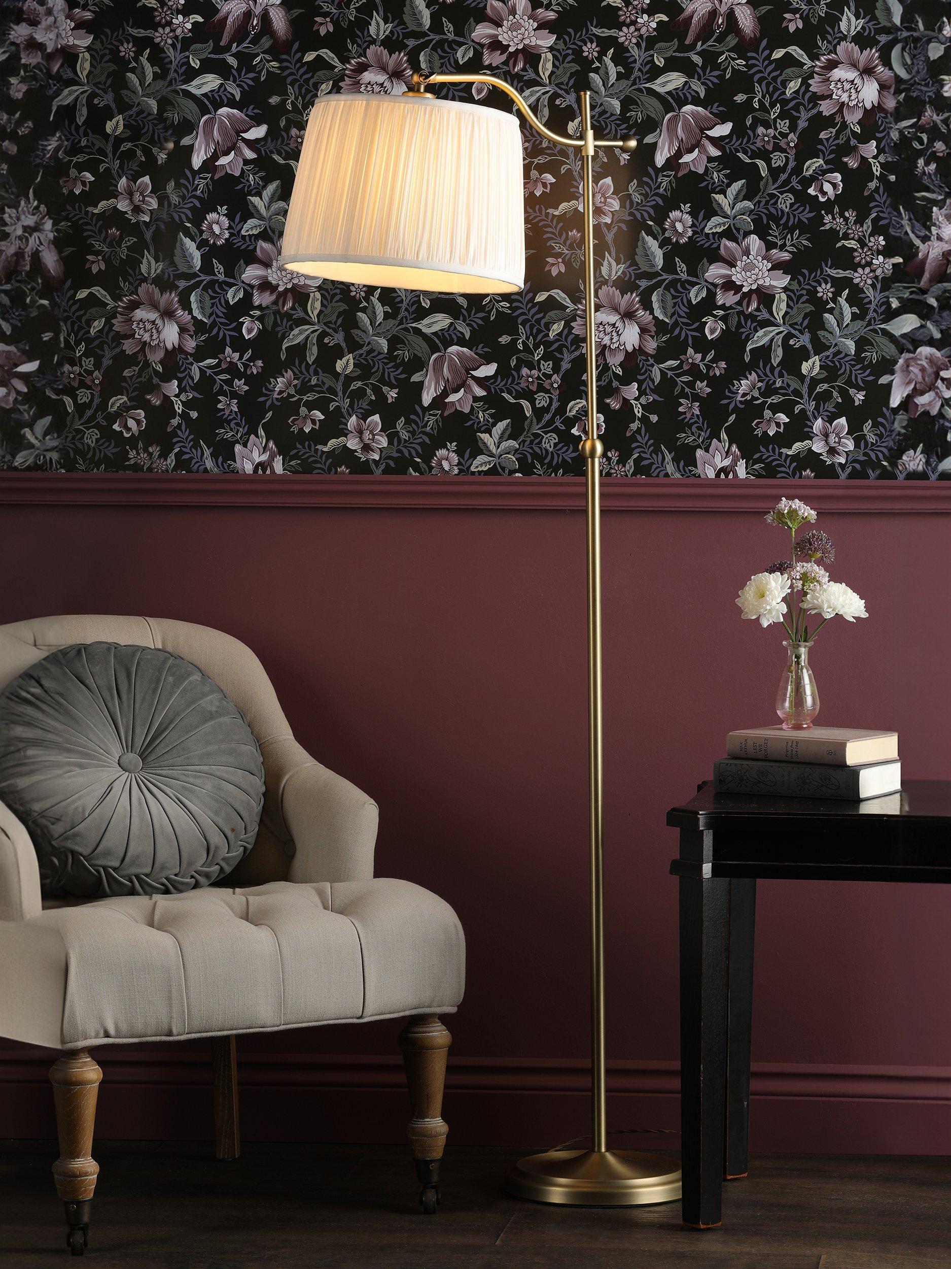 Pick this floor lamp for your cosy reading corner. Its curved arm design means it's positioned perfectly to cast light where you need it. It's made from metal with a sturdy base, teamed with a pleated shade.