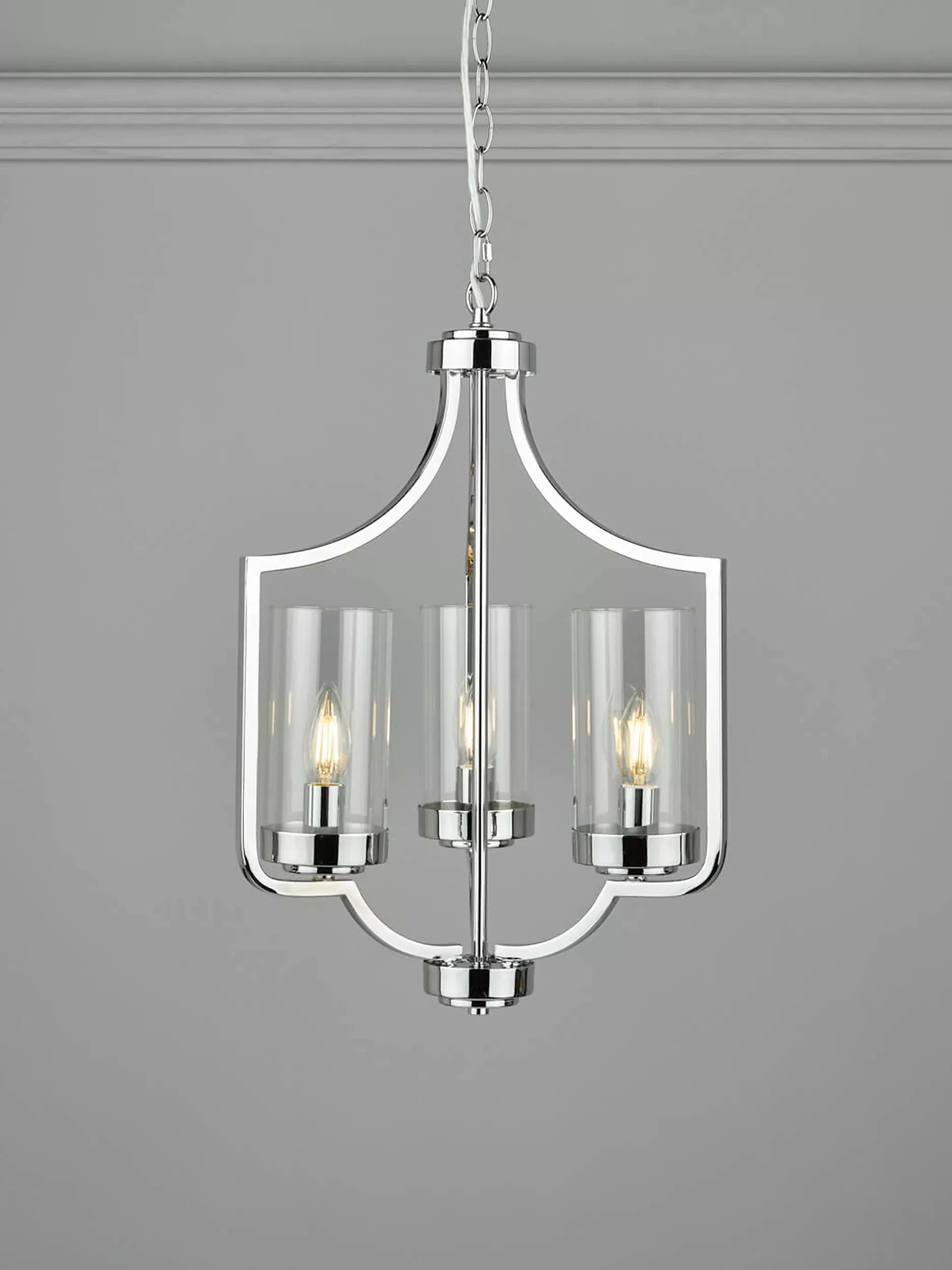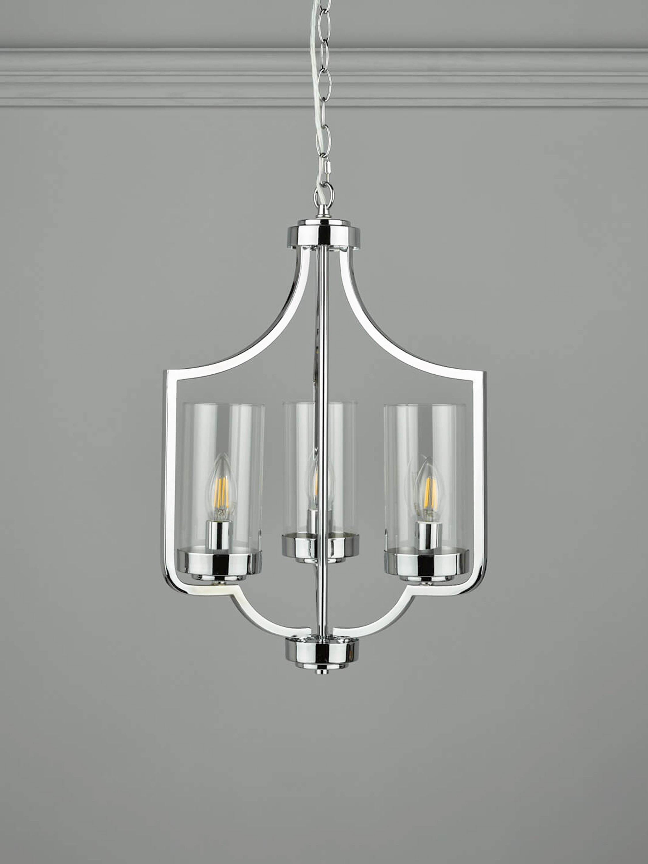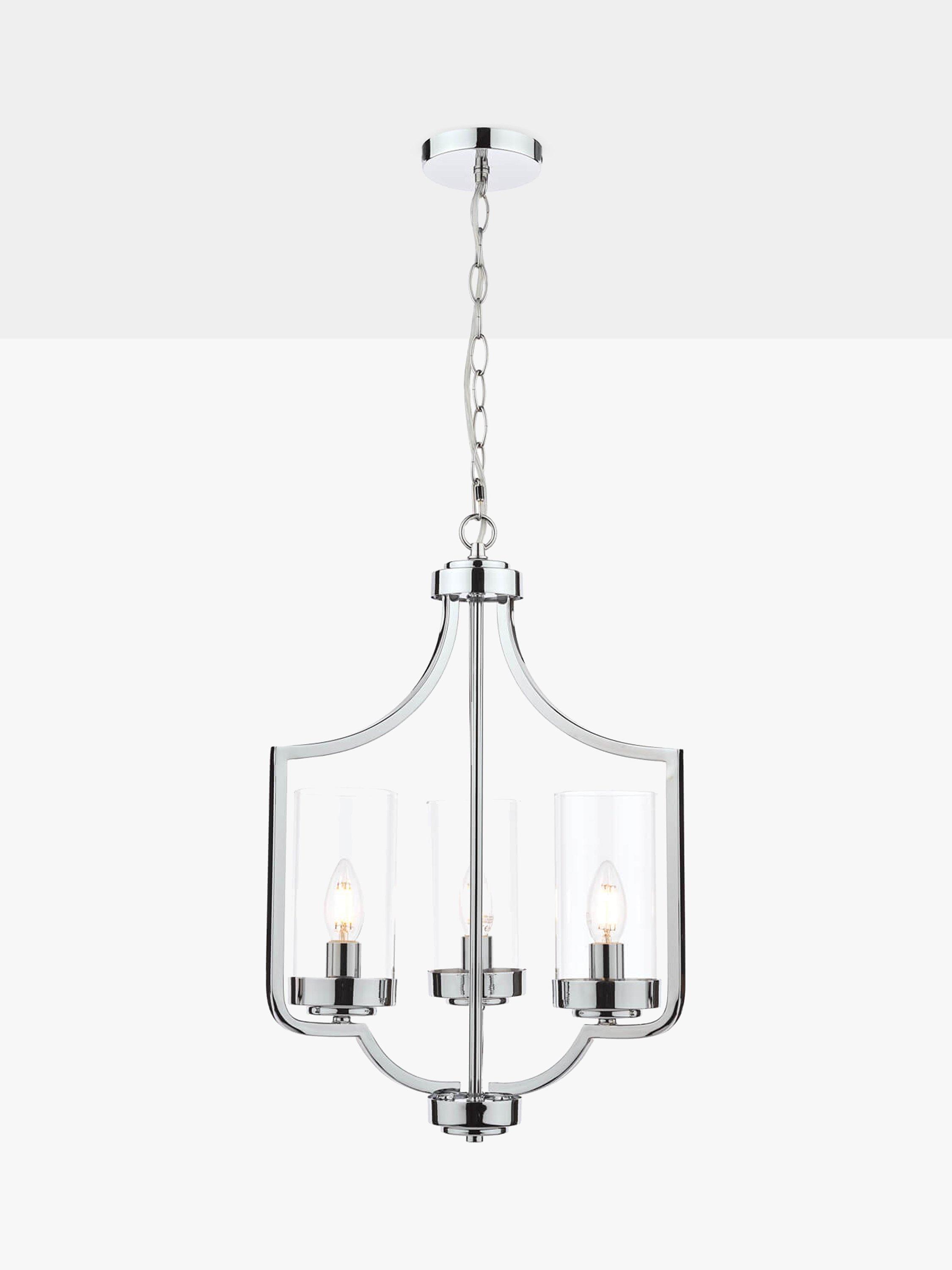 The design of this ceiling light takes inspiration from the draped form of a Moroccan tent. Made from metal with three clear glass cylinder shades, its open structure and lantern-style framework allows light to spread around your room. It's suspended from a height-adjustable hanging chain and requires three LED bulbs. Available in a warm, antique brass or more modern polished chrome finish.