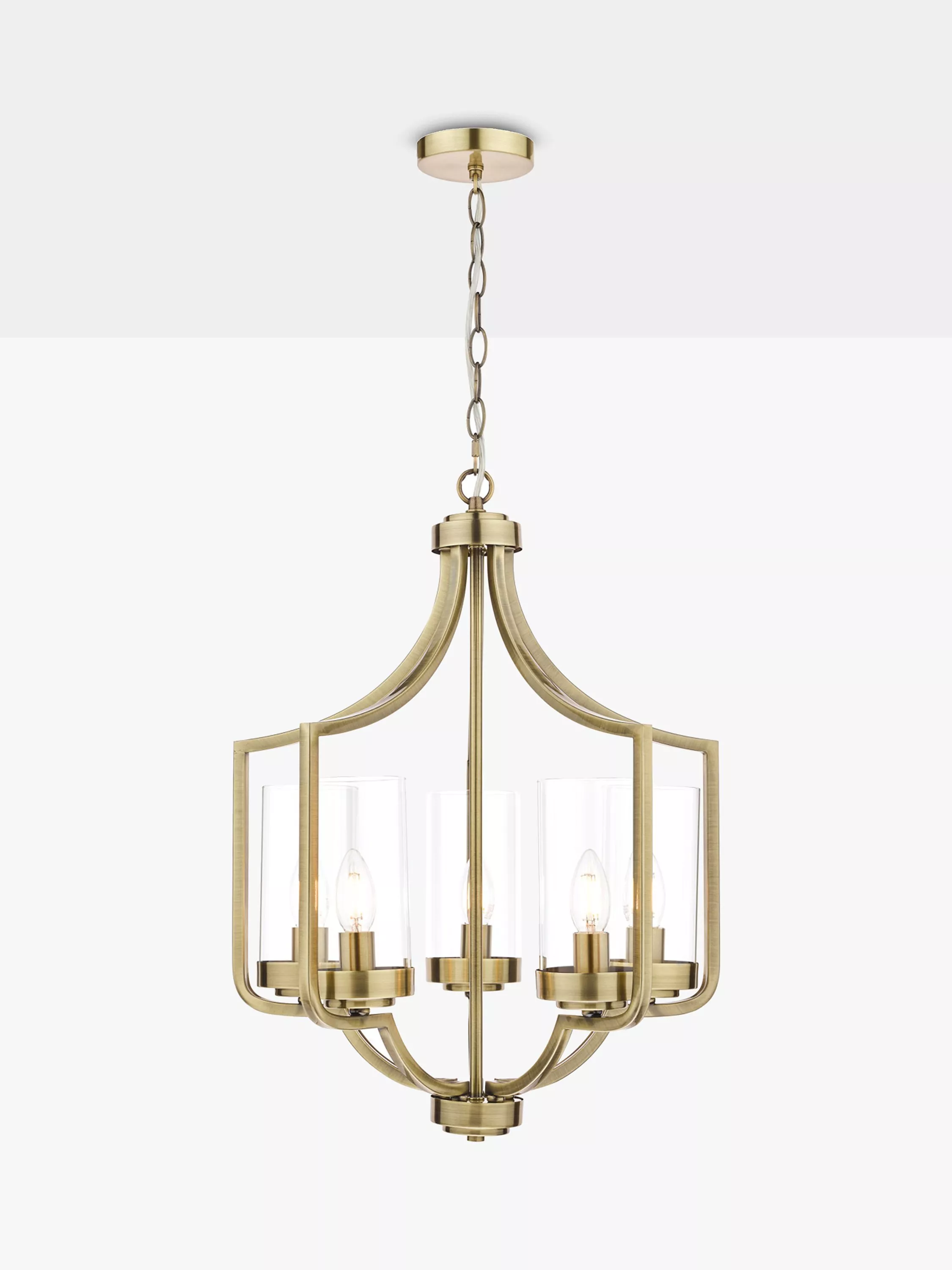 The design of this ceiling light takes inspiration from the draped form of a Moroccan tent. Made from metal with five clear glass cylinder shades, its open structure and lantern-style framework allows an effective spread of light around your room. It's suspended from a height-adjustable hanging chain and requires five LED bulbs. Available in a warm, antique brass or more modern polished chrome finish.