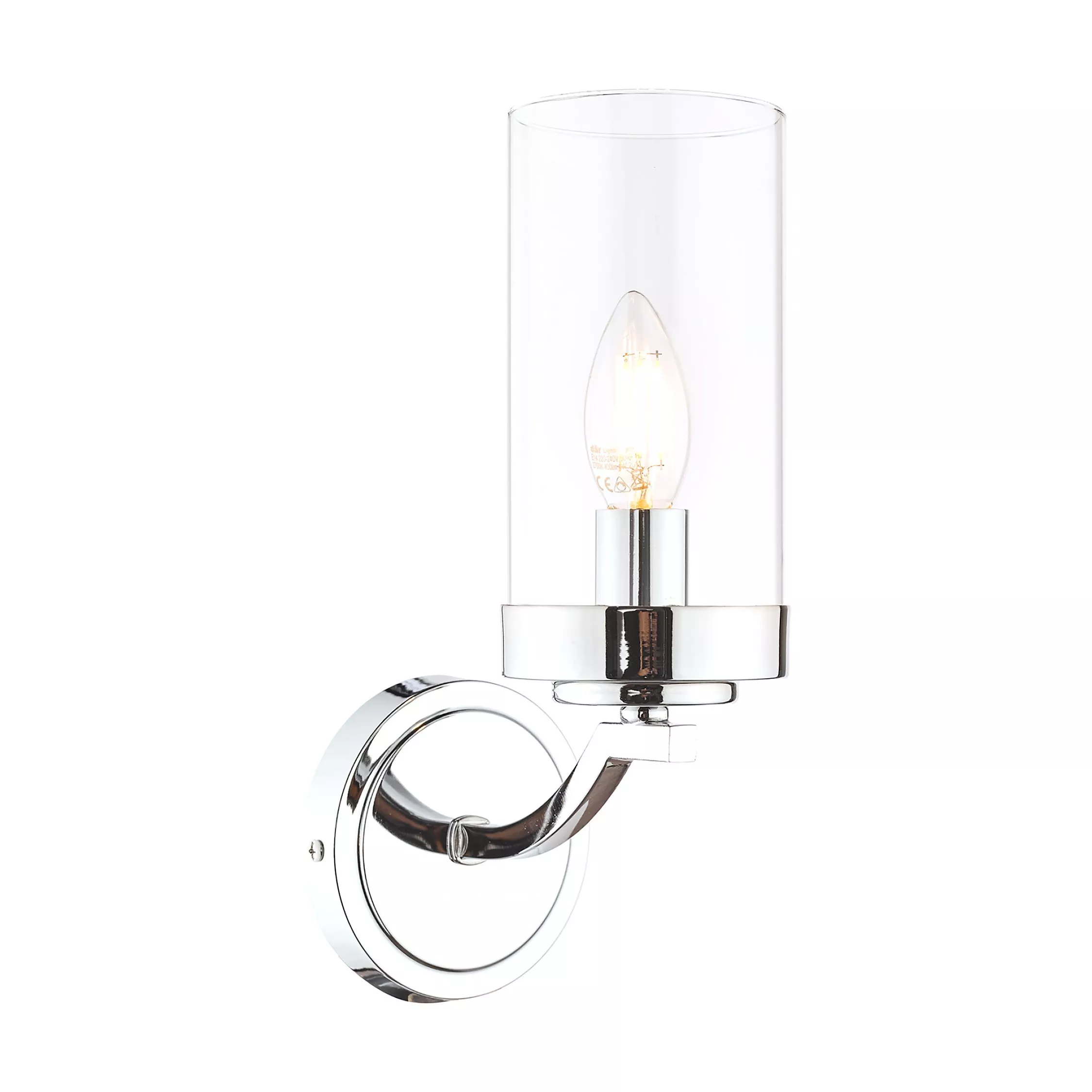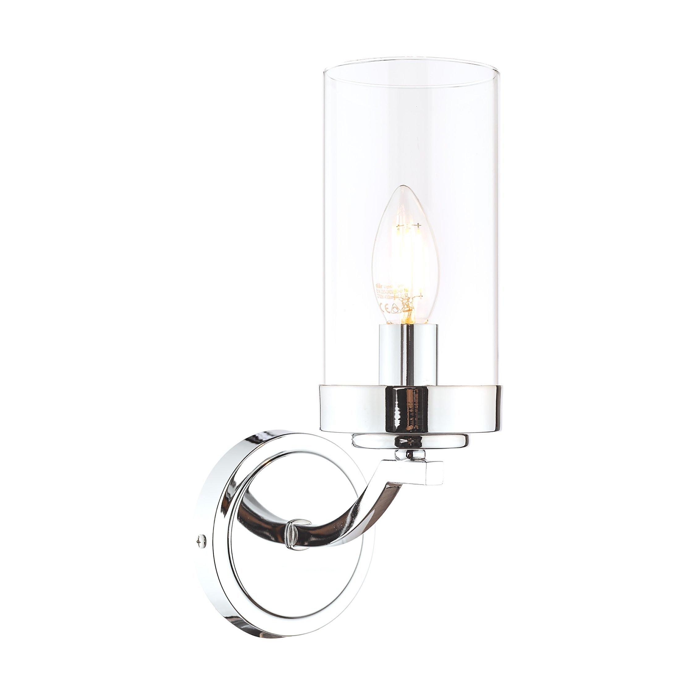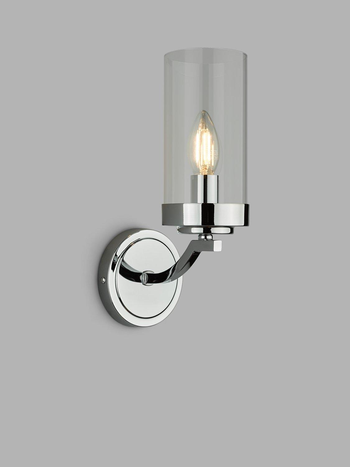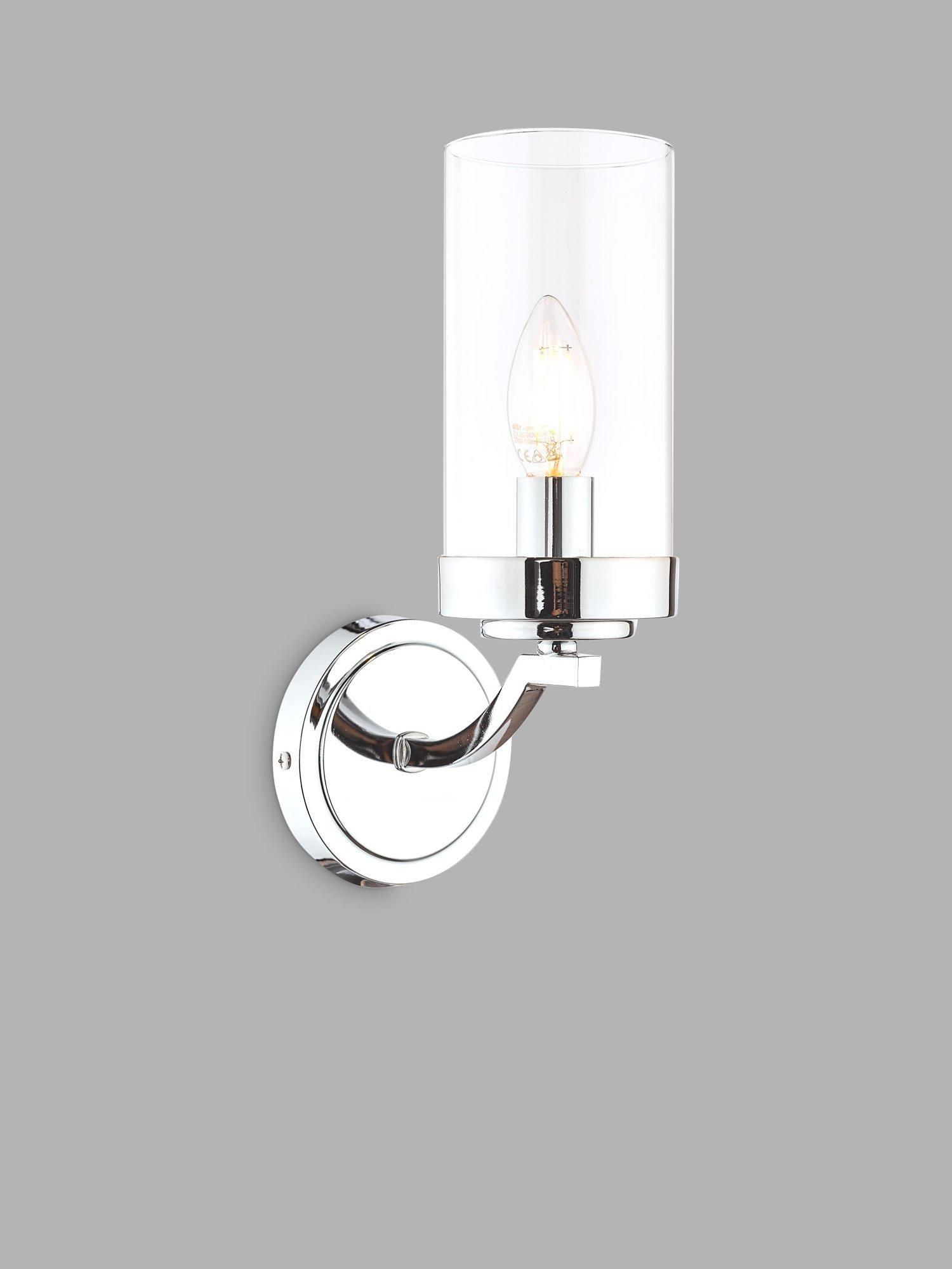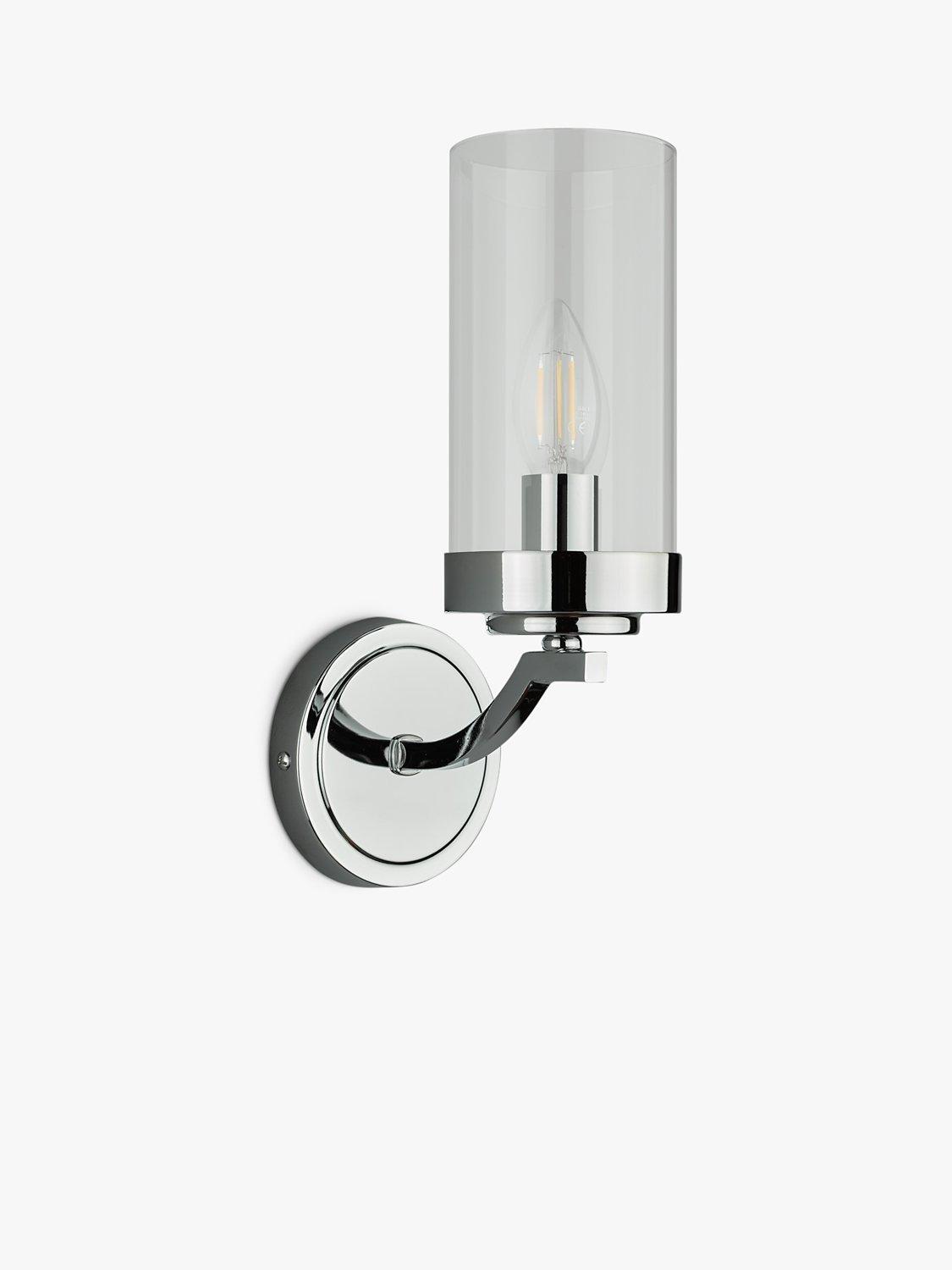 A simple, adaptable wall light, made with a sturdy metal fitting and a clear glass cylinder shade. Available in a warm antique brass or more modern chrome finish. When illuminated, it will cast a warm glow of light up the wall.