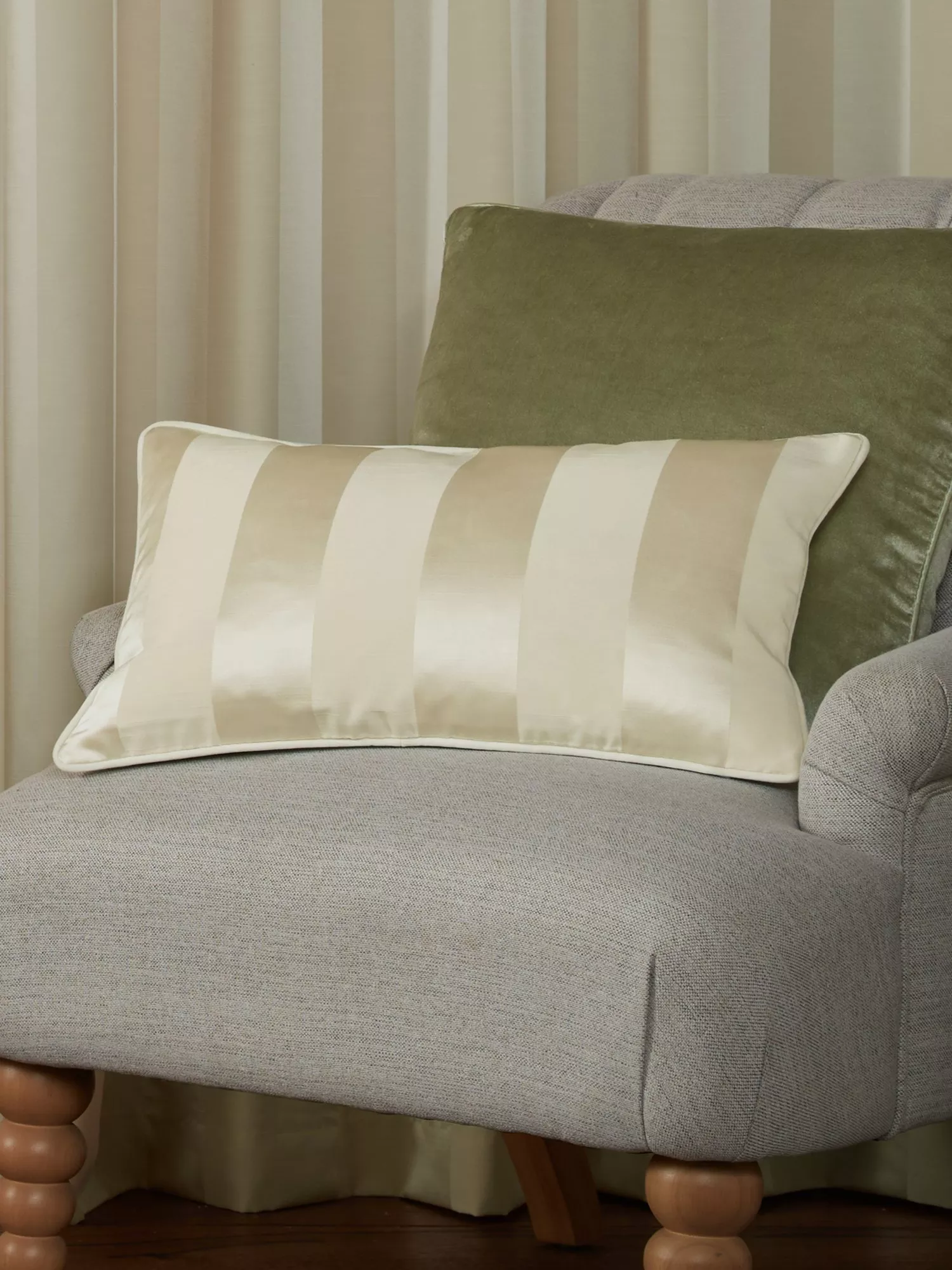 Lille stripe is a broad stripe design in tonal colours to create a sophisticated but subtle effect. A luxurious jacquard cushion face with sumptuous velvet reverse and piped edge detailing.