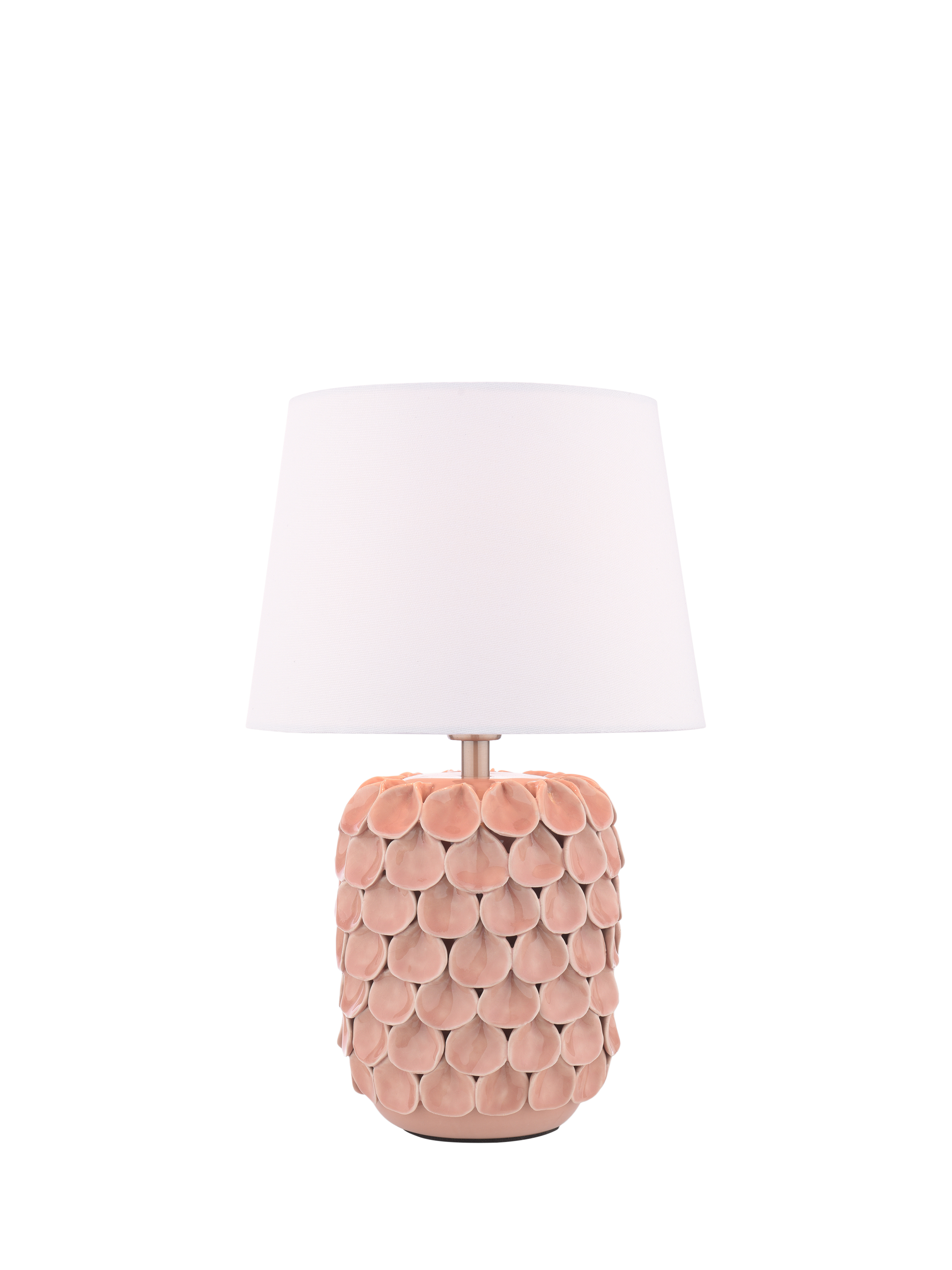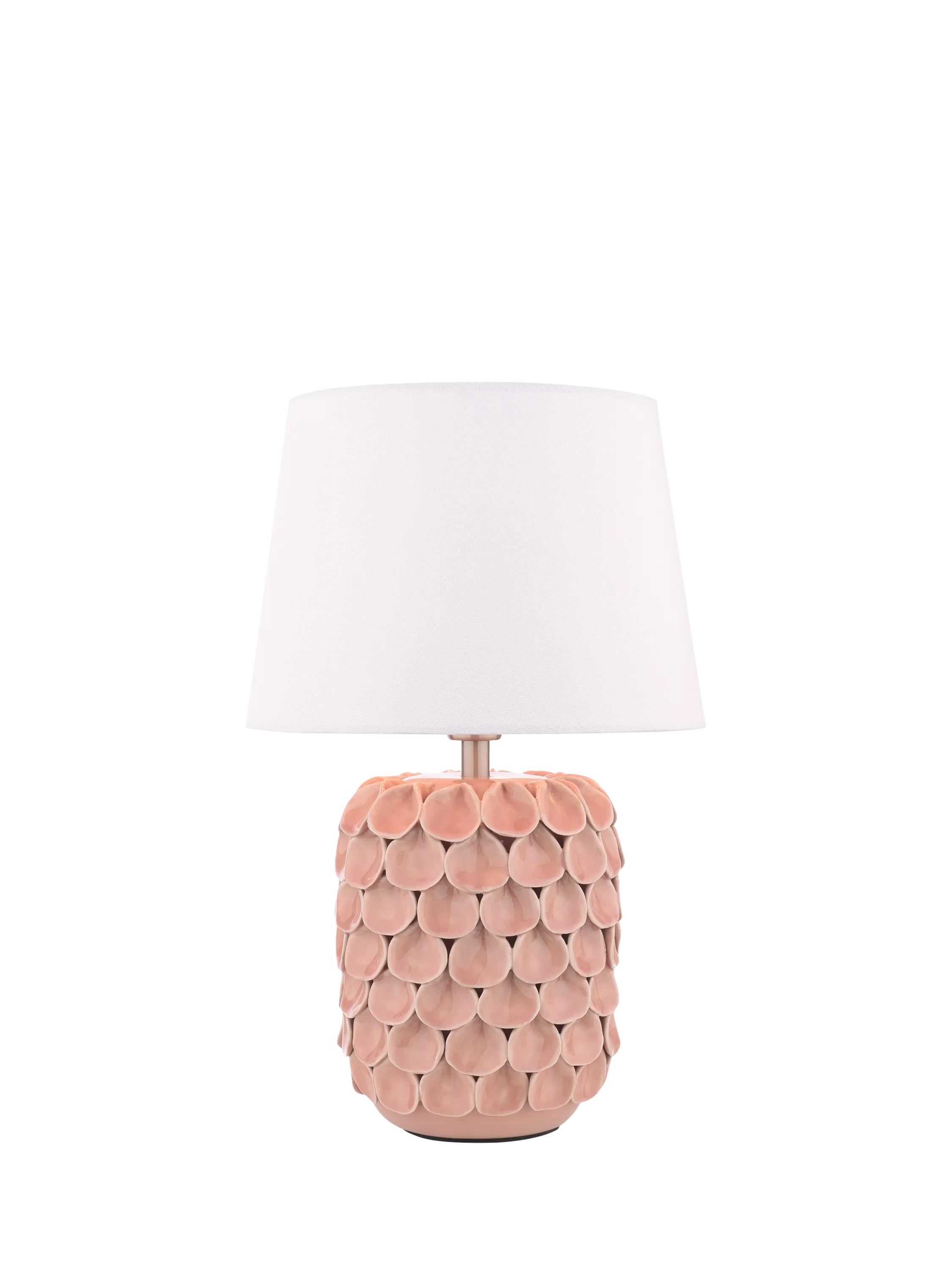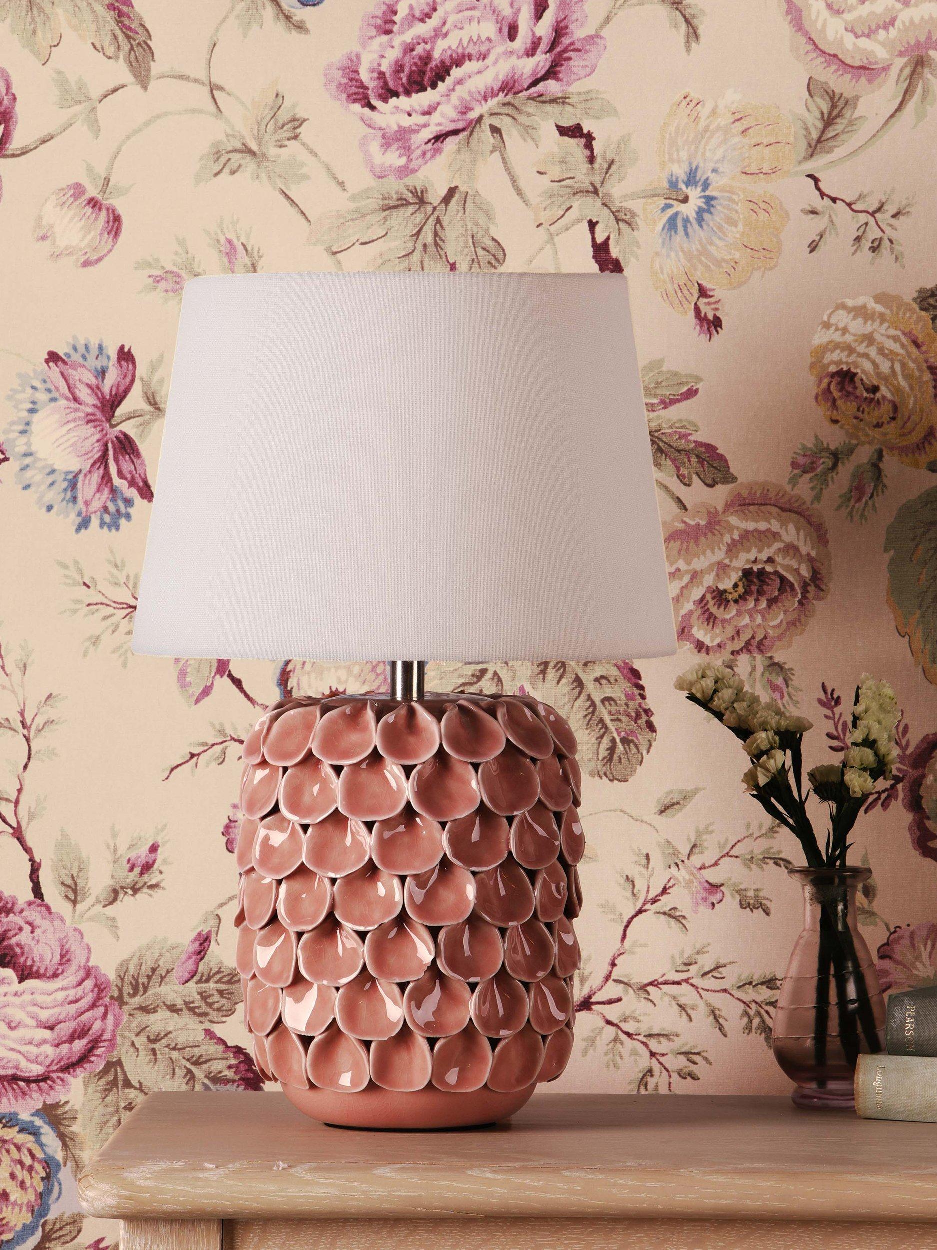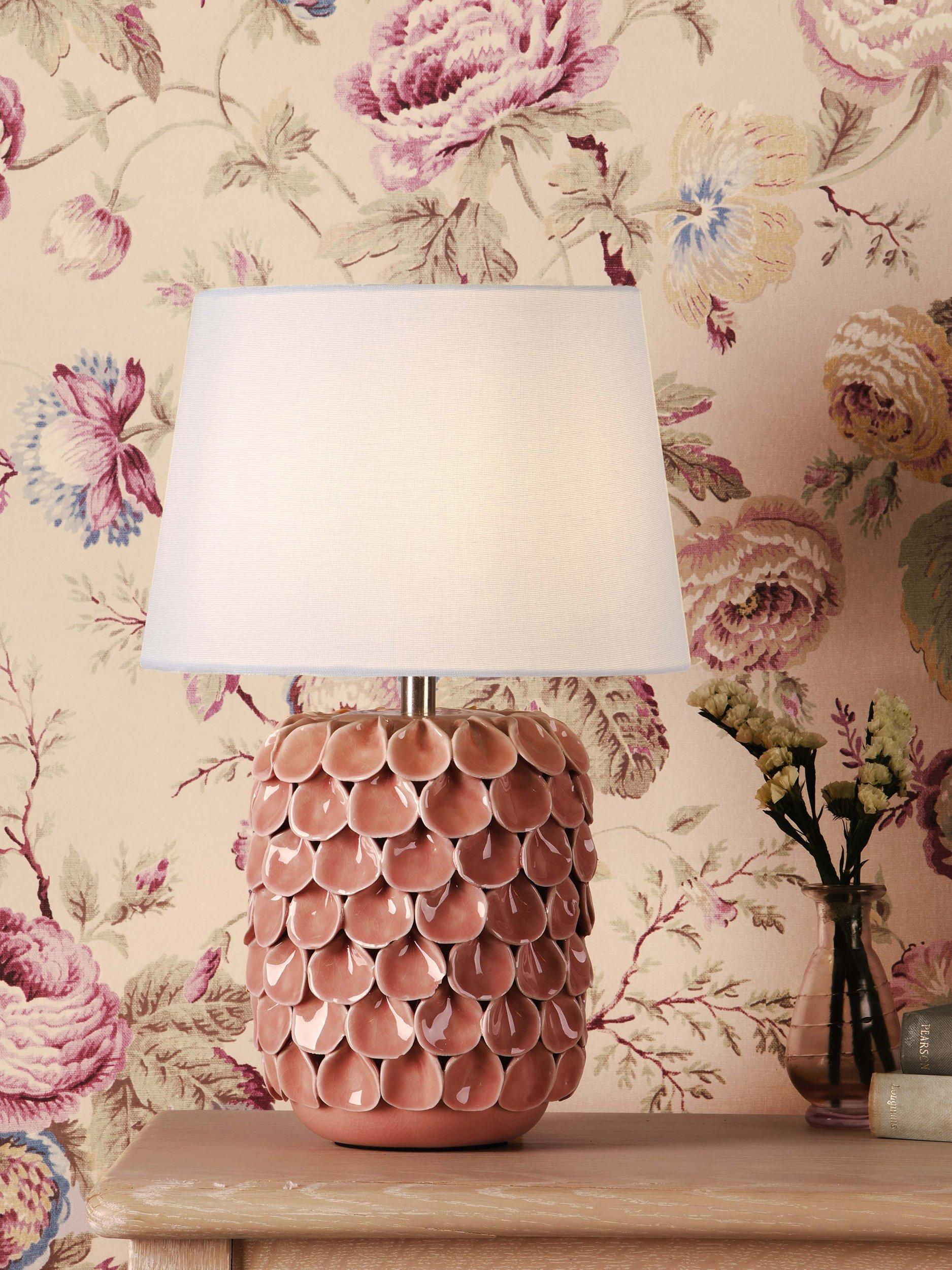 Add some personality to your home with the Laura Ashley Marwick table lamp. Its textured pink ceramic base makes an eye-catching statement, while the natural fabric shade casts a warm, inviting glow.