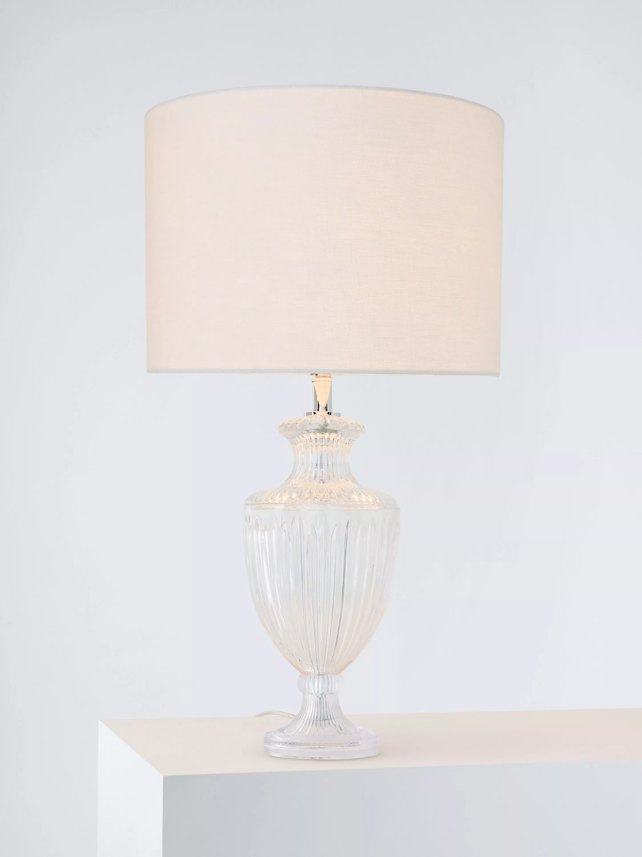 Timeless, traditional, yet so easy to style in your home. The base of this lamp is made from heavy cut glass with a fluted shape like a classical urn. It's teamed with a linen lampshade that's slightly tapered in shape and helps to soften the glow of the light. The tall size of this lamp makes it even more striking and impressive when styled in your space. One LED bulb is required.
