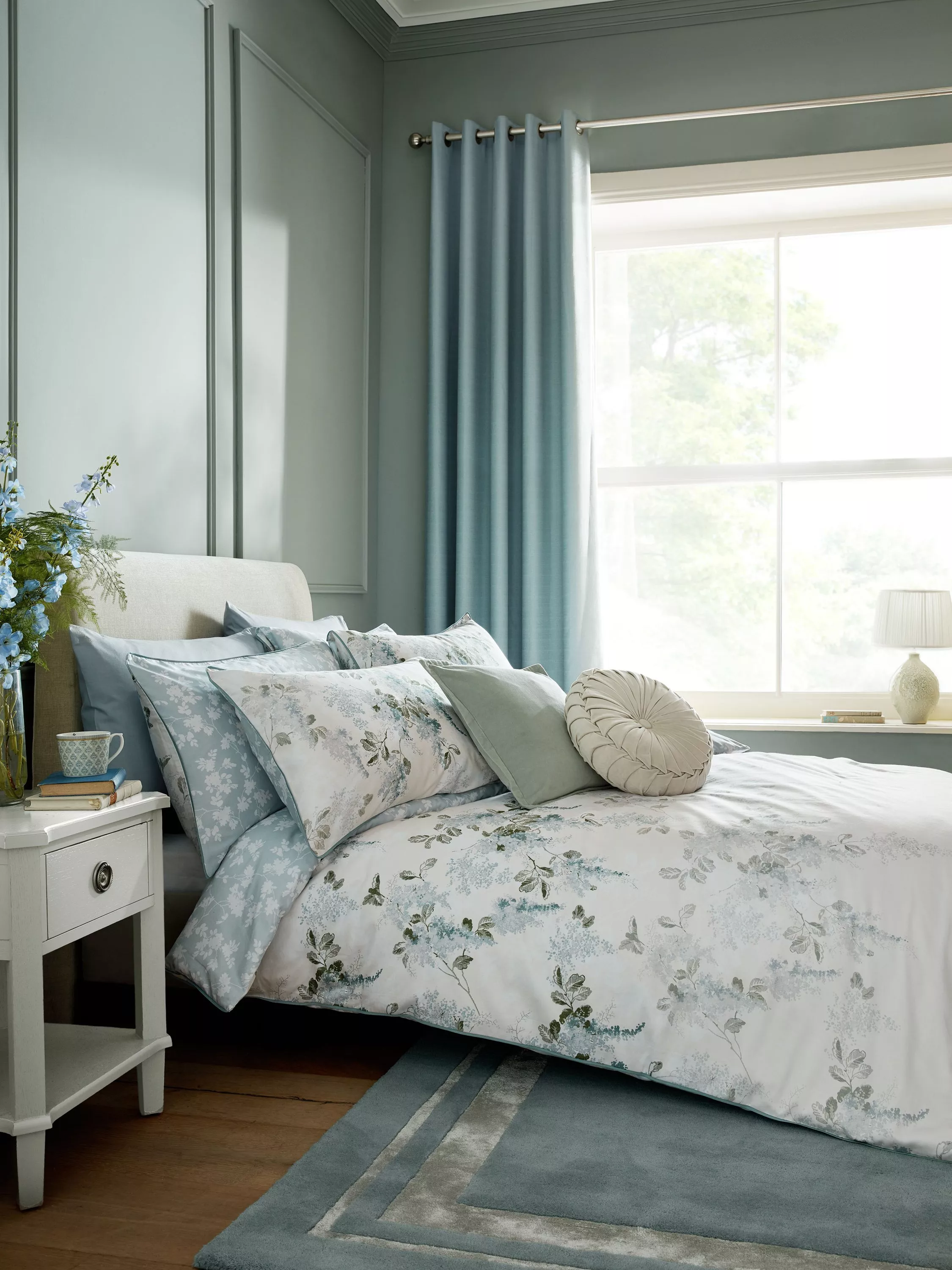 This print welcomes the freshness of spring indoors. Subtle shades of blue and greens add a fresh and elegant feel, enhanced through a luxurious 220 thread count cotton sateen base and finished with a sophisticated flat pipe edge.