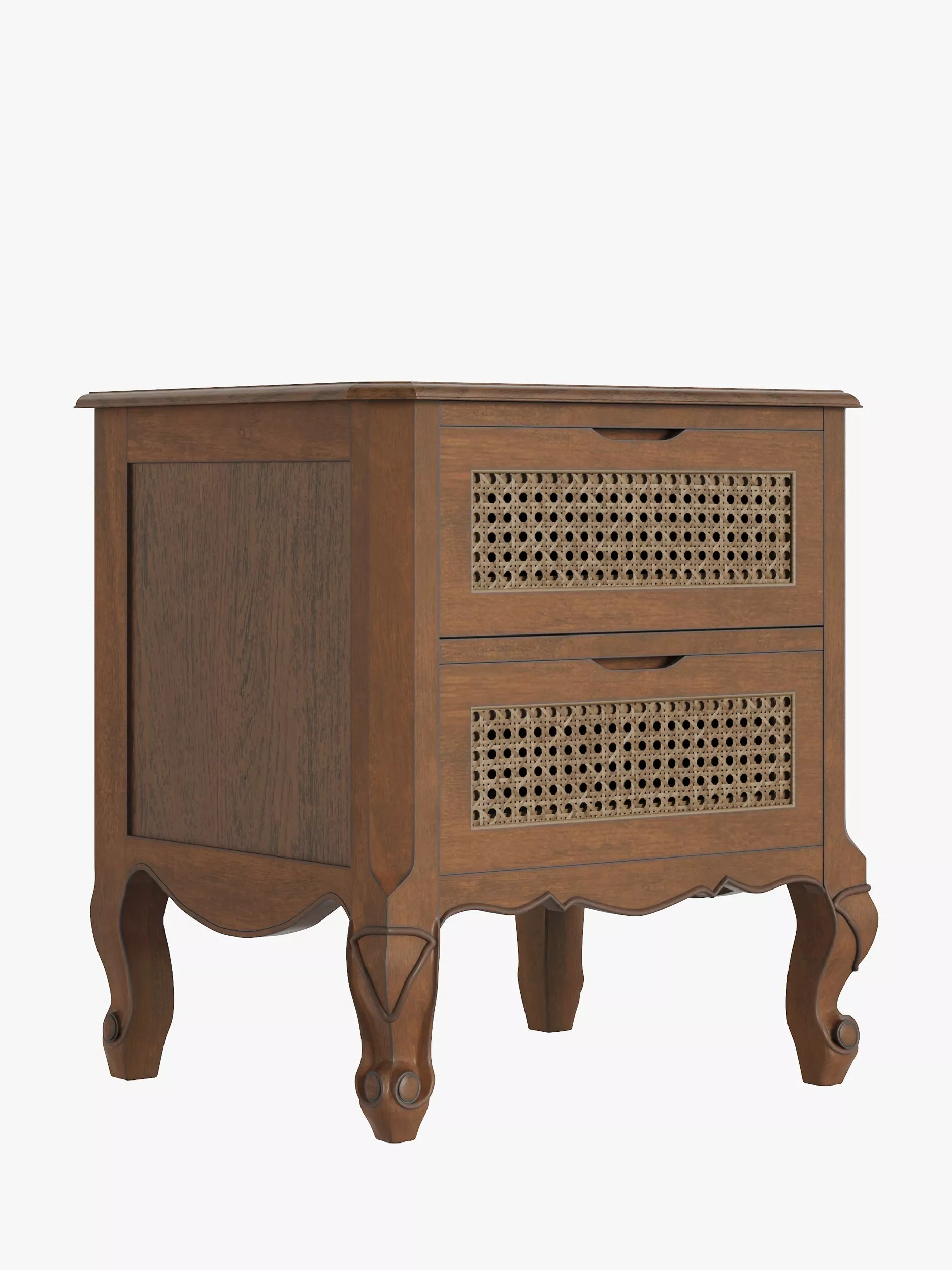 With its cabriole legs, rattan cane panels and graceful curves, this bedside table is a celebration of its distinctly classic French-inspired design. Its two drawers provide a helpful amount of storage space and it's built from high-quality solid and veneered wood in a stained finish.