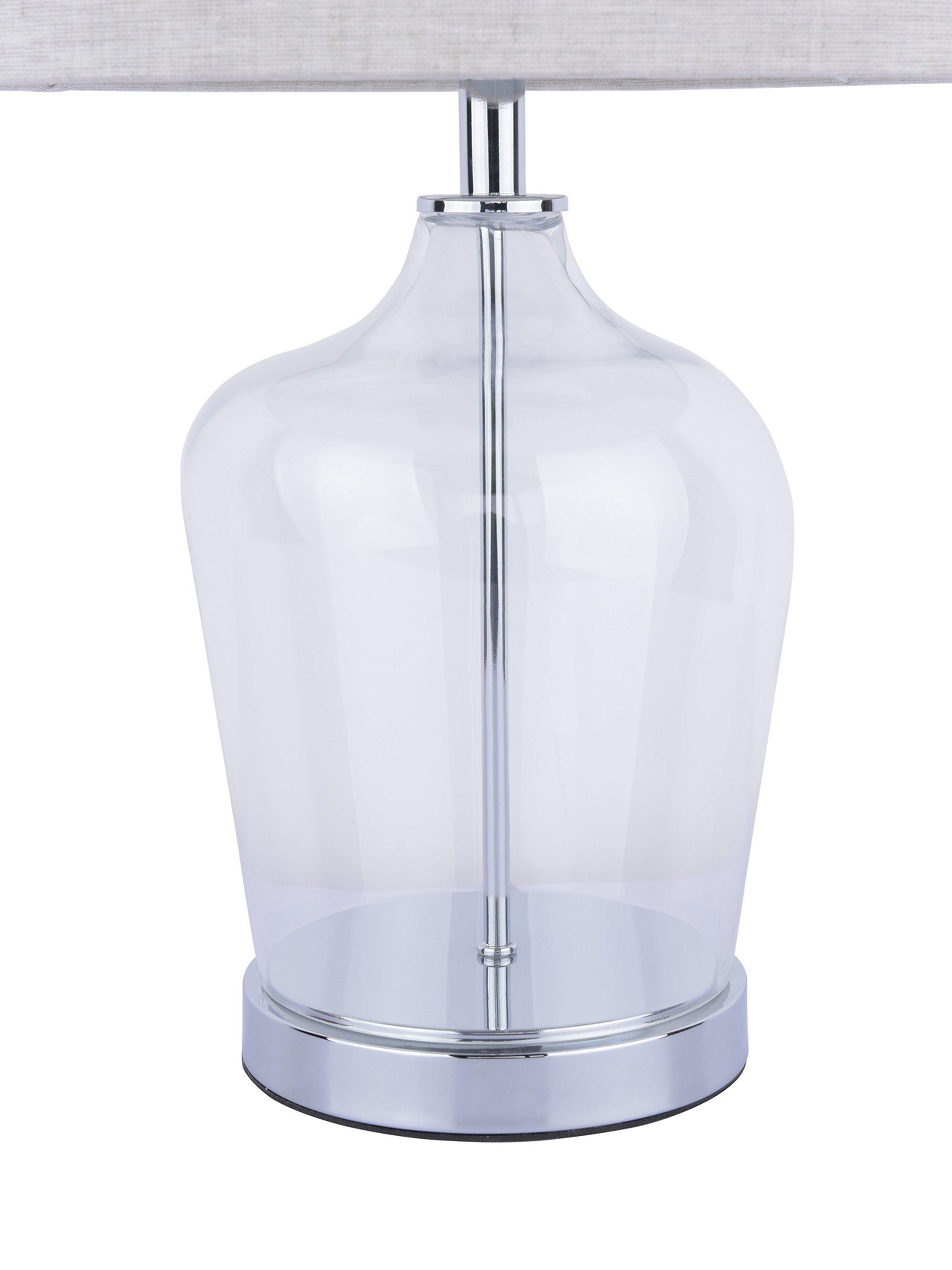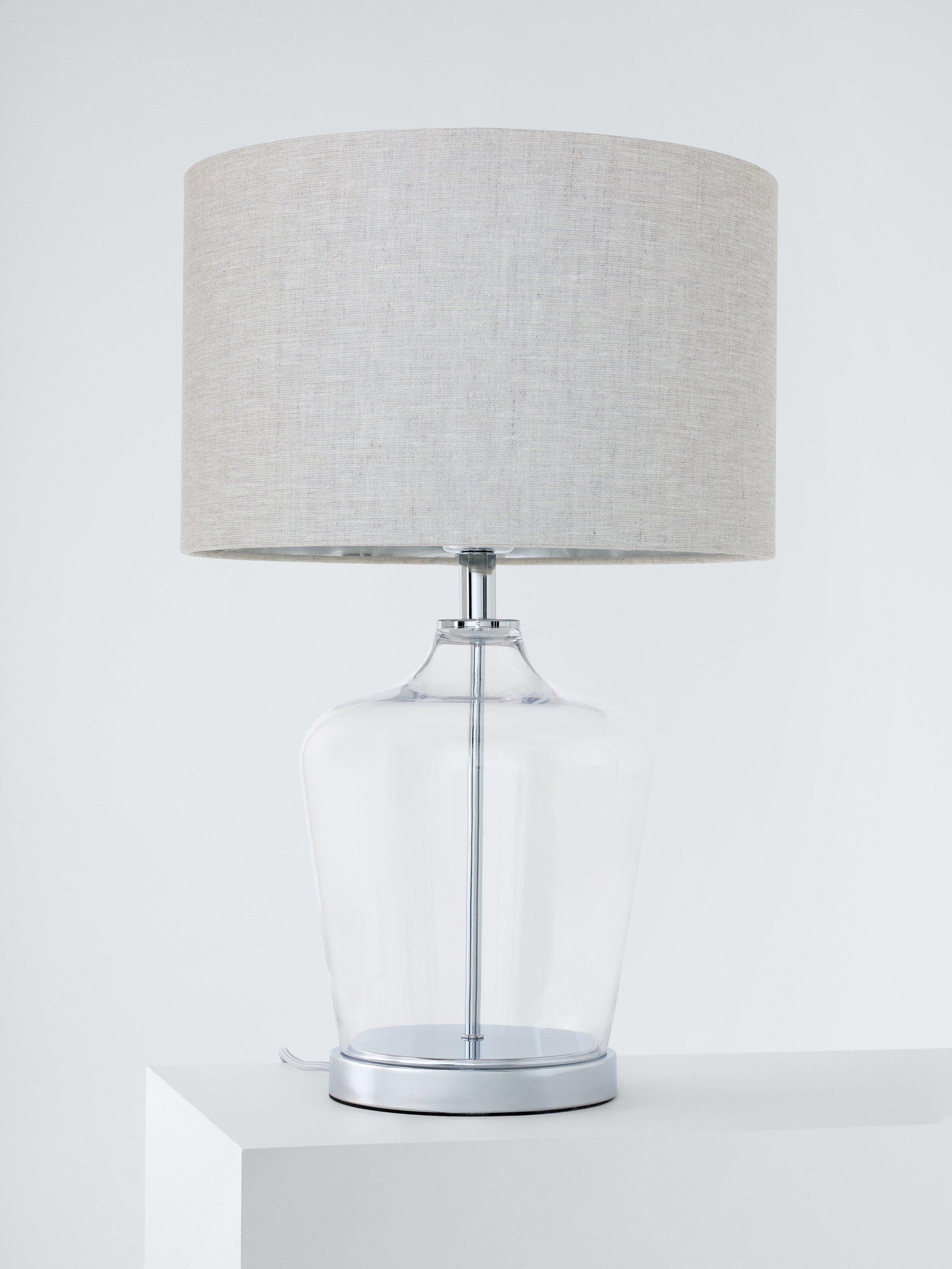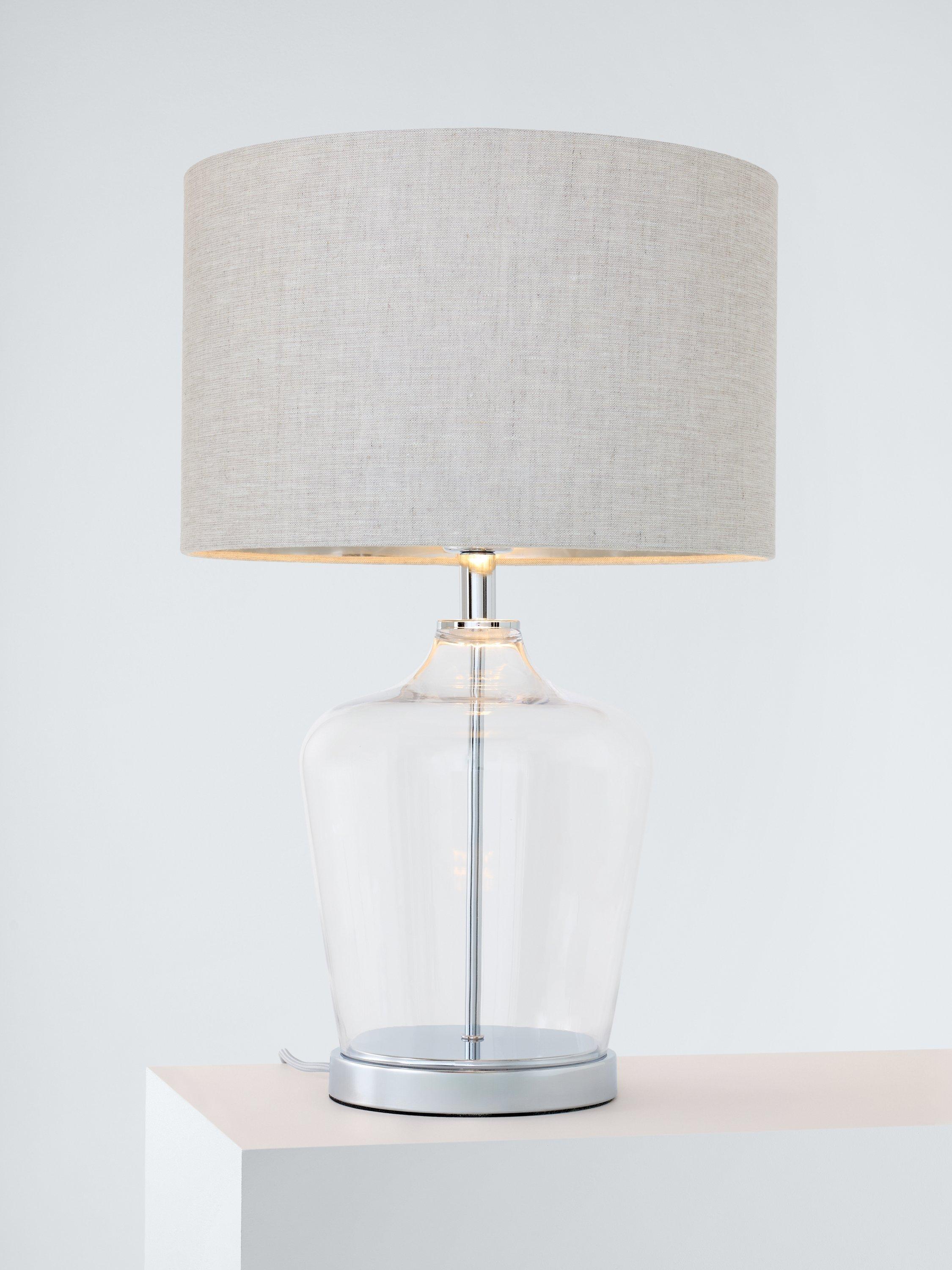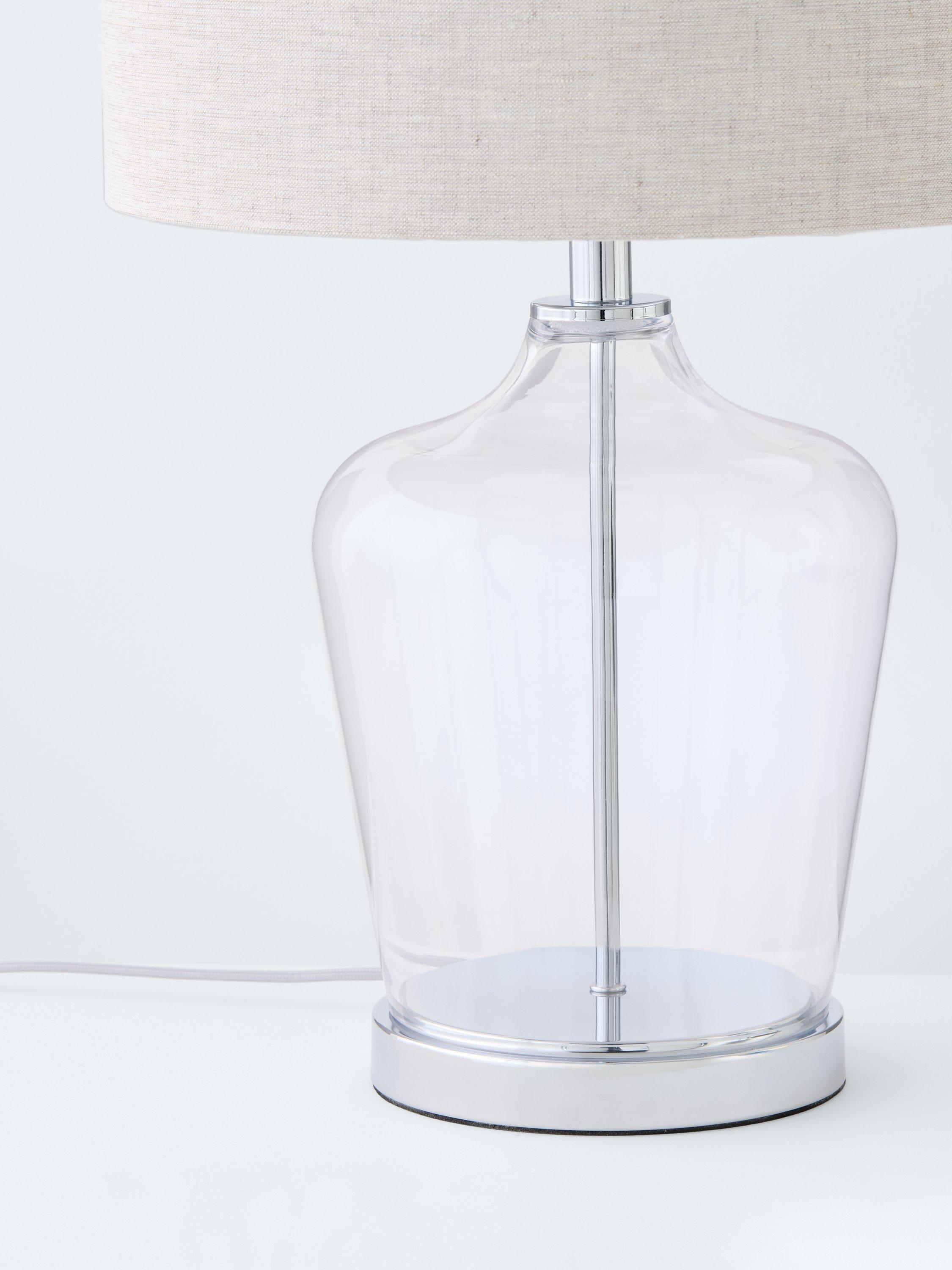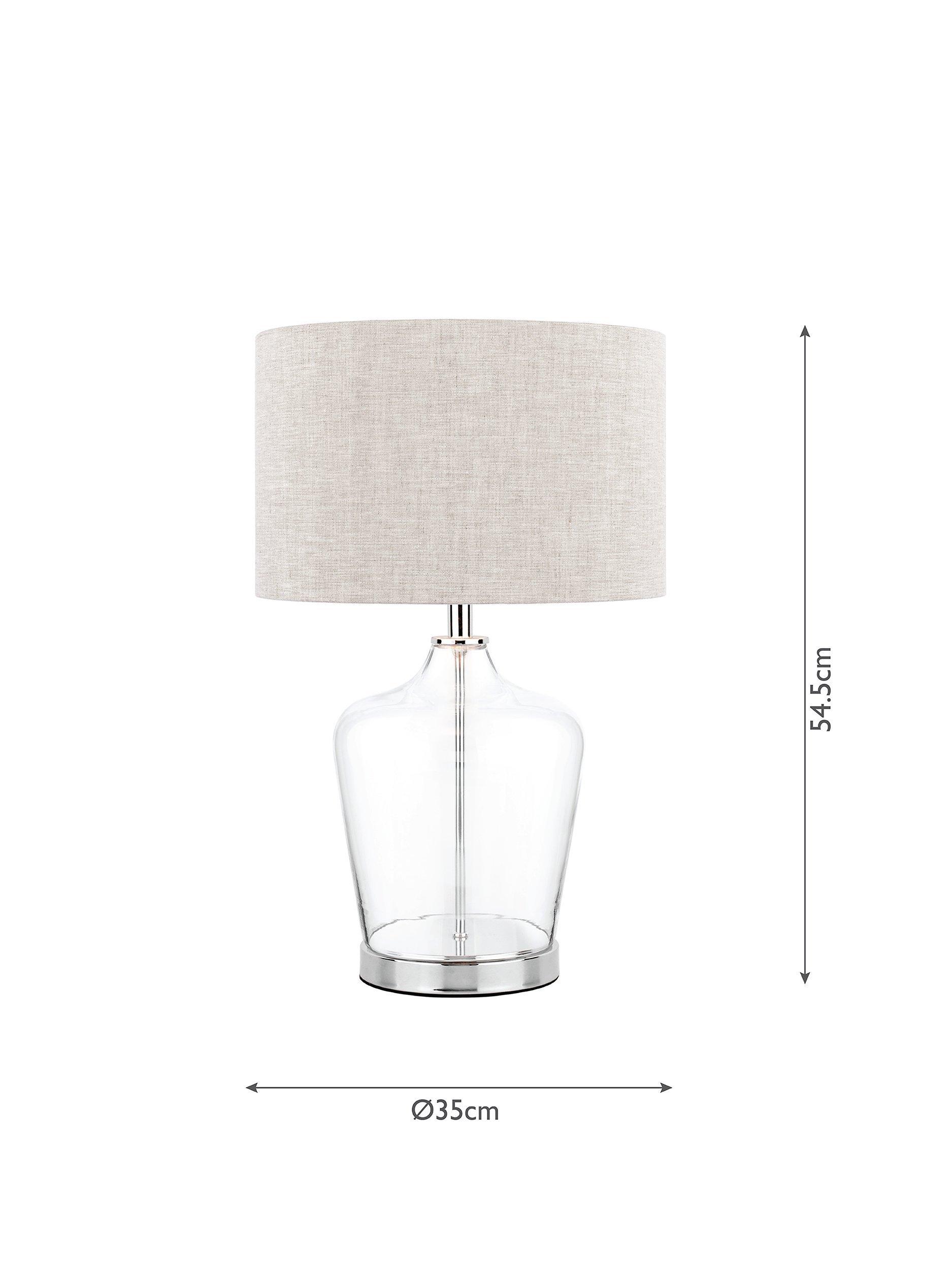The Ockley table lamp by Laura Ashley features a touch on/off polished chrome plinth beneath a clear glass vase. With a three stage touch switch function, simply touch once to turn on and again to dim and then to turn off. Paired with a grey shade with a metallic inner. A perfect table lamp for any room. Finished with a grey fabric cable.
