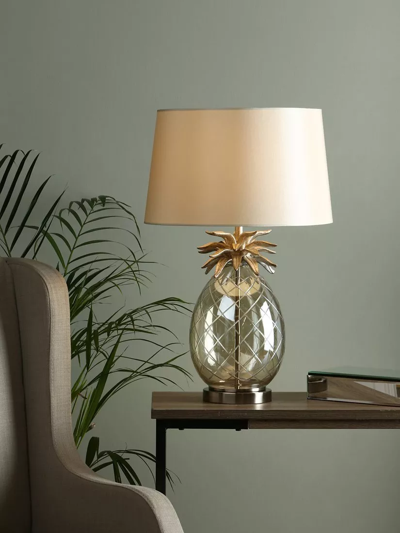 A quirky style to inject your room with character. This table lamp features a pineapple-shaped base which is made from clear, hand-cut glass and topped with resin pineapple leaves. Available in a choice of metallic finishes, it's teamed with a cotton tapered lampshade that enhances a warm glow of light. One LED bulb is required and it has a convenient in-line rocker switch.