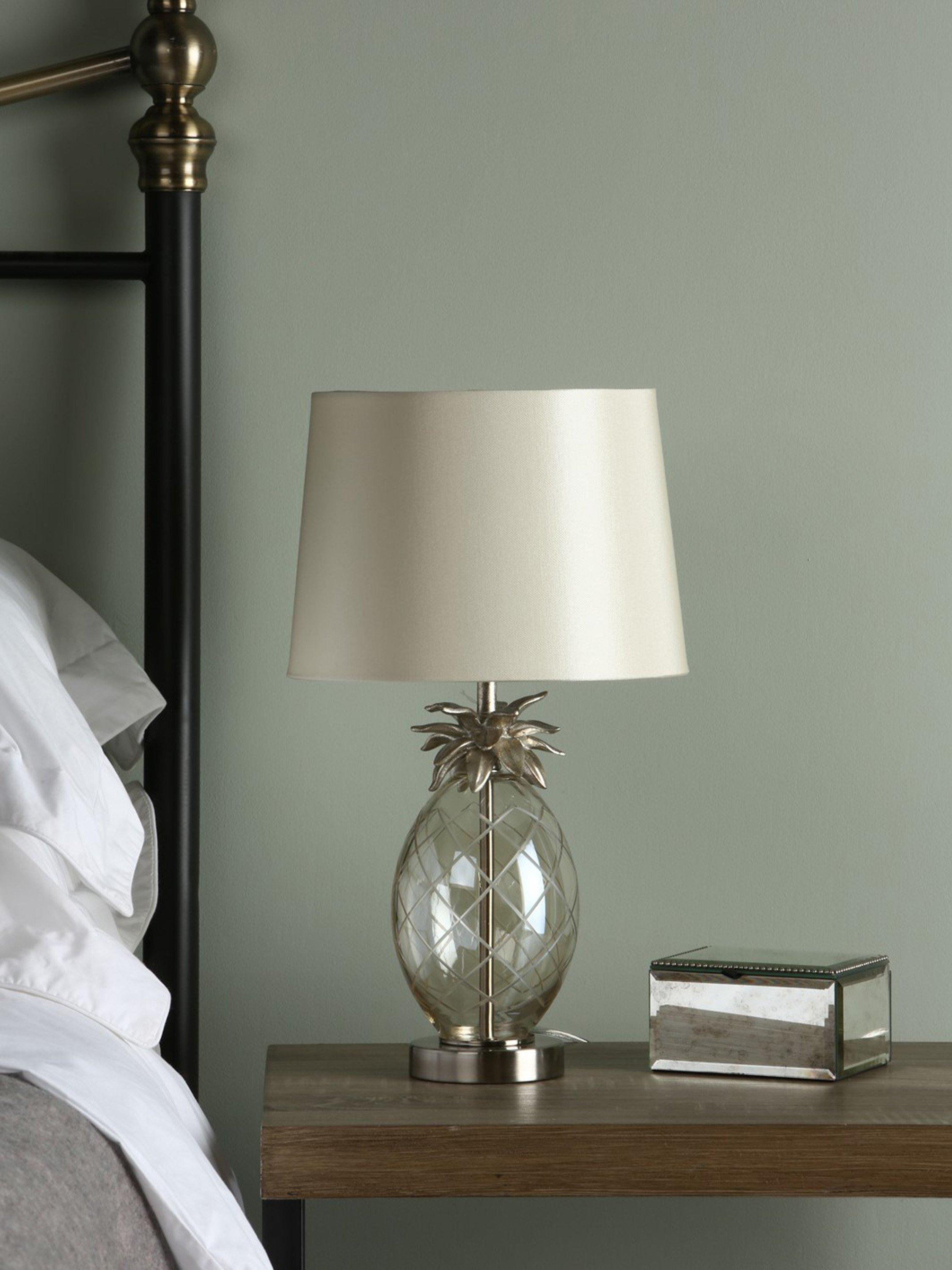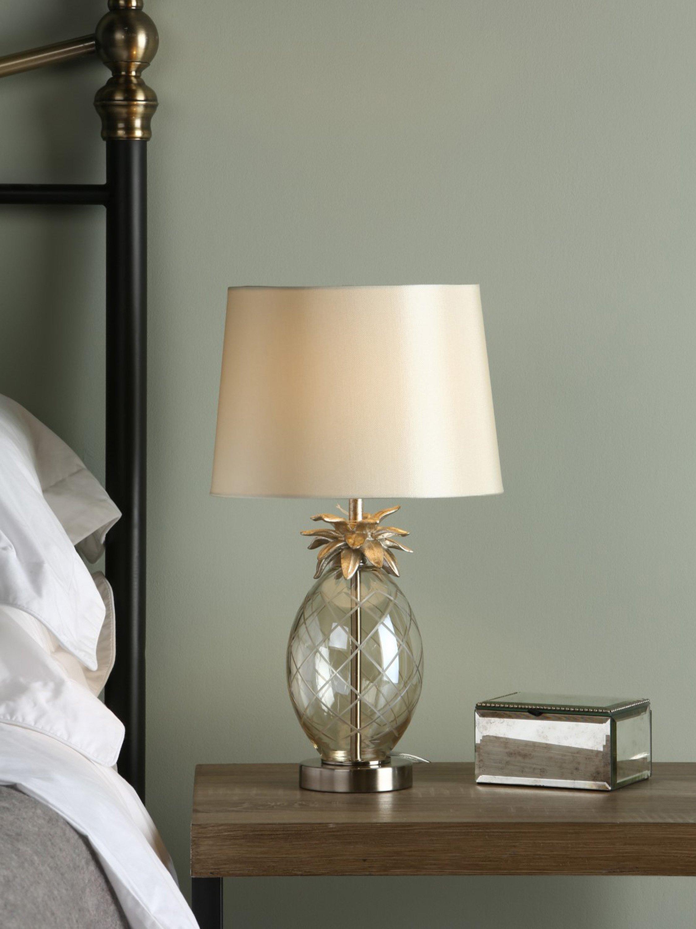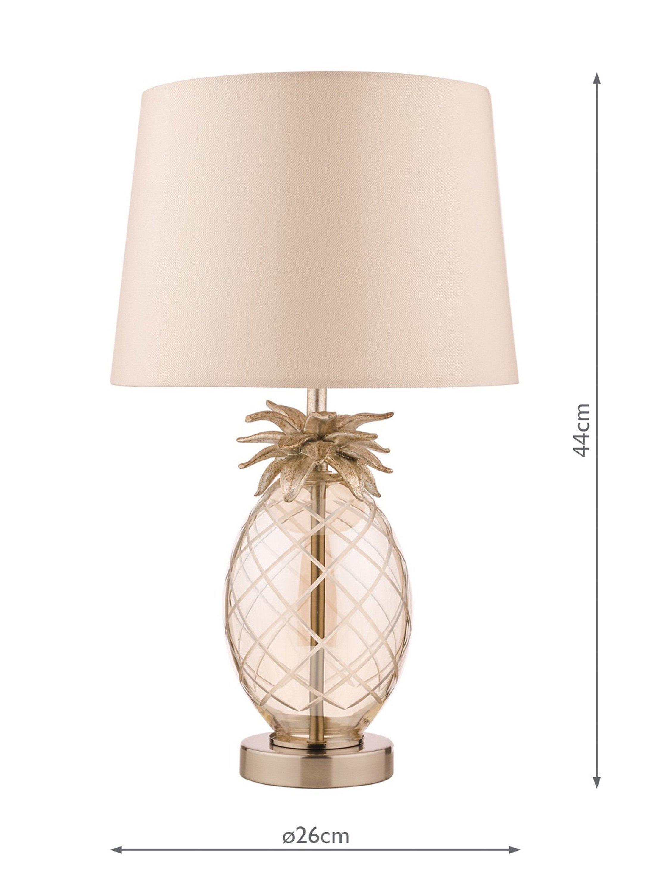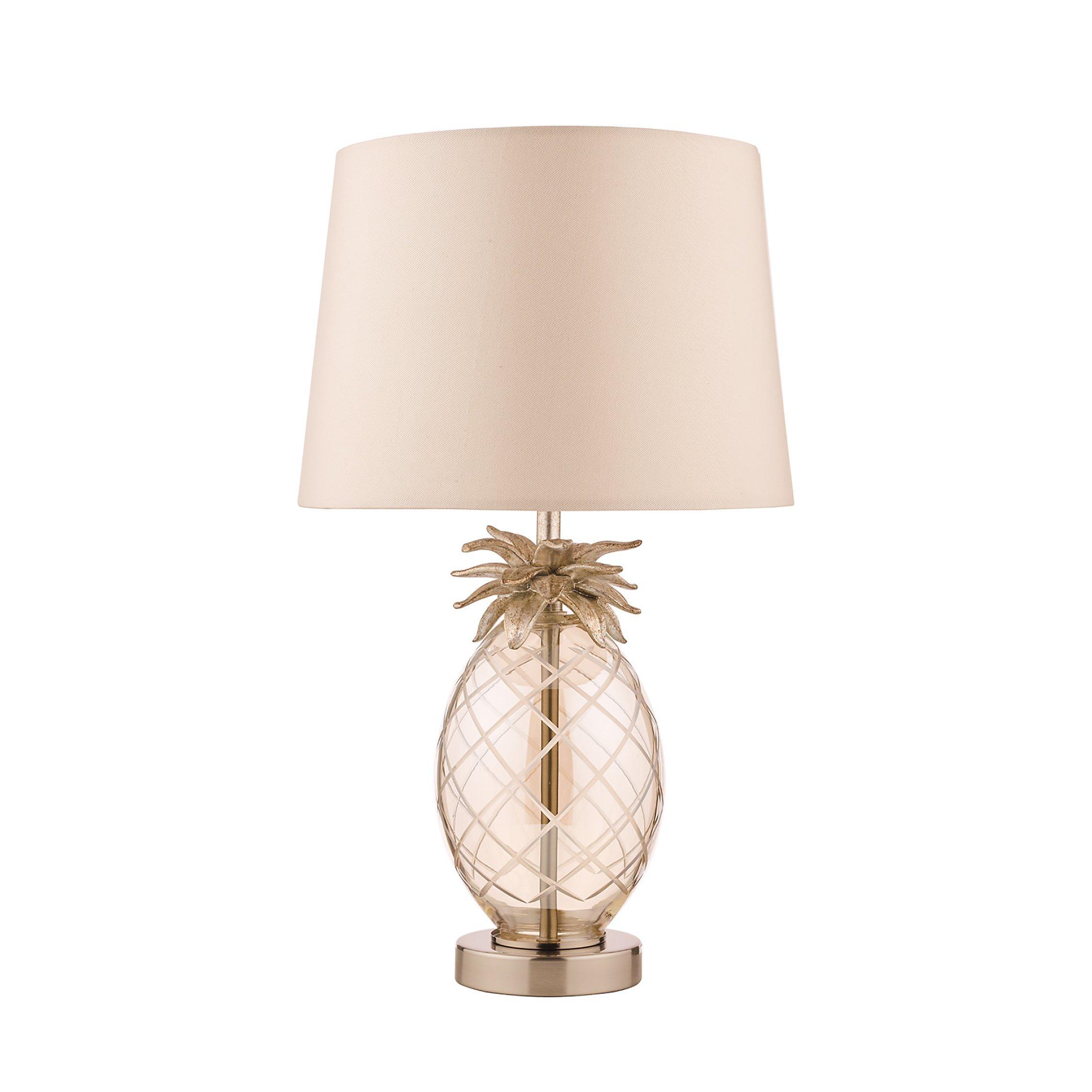 A quirky style to inject your room with character. This table lamp features a pineapple-shaped base which is made from clear, hand-cut glass and topped with resin pineapple leaves. It's teamed with a faux silk tapered lampshade that enhances a warm glow of light. One LED bulb is required and it has a convenient in-line rocker switch.