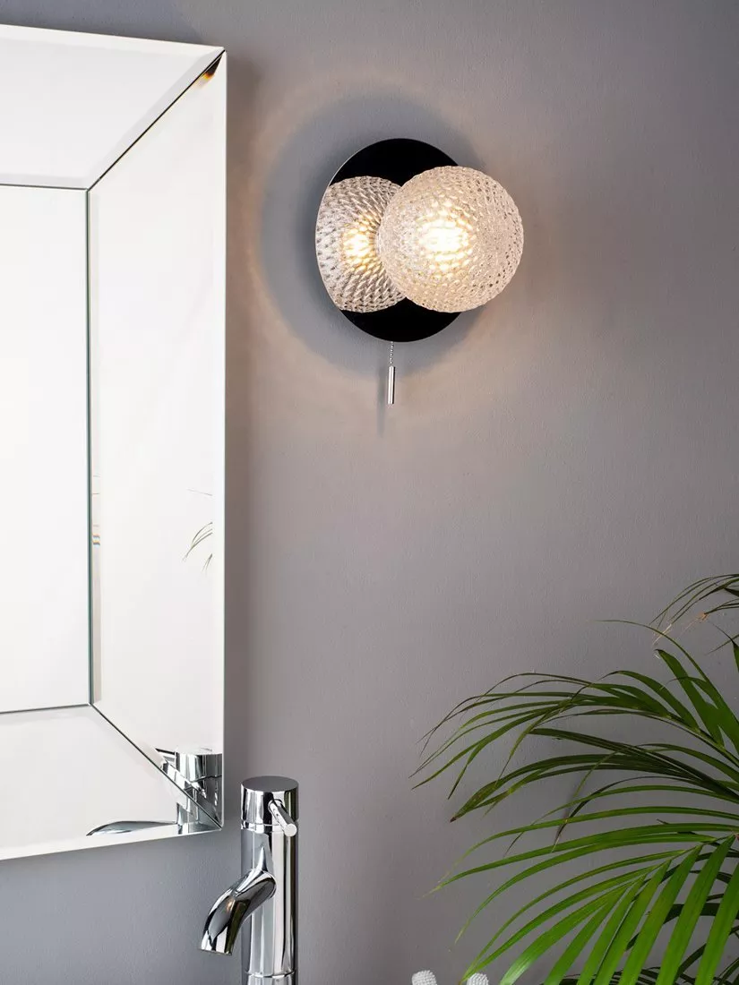 This glamorous wall fitting is designed specifically for bathrooms, offering both a sparkly accent as well as a functional light. It's made with a clear, textured glass shade and metal disc wall plate that's available in a satin or polished finish. We like the matching pull chain switch as it means you can create an ambient lighting effect in your bathroom and operate it independently from any other light fittings. IP44 rated, it's safe to use in bathrooms and wet rooms and requires one LED bulb.