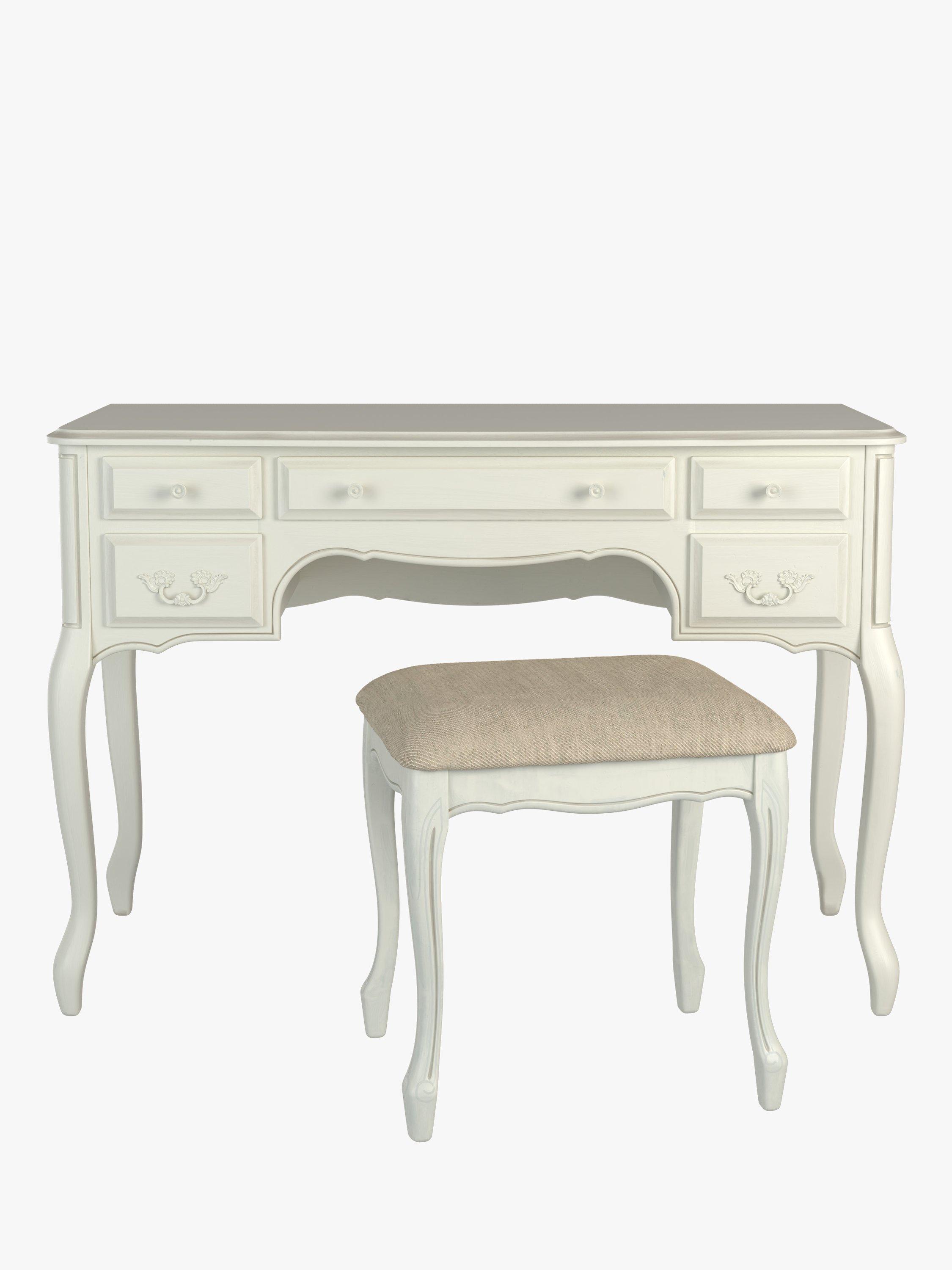 Drawing inspiration from Rococo-style furniture, this dressing table will take pride of place in your bedroom. Elegant and practical, it's designed with five mounted drawers, all of differing sizes for your accessories and it features typically curved corners and inscribed details. It's supplied with a matching upholstered stool that nestles perfectly under the table. All surfaces have a durable, painted finish with a delicately applied patina to selected edges and profiles.