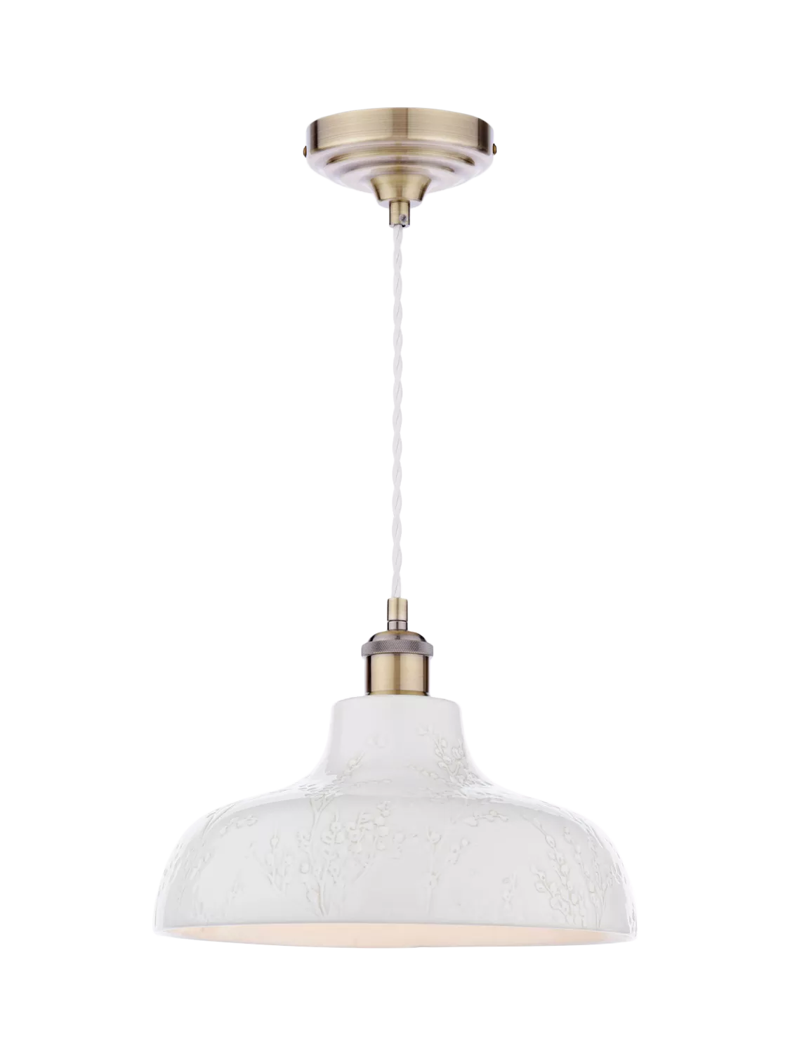 Elevate your decor with the Laura Ashley Pussy Willow Ceramic Pendant. Its ceramic base is beautifully embossed with delicate Pussy Willow branches, making it an ideal choice for creating a warm and serene atmosphere.