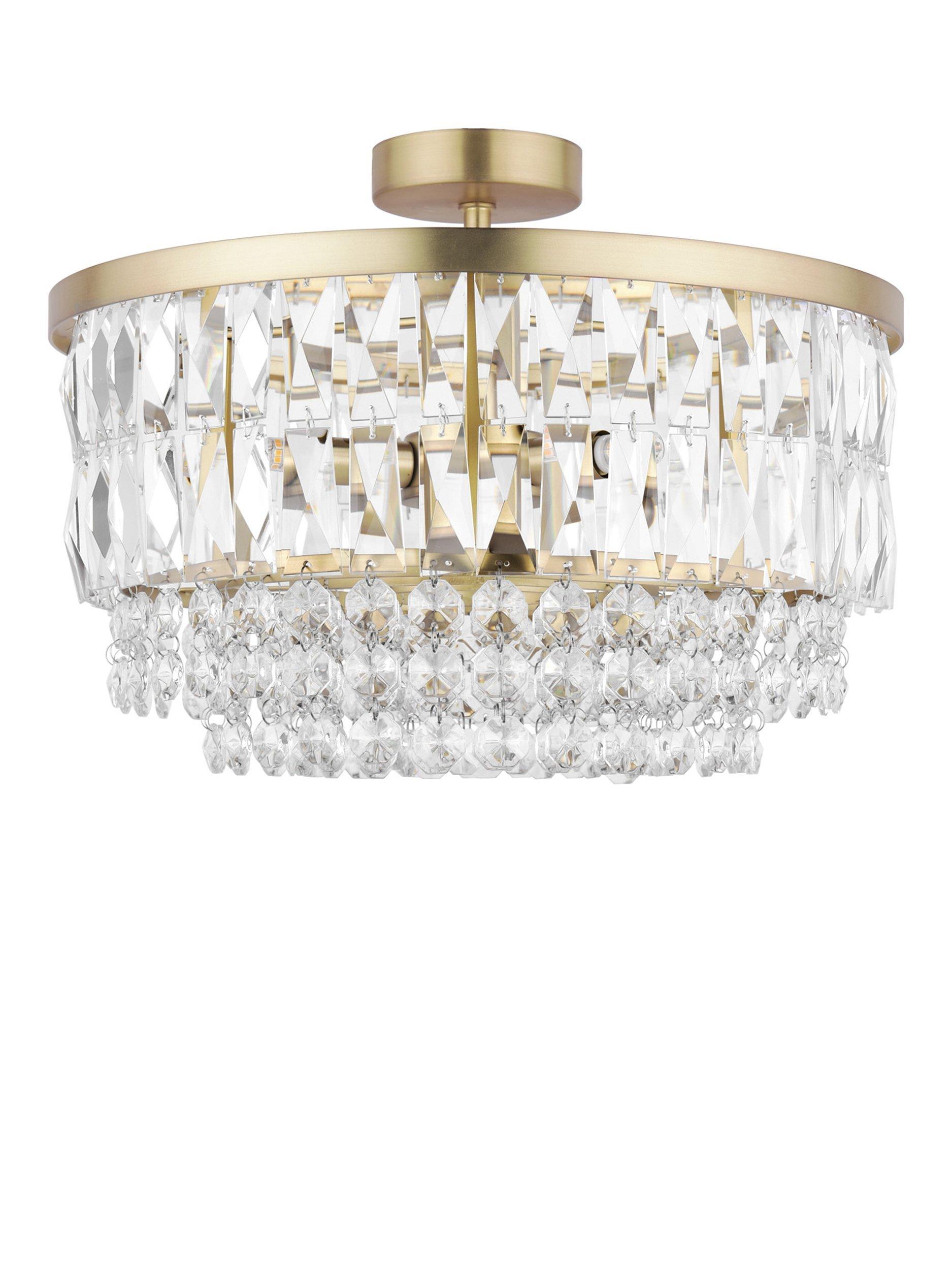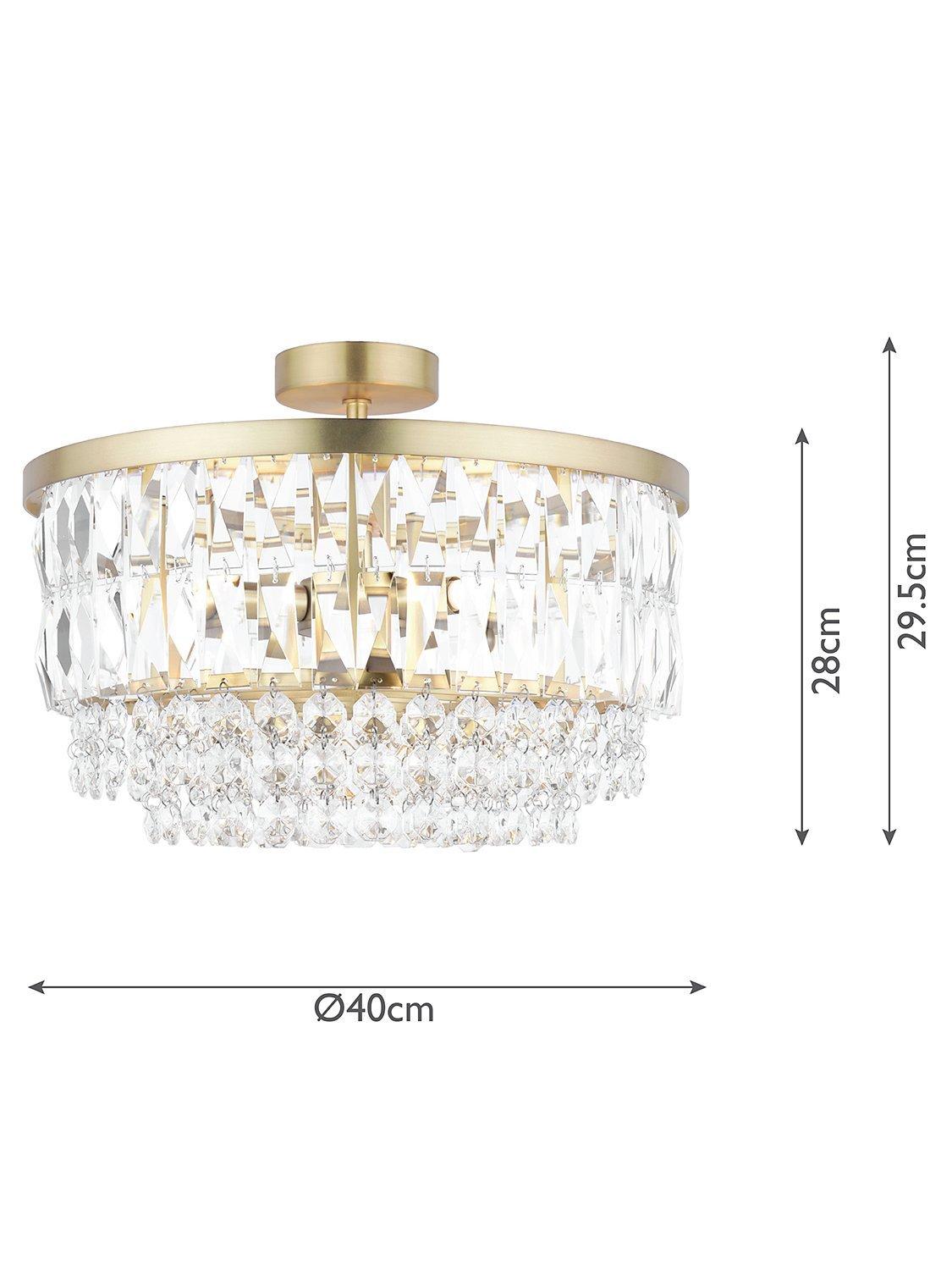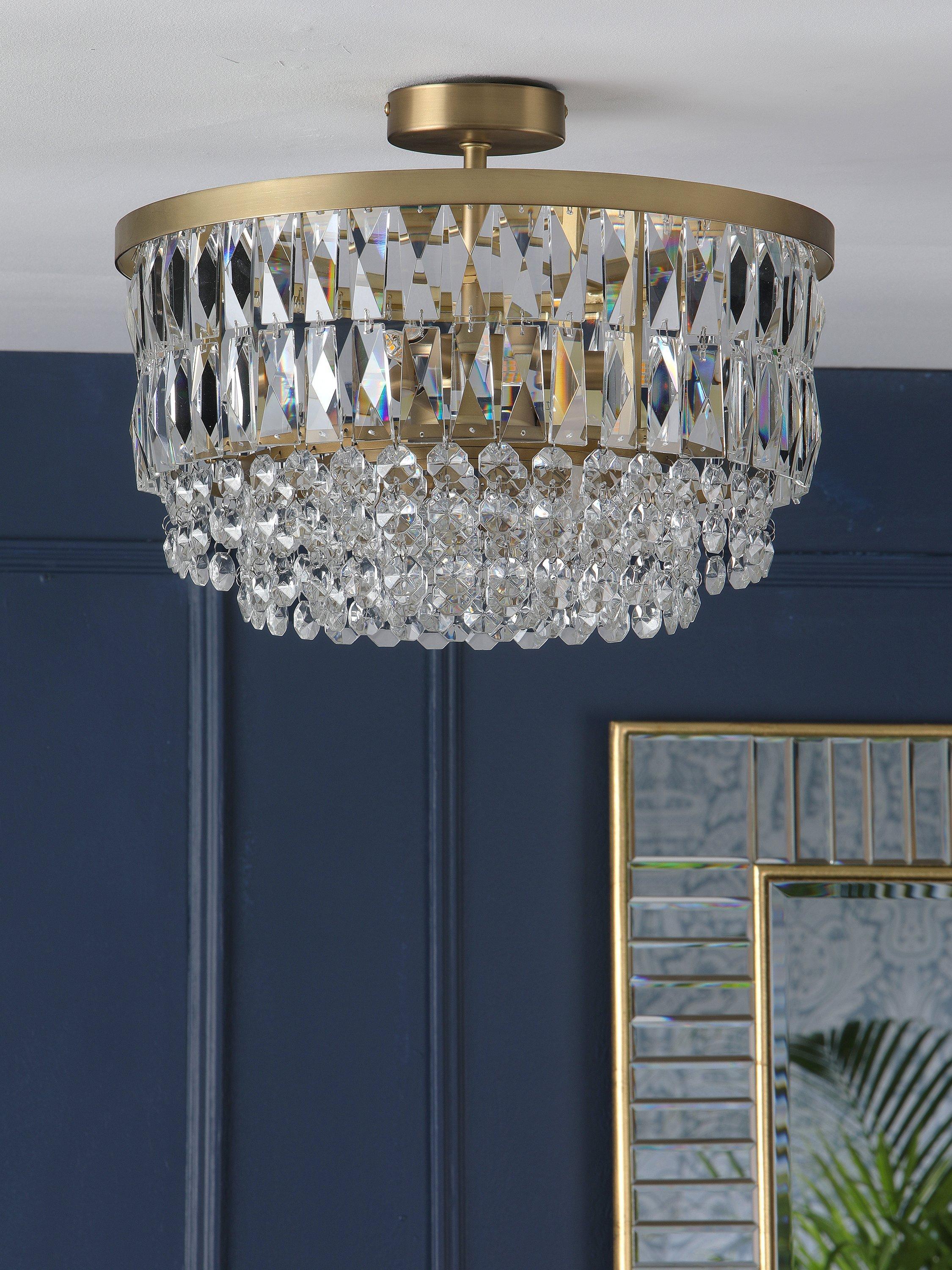 The Rhosill ceiling light by Laura Ashley features stunning faceted glass crystals with gorgeous matt, antique brass-effect metal accents. Semi flush fittings are suitable for low ceilings and small rooms and they have a neat finish with no visible cables. This statement ceiling light would complement any room.