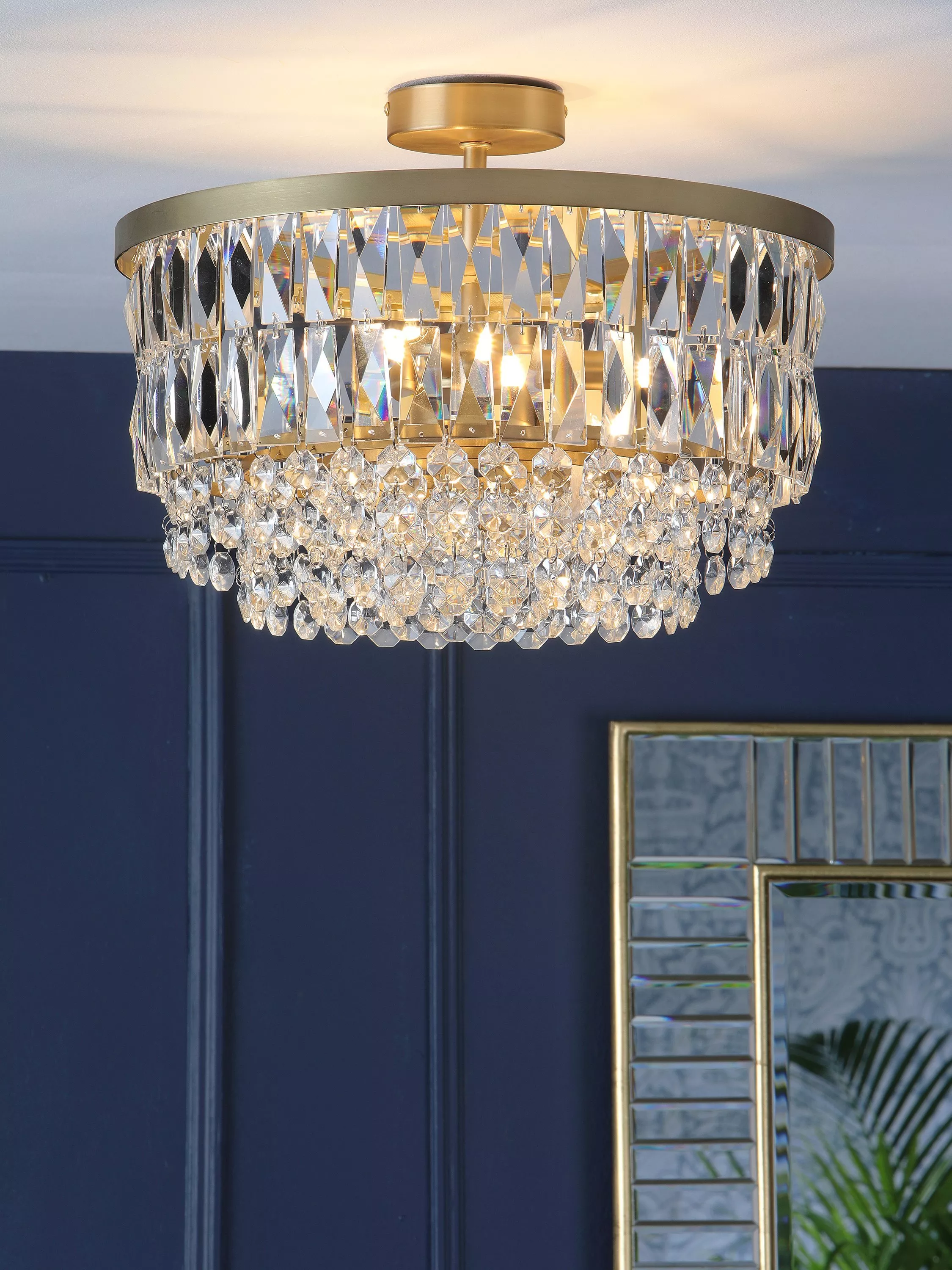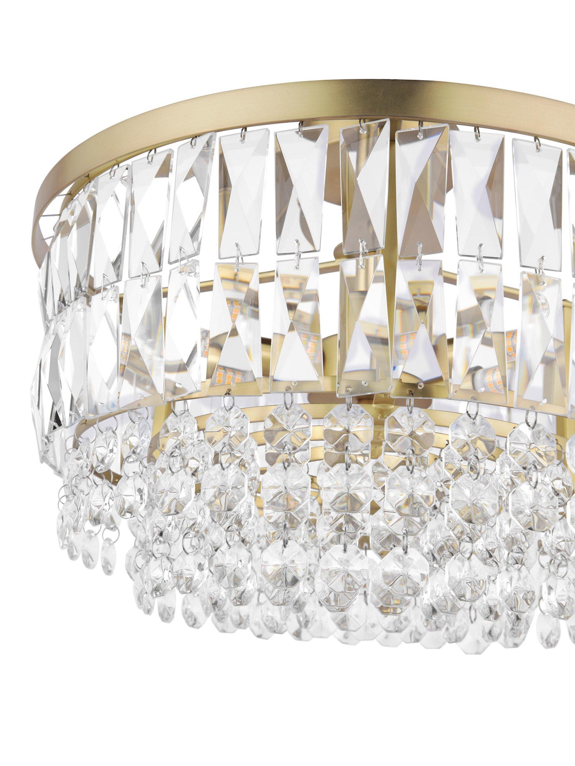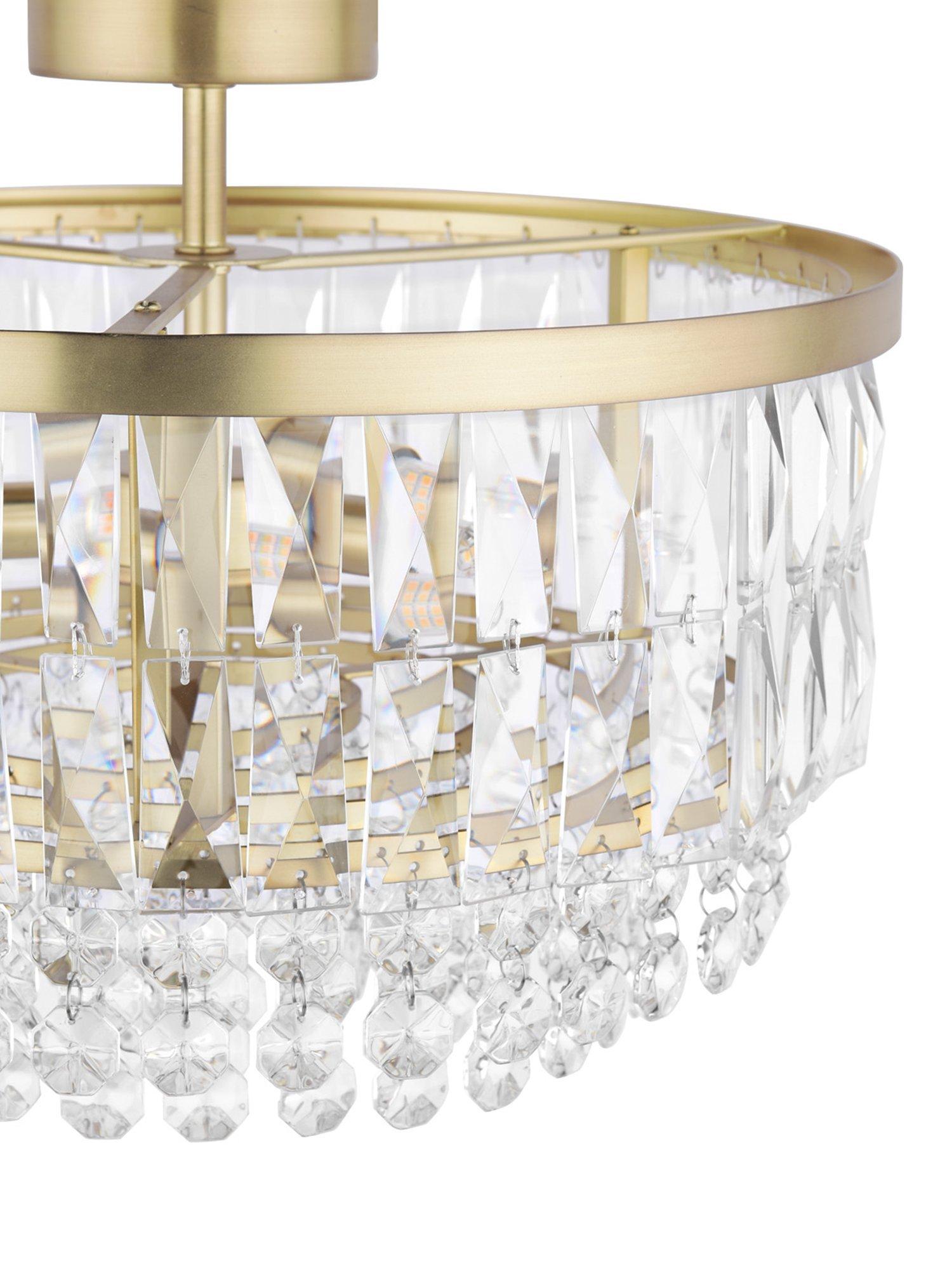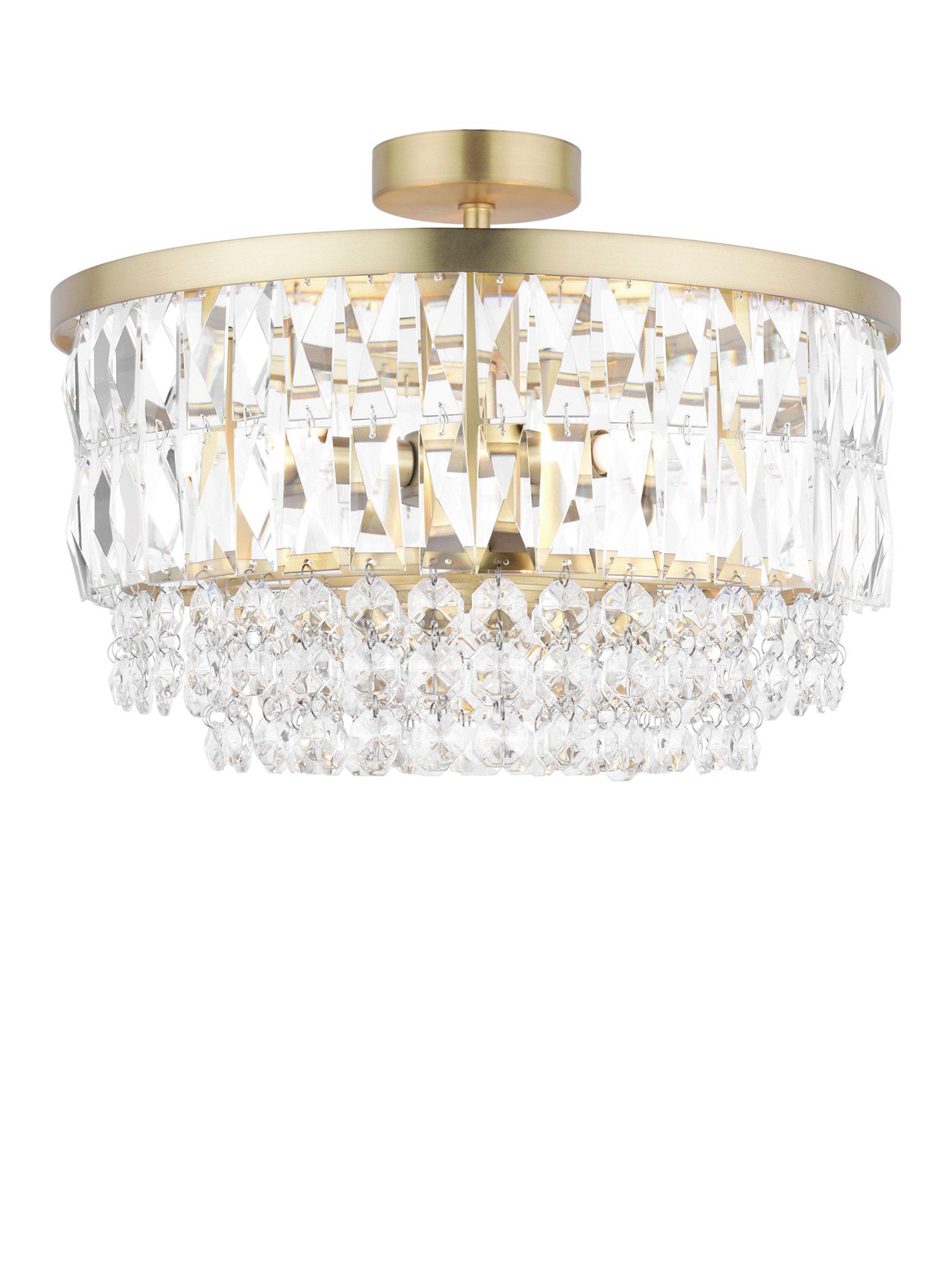 The Rhosill ceiling light by Laura Ashley features stunning faceted glass crystals with gorgeous matt, antique brass-effect metal accents. Semi flush fittings are suitable for low ceilings and small rooms and they have a neat finish with no visible cables. This statement ceiling light would complement any room.