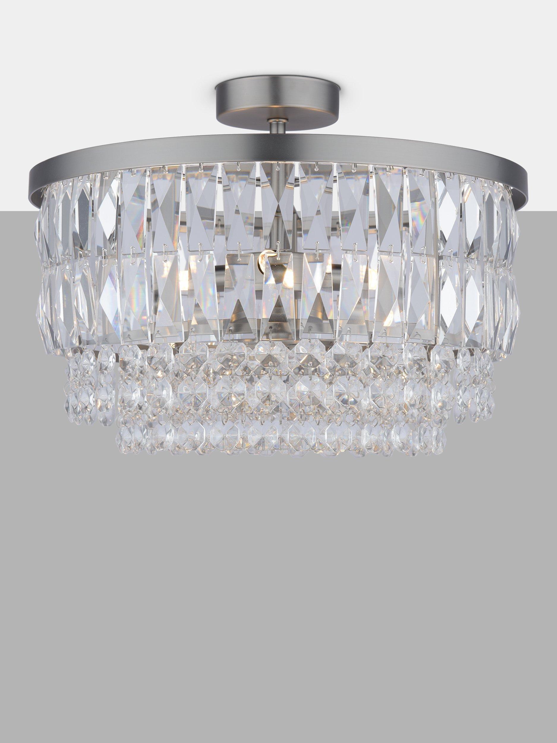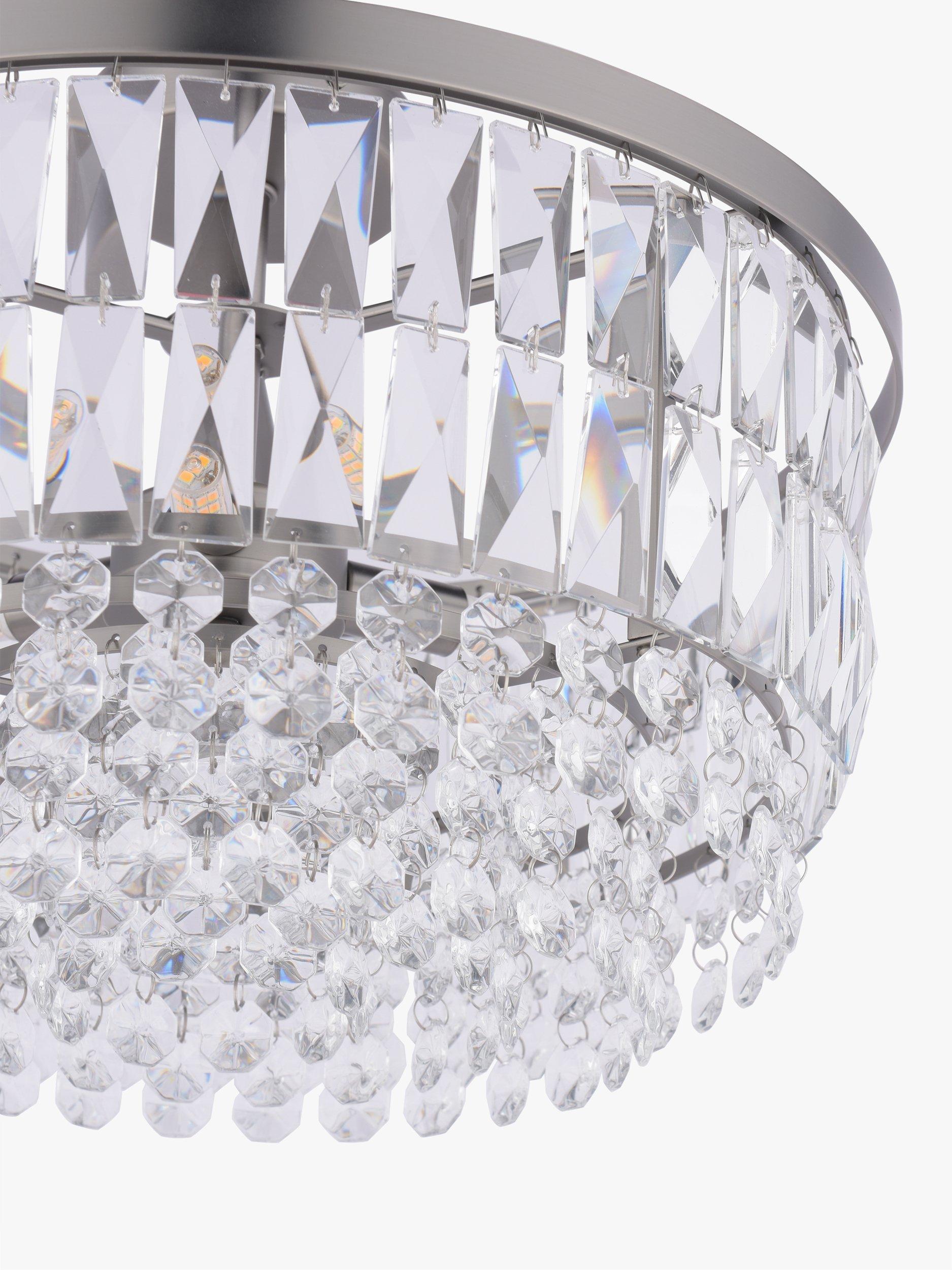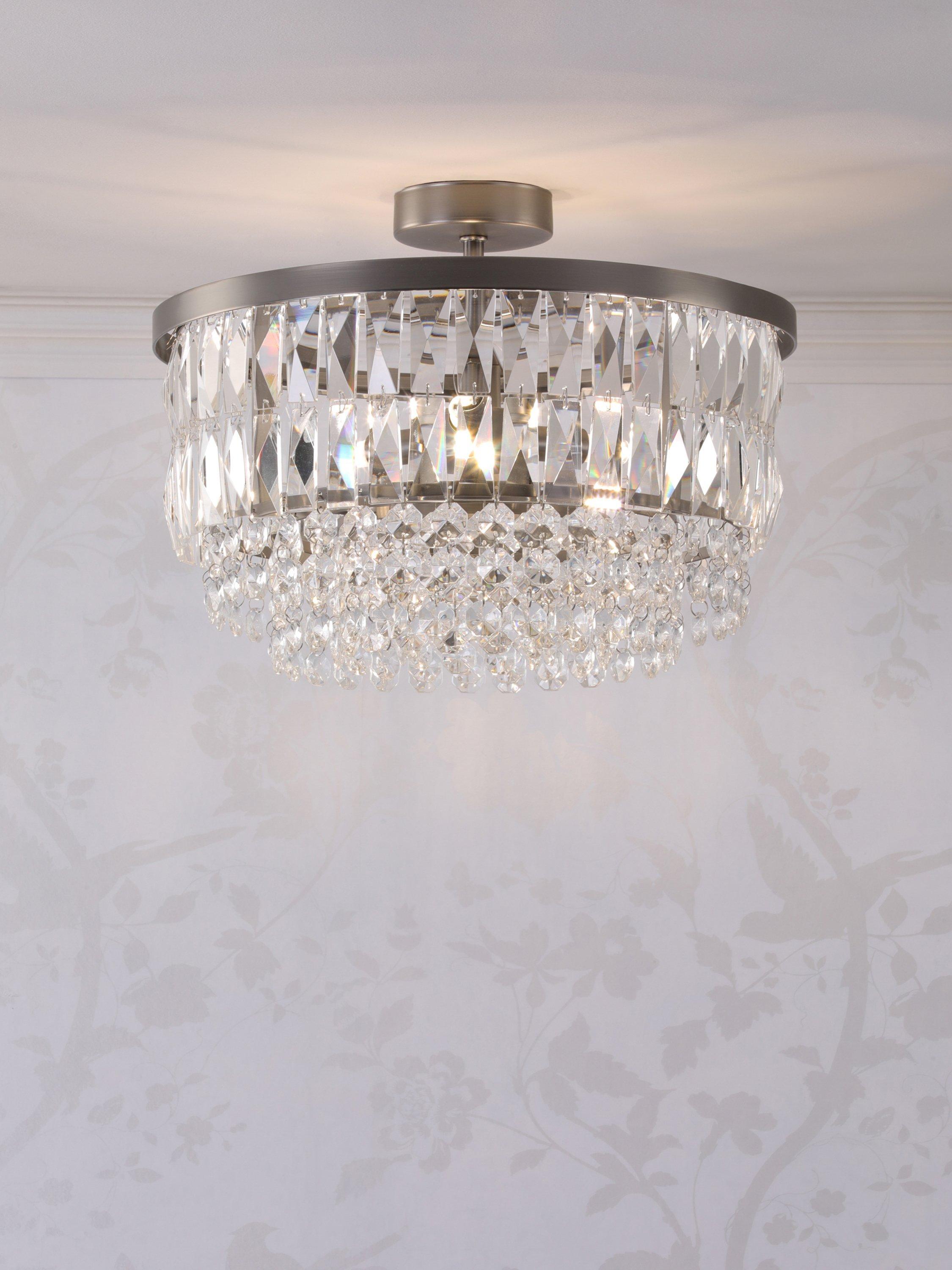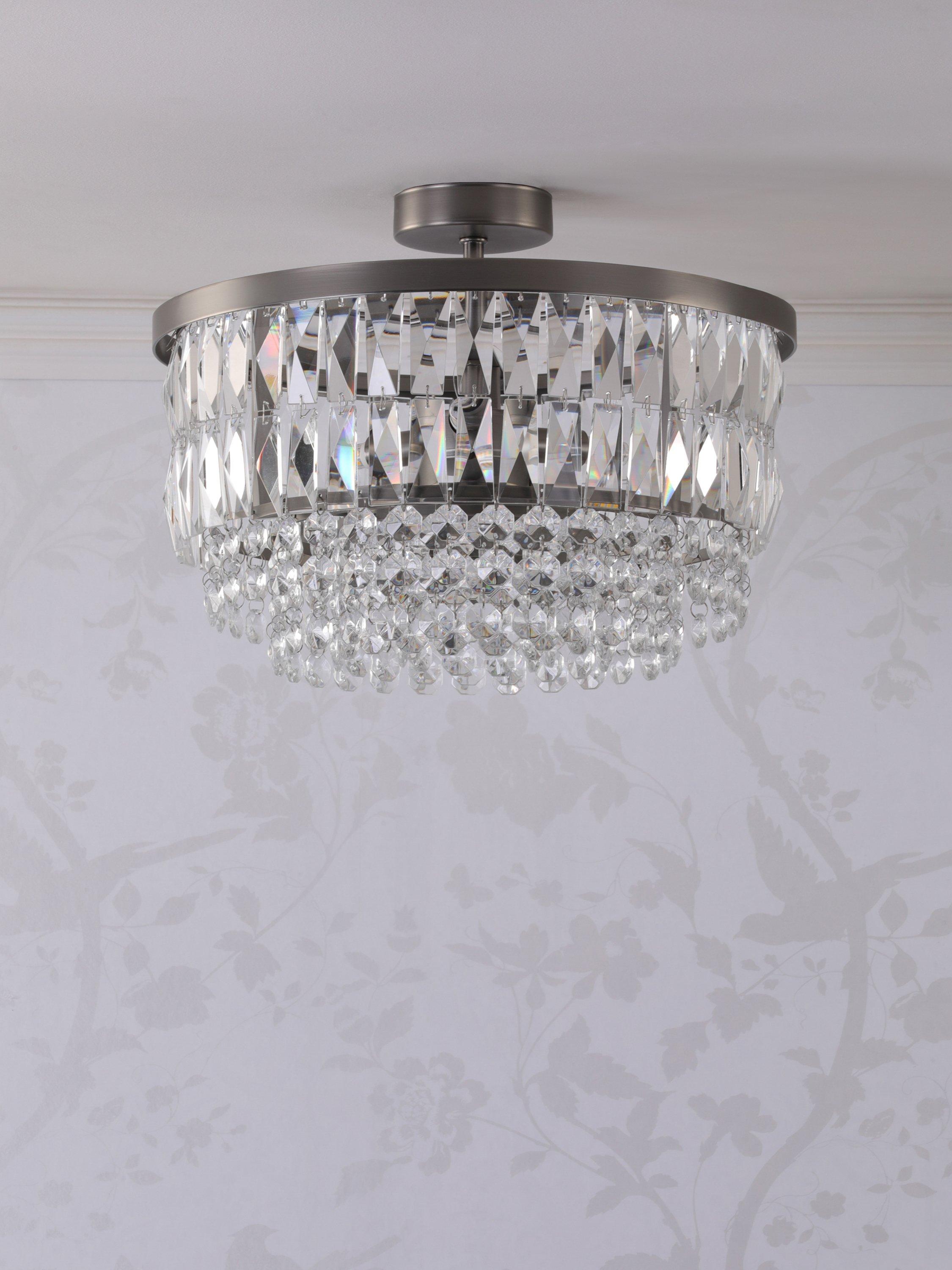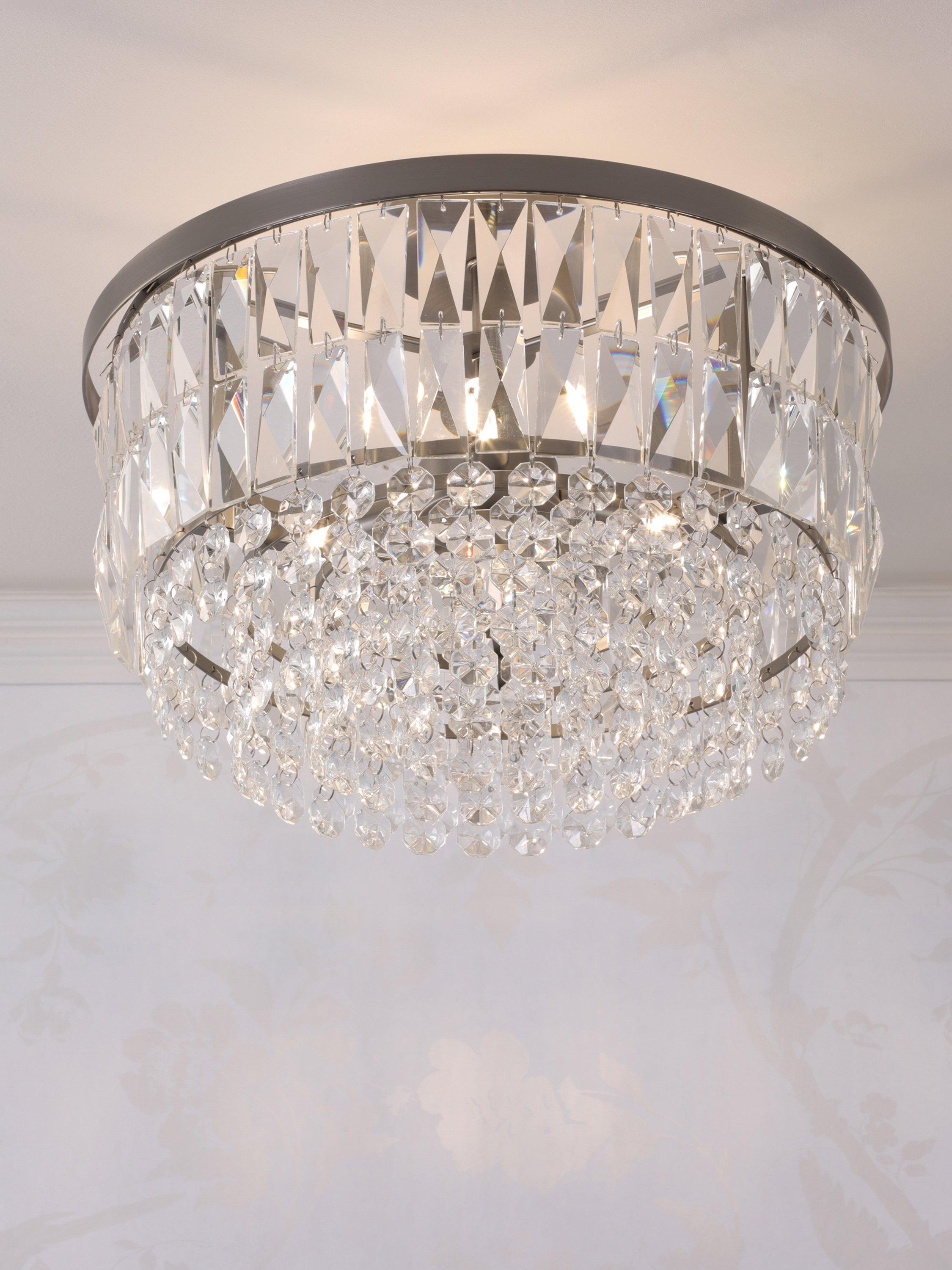 The glamorous Rhosill ceiling light by Laura Ashley features bevelled glass shapes, suspended from a circular frame in a contemporary finish.