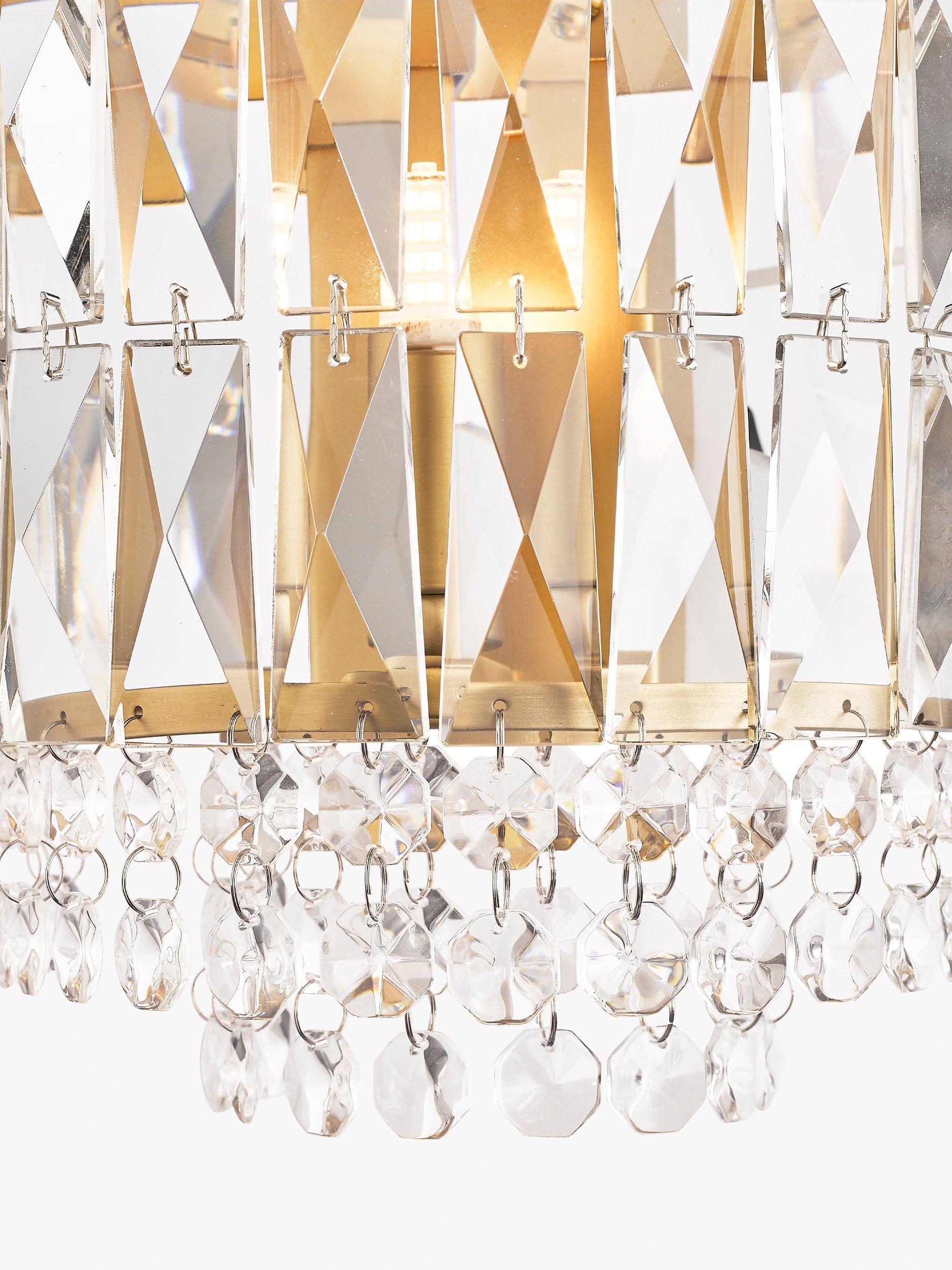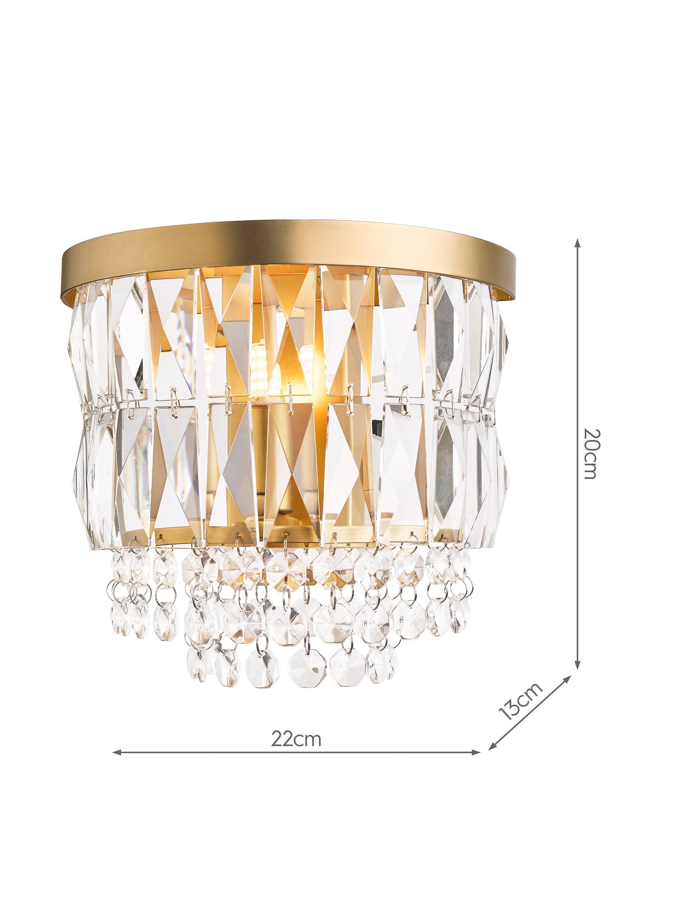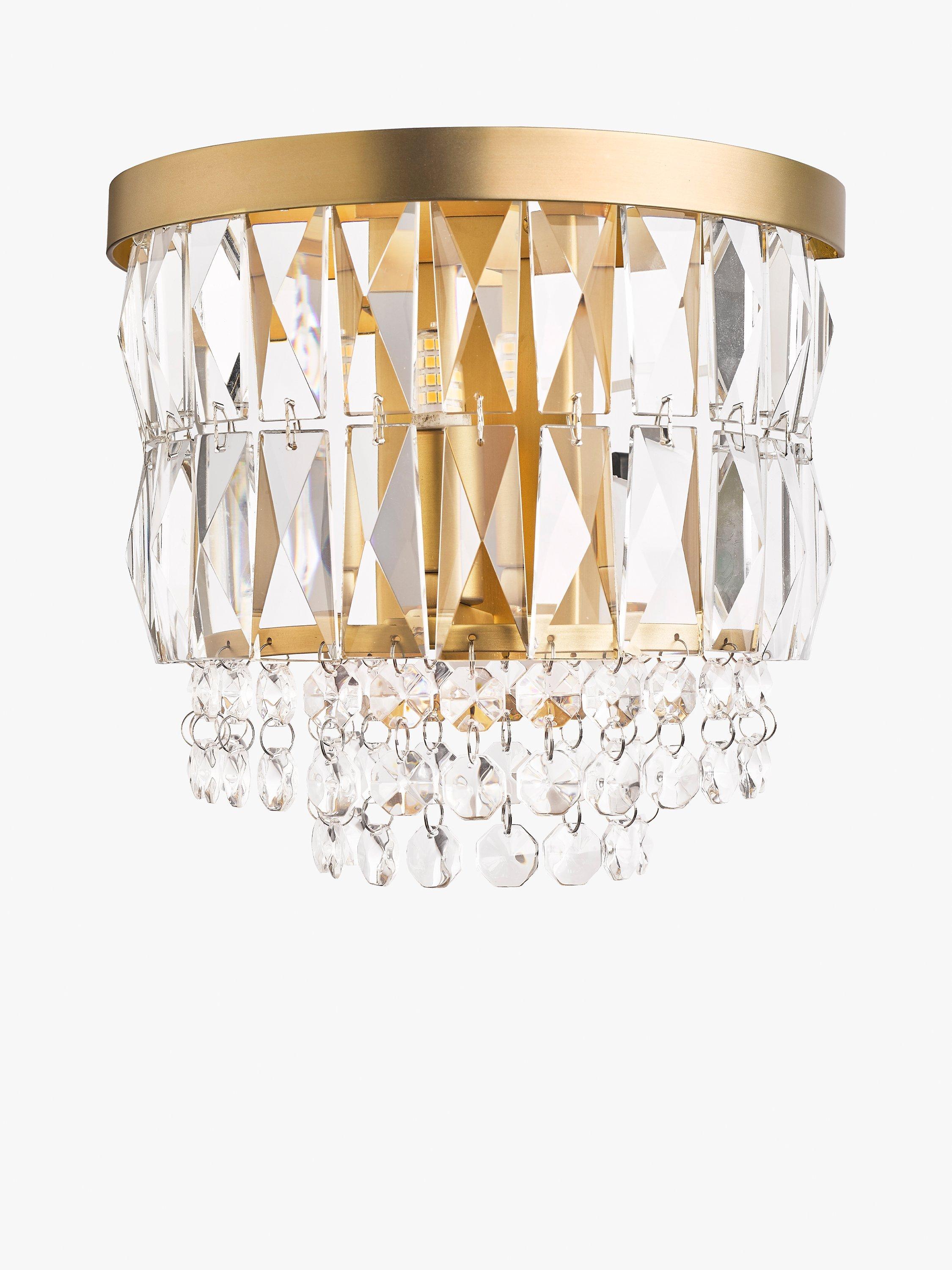 The Rhosill Wall Light by Laura Ashley features stunning faceted glass crystals with matt antique brass-effect metal accents. This statement wall lamp would complement any room.
