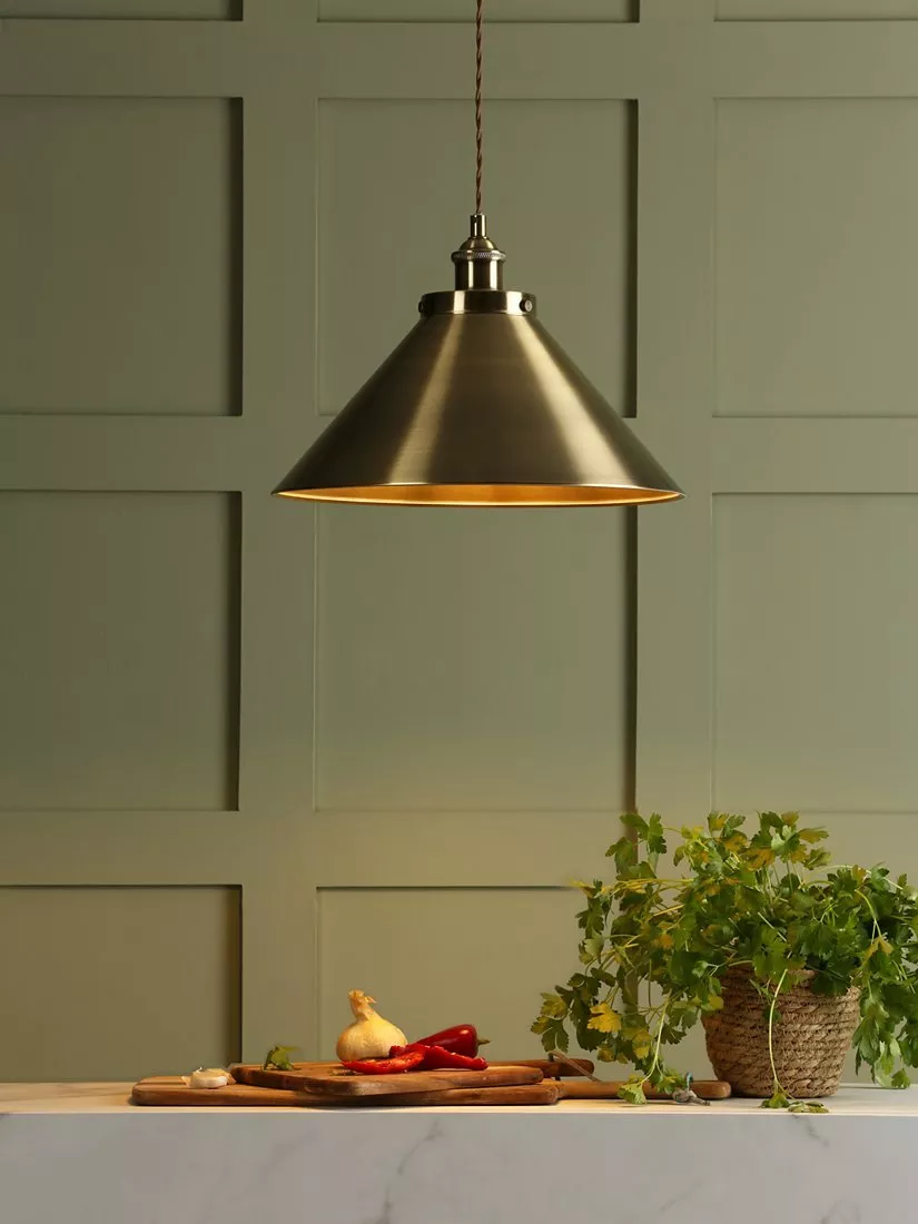 Laura Ashley’s Rufus Grande ceiling light has a superior antique brass finish that will look superb in your kitchen or dining room, suspended over a table, or indeed above a desk in your home office area. The Rufus is a large, quality pendant with an oversized cone shade made of spun metal with a neat rolled edge. The solid shade directs light downwards onto the surface below, not only creating great illumination but enhancing the atmosphere when surrounding lights are turned down. Paired with a twisted, light brown braided fabric cord for a vintage character look. You can adjust the height to suit when it is installed therefore this ceiling light is also suitable for higher ceilings. Bulb not included.