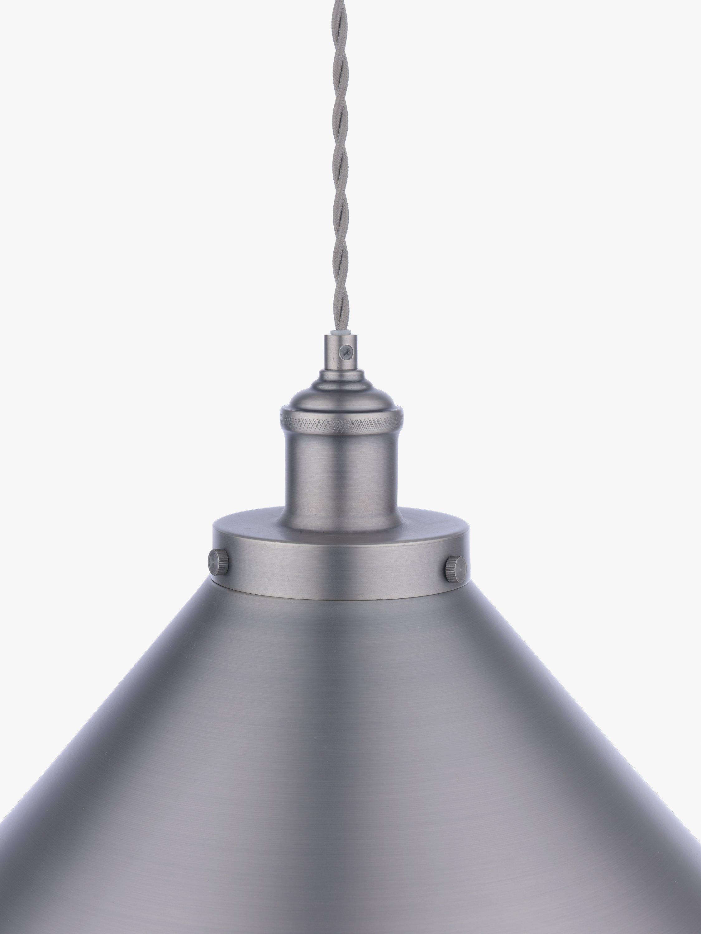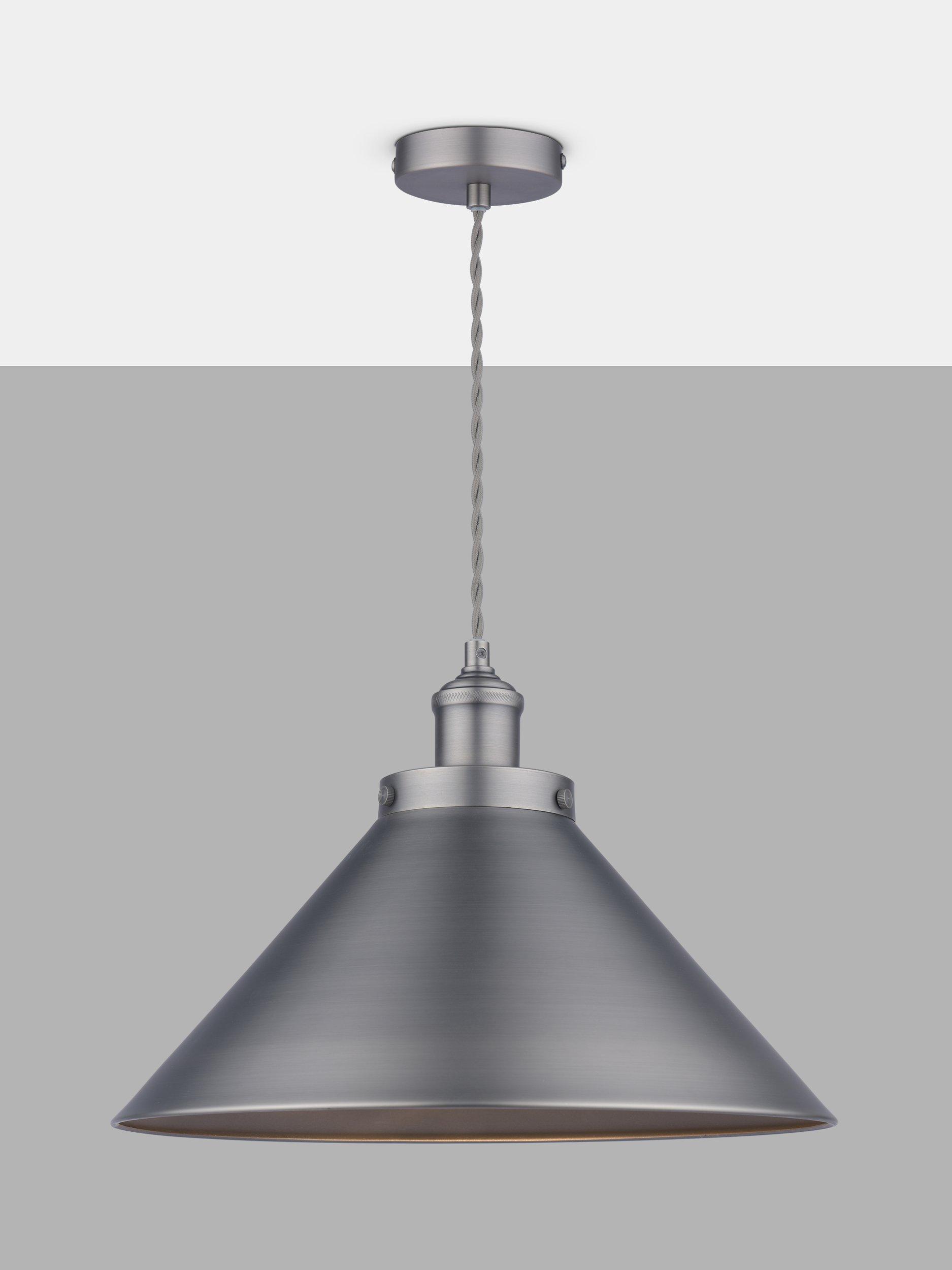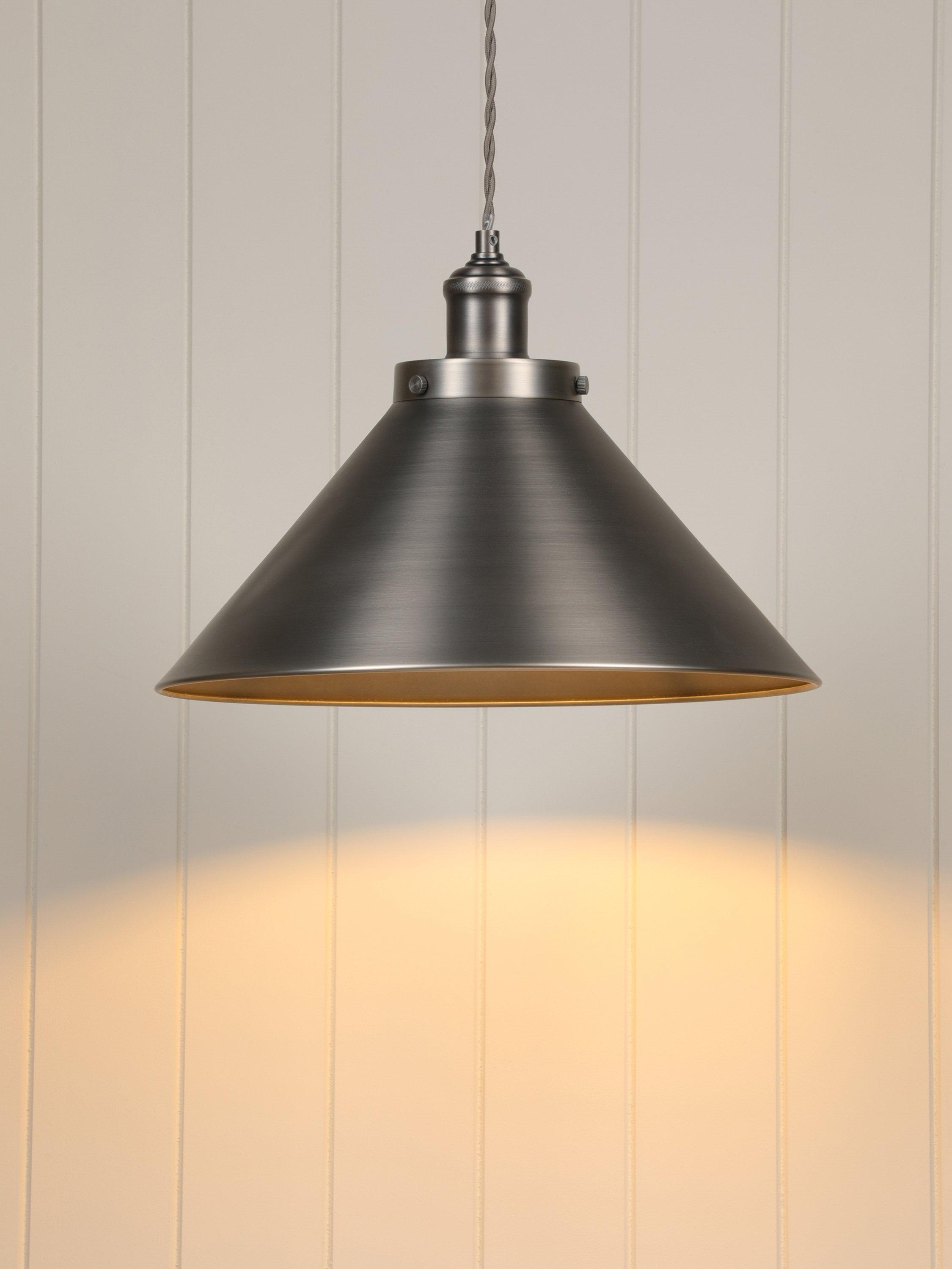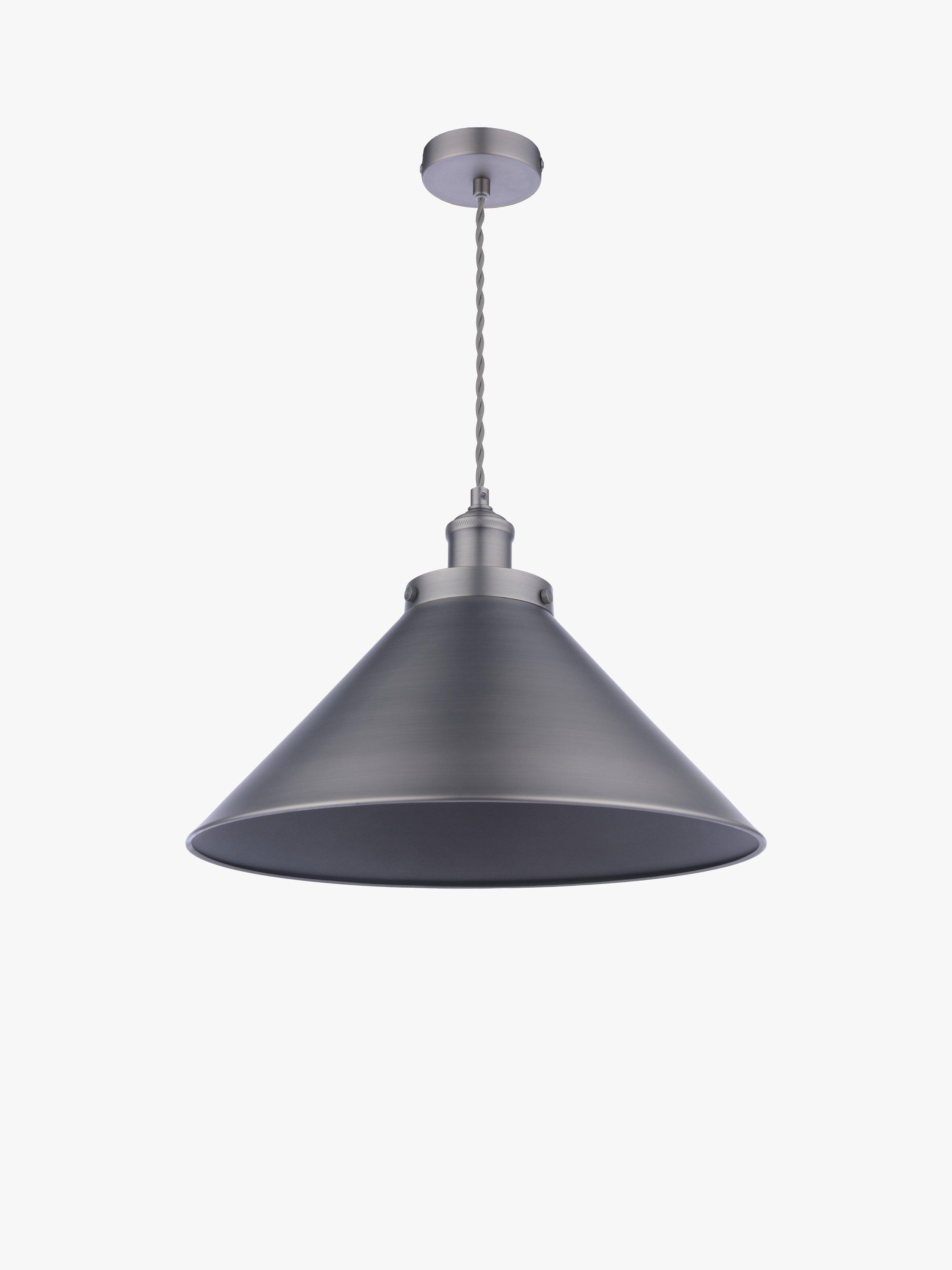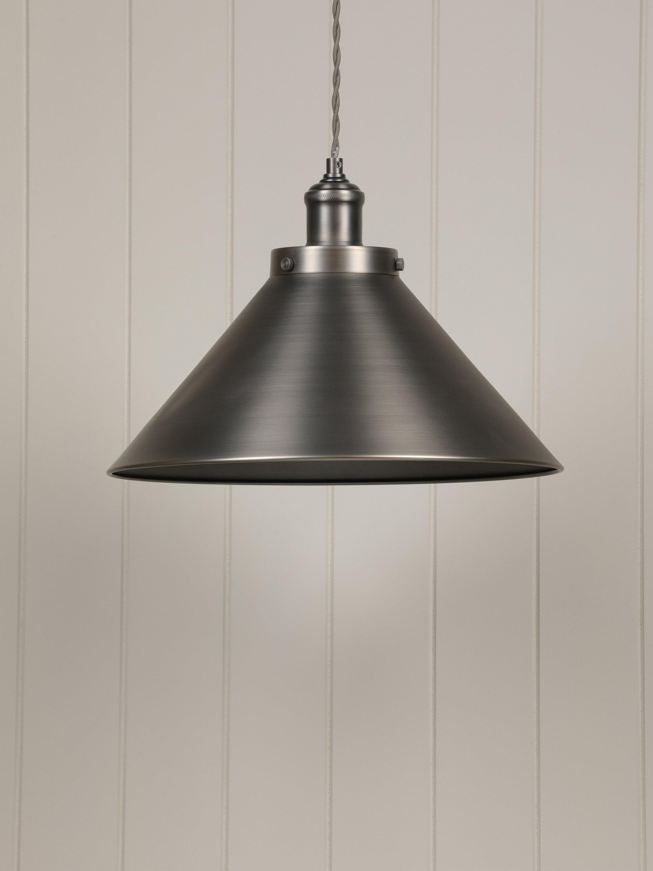 Laura Ashley’s Rufus Grande ceiling light will look superb in your kitchen or dining room, suspended over a table, or indeed above a desk in your home office area. The Rufus is a large, quality pendant with an oversized cone shade made with a neat rolled edge. The solid shade directs light downwards onto the surface below, not only creating great illumination but enhancing the atmosphere when surrounding lights are turned down. Paired with a braided fabric cord for a vintage character look. You can adjust the height to suit when it is installed therefore this ceiling light is also suitable for higher ceilings. Bulb not included.