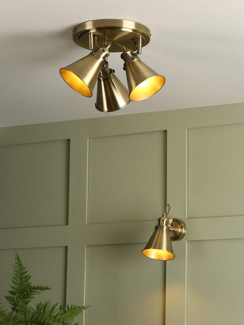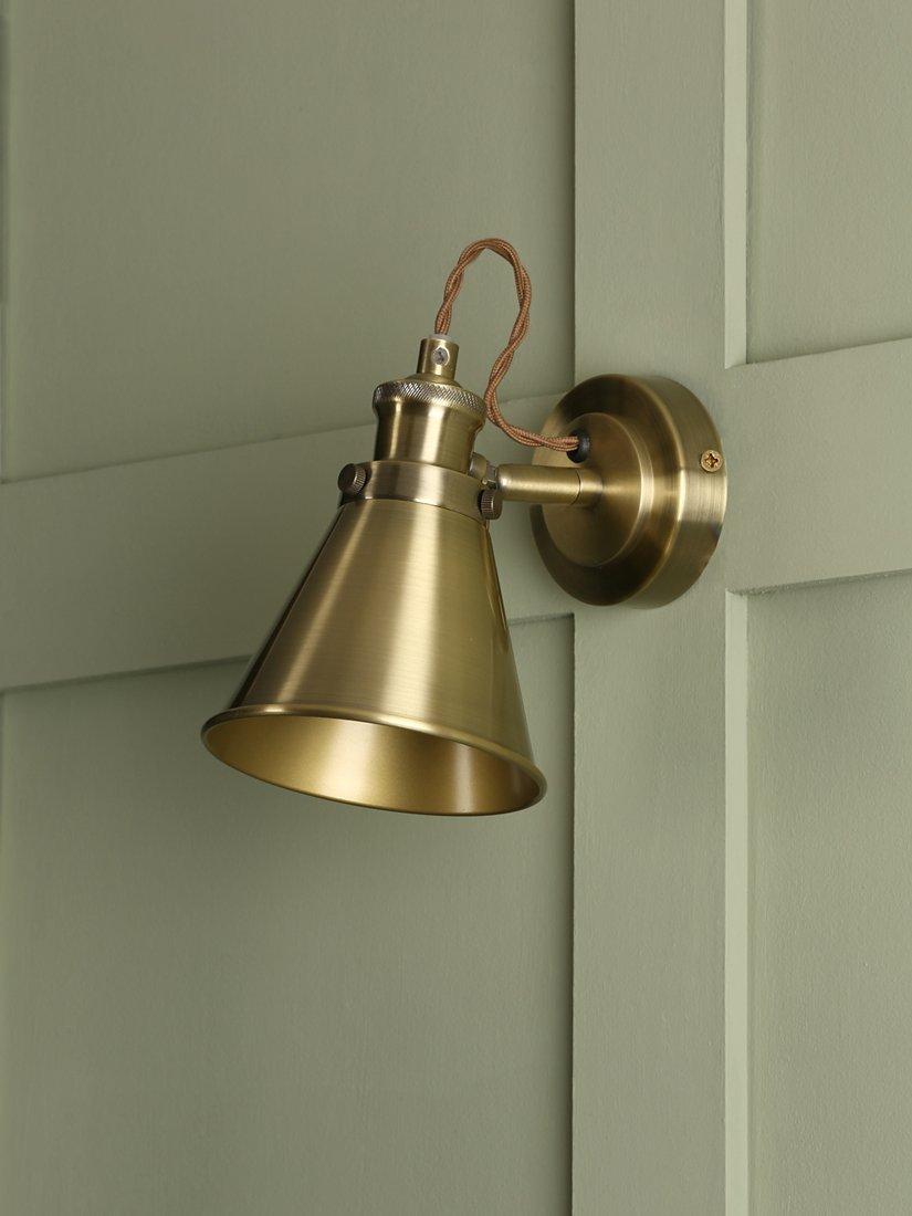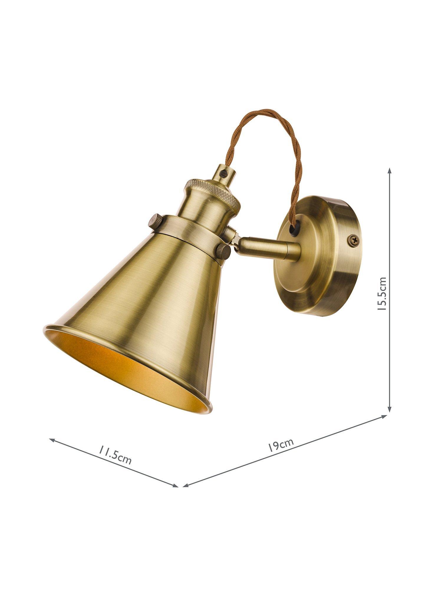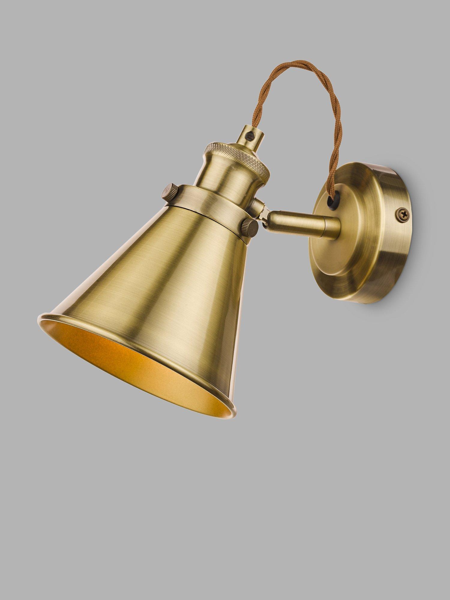 Laura Ashley’s Rufus single wall spotlight has a superior antique brass finish that will look superb in any living area. The Rufus is perfect if you're looking for a directional light to focus on a feature or illuminate a small area. This is a quality wall light with an adjustable solid cone shade made out of spun metal with a neat rolled edge, sitting on a circular wall plate. Paired with a twisted, light brown braided fabric cord for a vintage character look. Bulb not included.