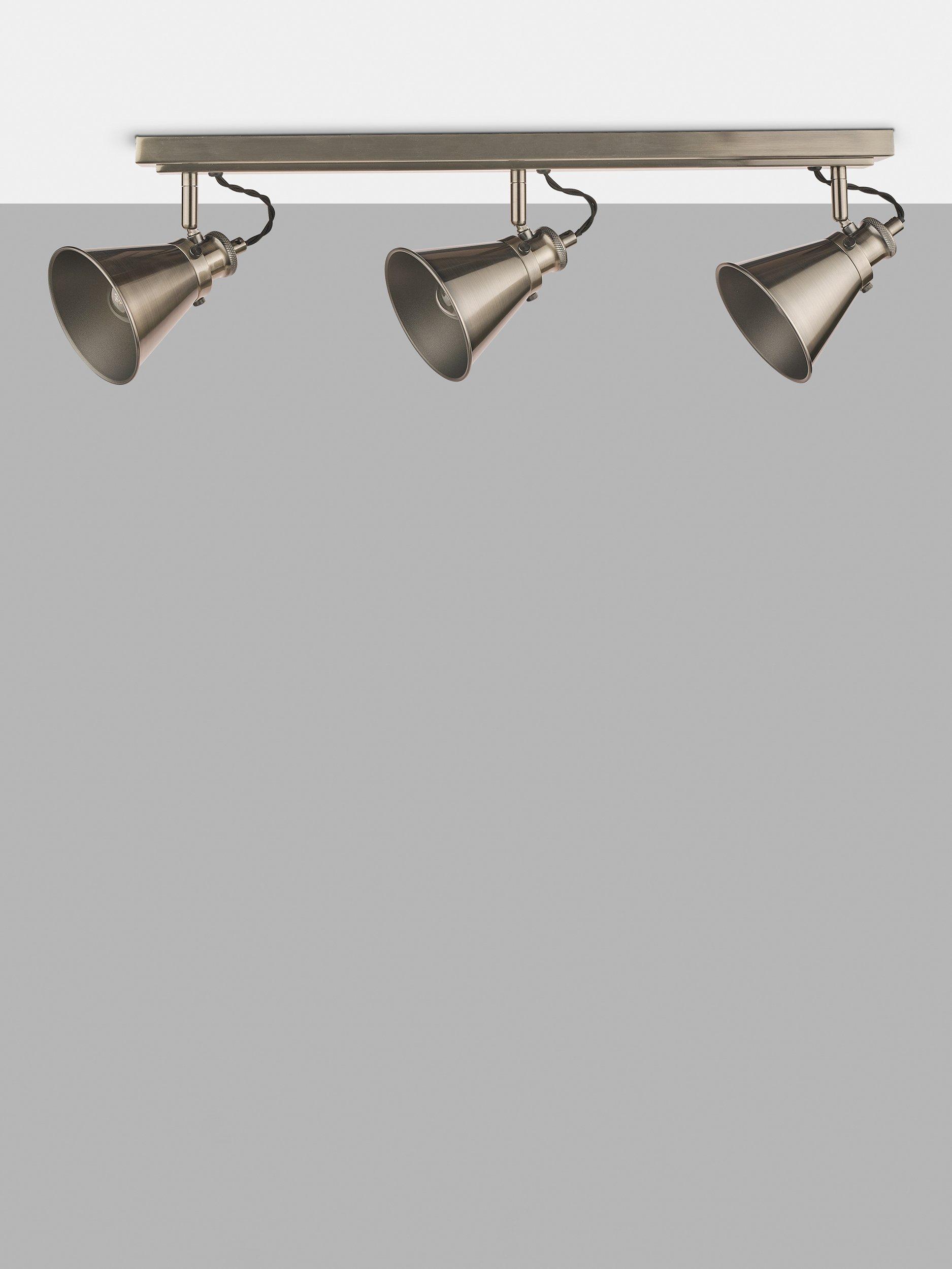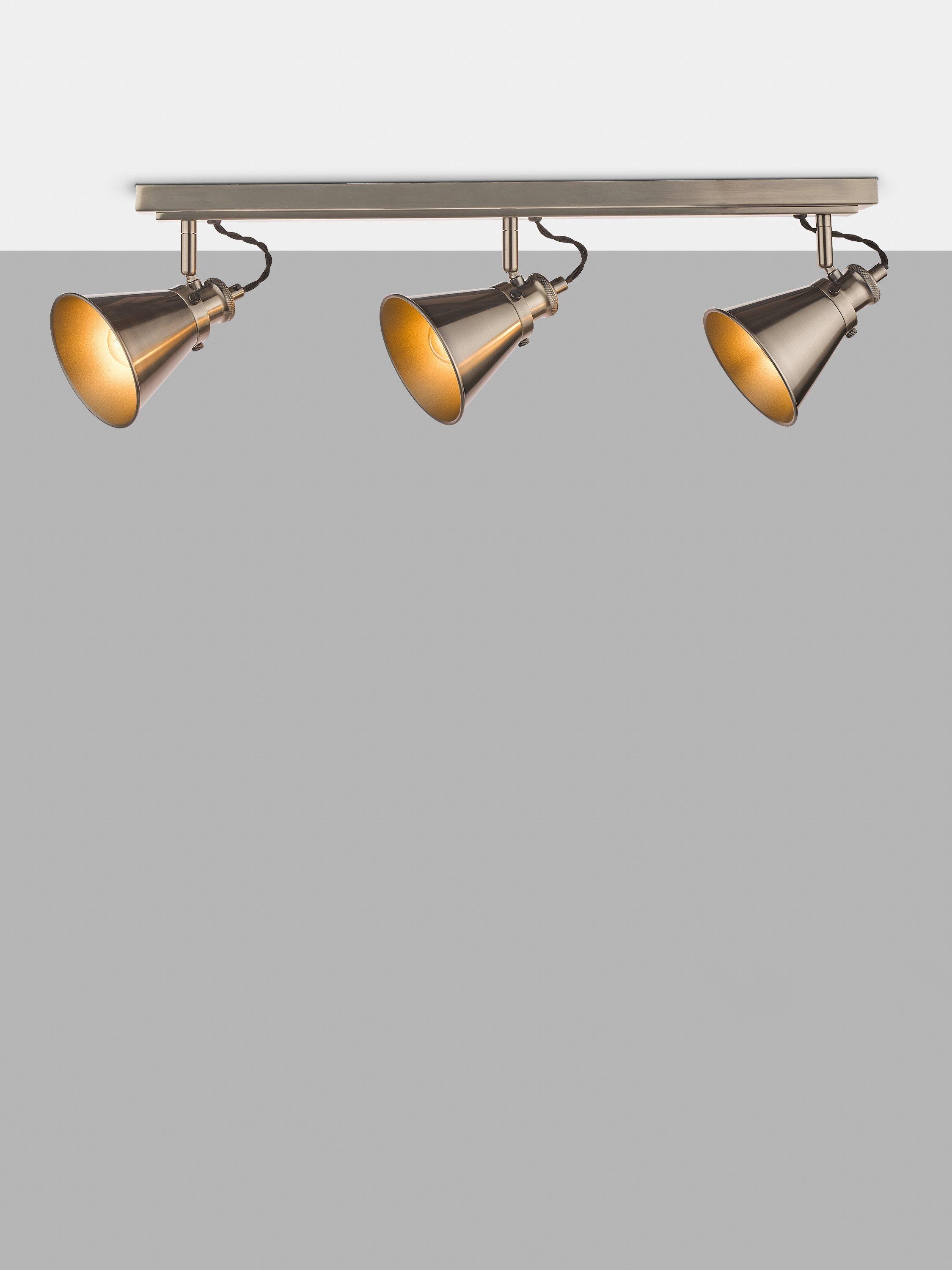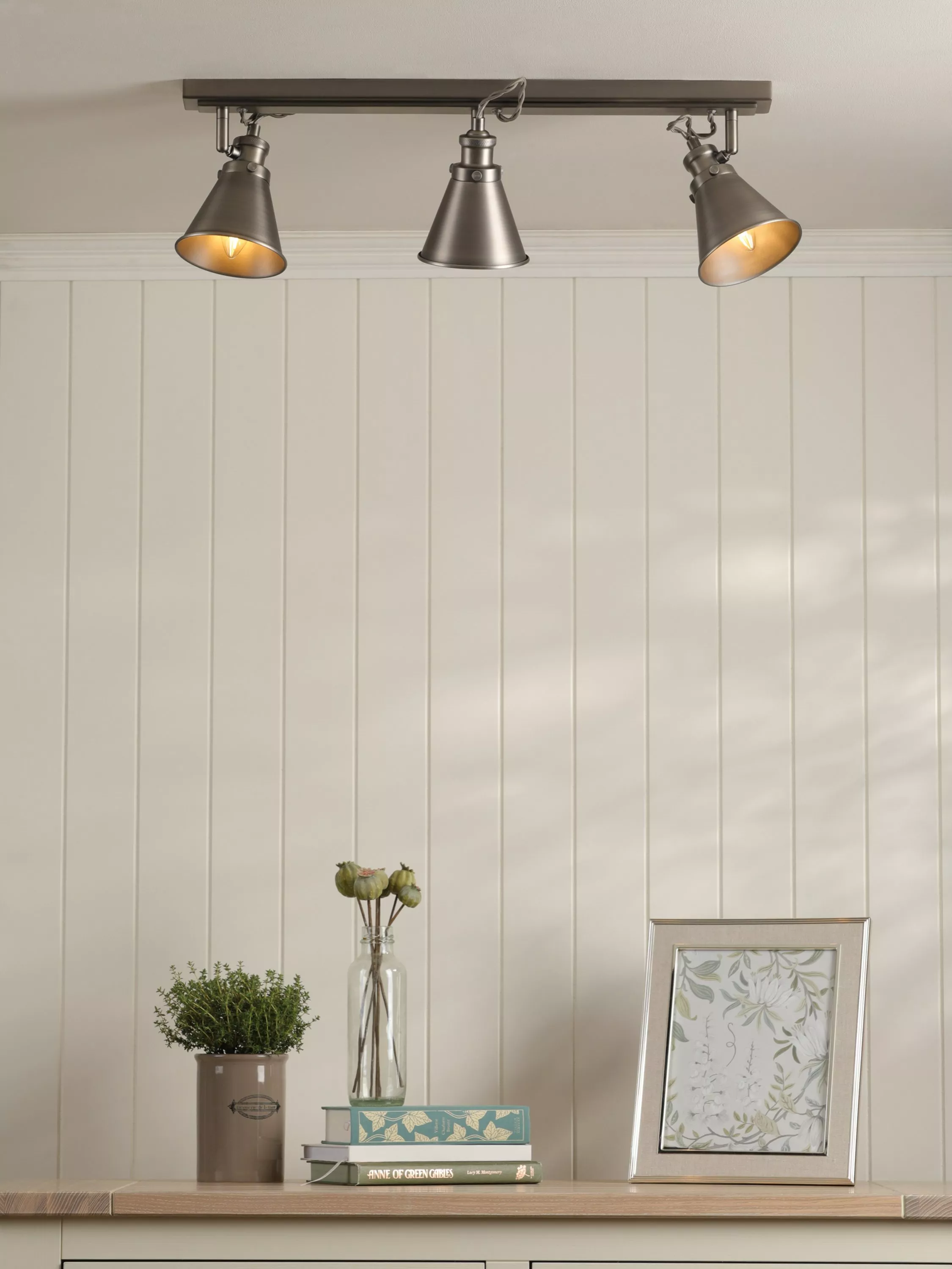 Laura Ashley’s Rufus triple bar spotlight has a superior finish that will look superb in your kitchen or dining room. Fit above your main work surface area. The Rufus is a quality ceiling light with three adjustable cone shades made with neat rolled edges sitting on a slim, rectangular ceiling plate. The solid shades can be tilted and turned to direct light exactly where you want it, creating great illumination. Paired with a braided fabric cord for a vintage character look. Bulbs not included.