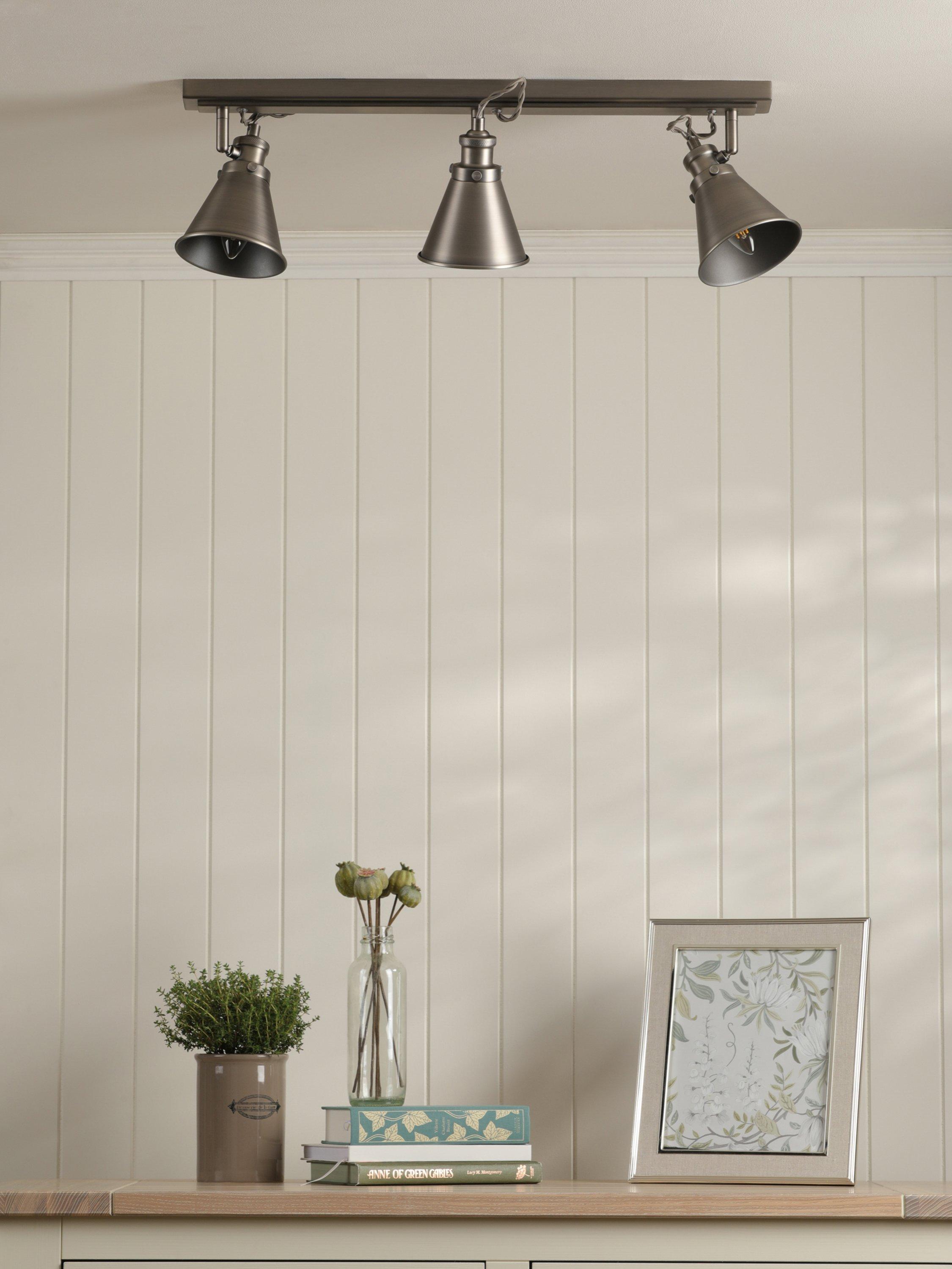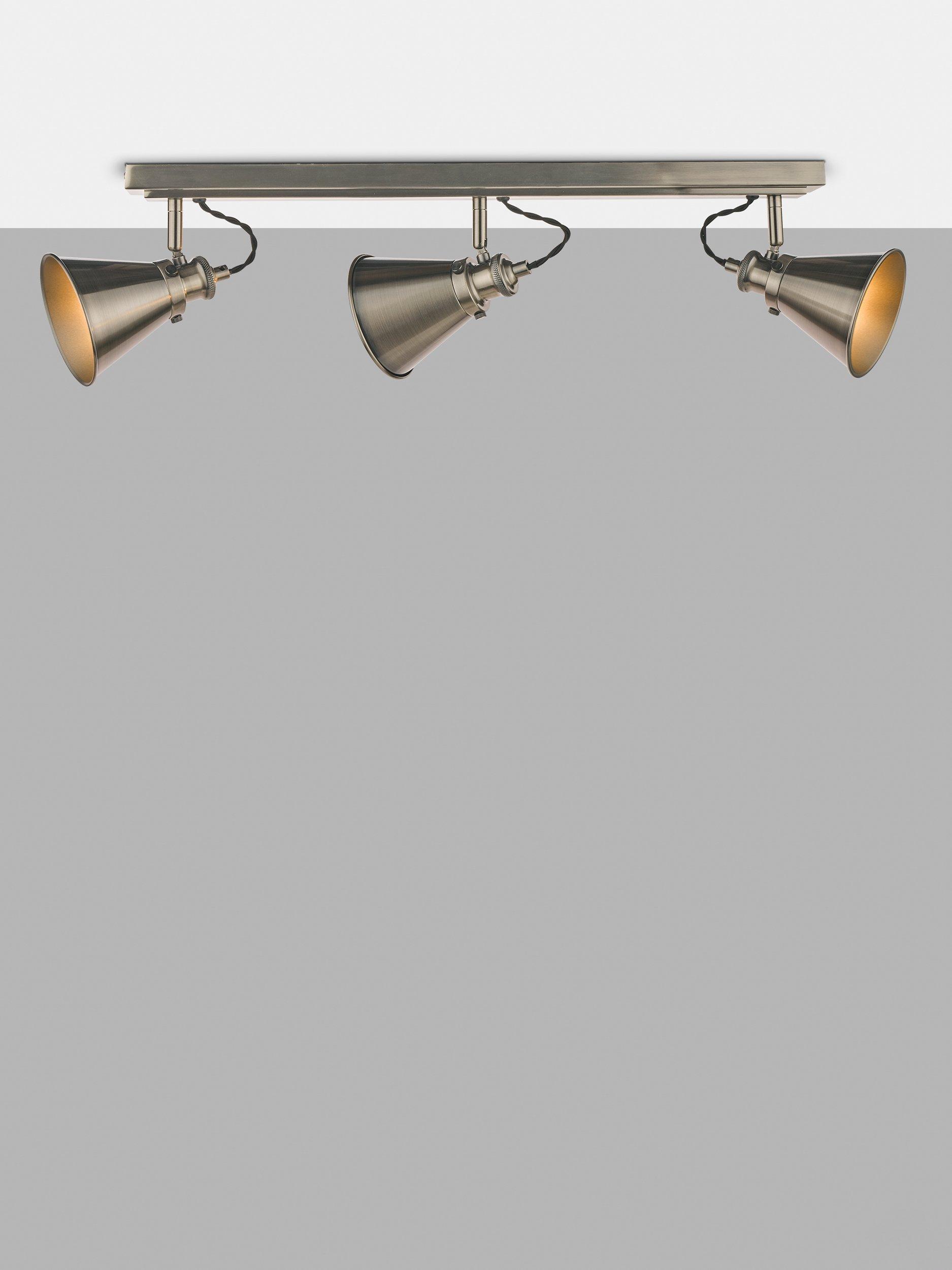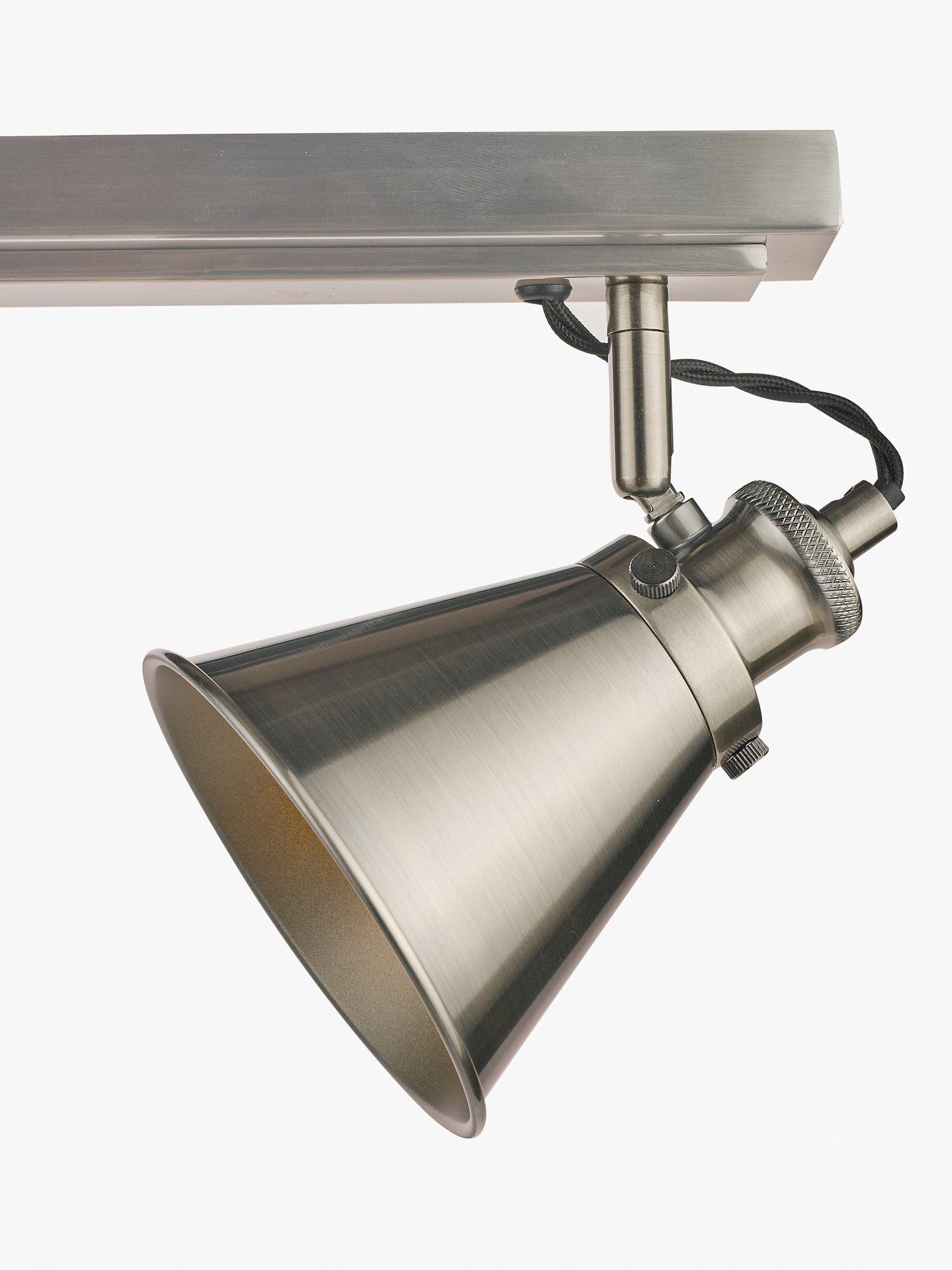 Laura Ashley’s Rufus triple bar spotlight has a superior finish that will look superb in your kitchen or dining room. Fit above your main work surface area. The Rufus is a quality ceiling light with three adjustable cone shades made with neat rolled edges sitting on a slim, rectangular ceiling plate. The solid shades can be tilted and turned to direct light exactly where you want it, creating great illumination. Paired with a braided fabric cord for a vintage character look. Bulbs not included.